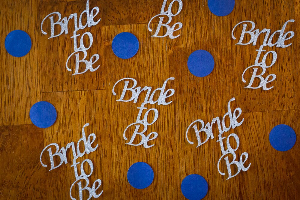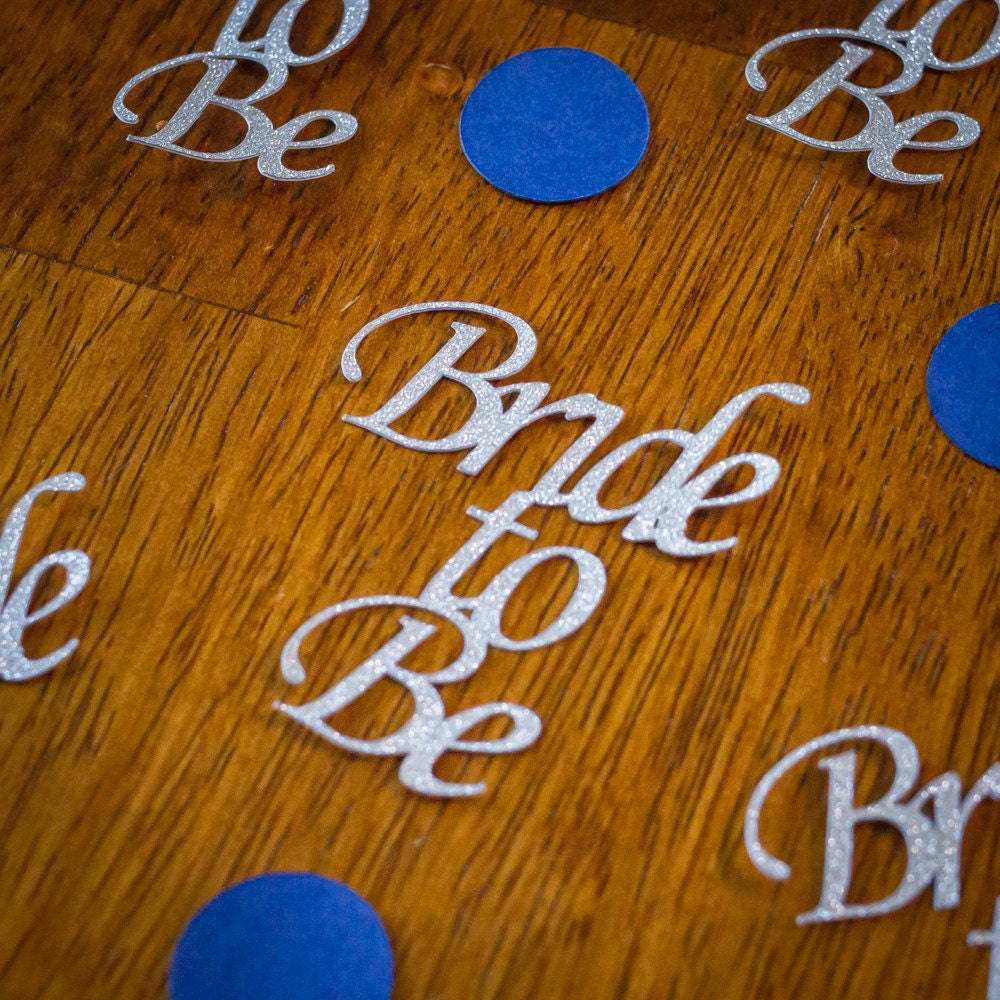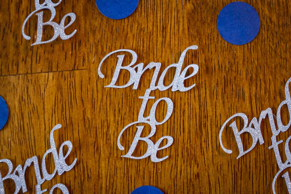 This listing is for 100 pieces of confetti! It includes 20 pieces of bride to be confetti and 80 pieces of blue circle confetti. The bride to be is made of premium silver glitter card stock and is white on the reverse side. The circles are navy blue and measure 3/4 inch.