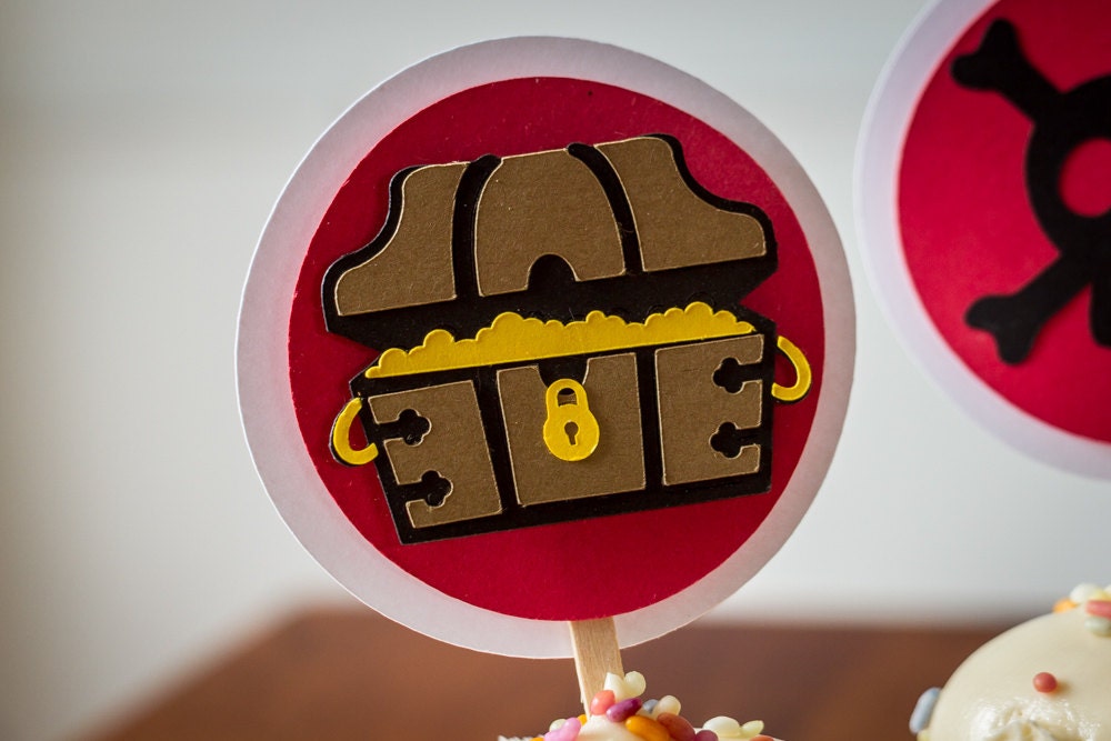 This listing is for 12 cupcake toppers. They are made of premium cardstock. You will receive 6 skull and cross bones and 6 treasure chests. The treasure chests are attached with a foam dot to create a 3D effect.