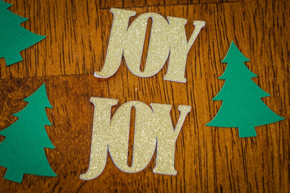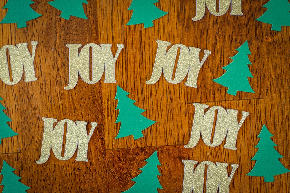 This listing is for a set of 100 pieces of confetti. It includes 25 pieces of gold glitter joy confetti. Each piece measures 1 inch high by 1.25 inches wide and they are white on the reverse side. It also includes 75 pieces of green Christmas tree confetti which measures 1 inch.