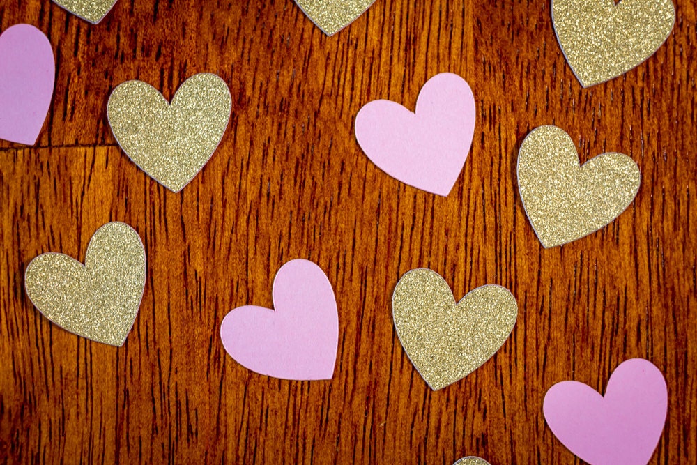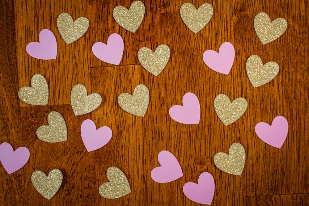 This listing is for 100 pieces of heart confetti. It includes 50 pieces of premium gold glitter card stock hearts that are white on the reverse side and 50 pieces of premium card stock pink hearts. Each heart measures approximately 3/4 inch.