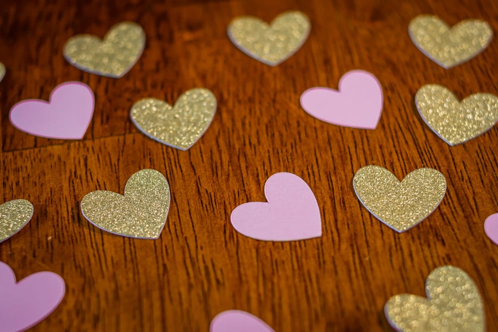 This gold glitter and pink heart confetti is perfect for an engagement party, bridal shower, wedding, or birthday! It will add a touch of sparkle to your tables!