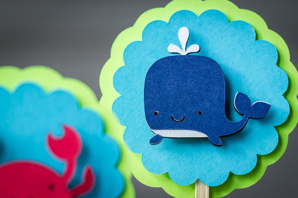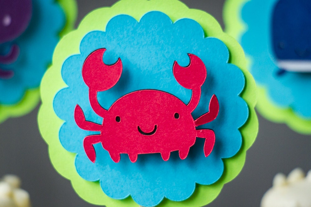 This listing is for 12 cupcake toppers. You will receive 4 of each animal including crab, whale, and octopus. Each topper measures approximately 2.4 inches in diameter and is attached to a bamboo skewer. The animals are attached with a foam dot to create a 3D effect.