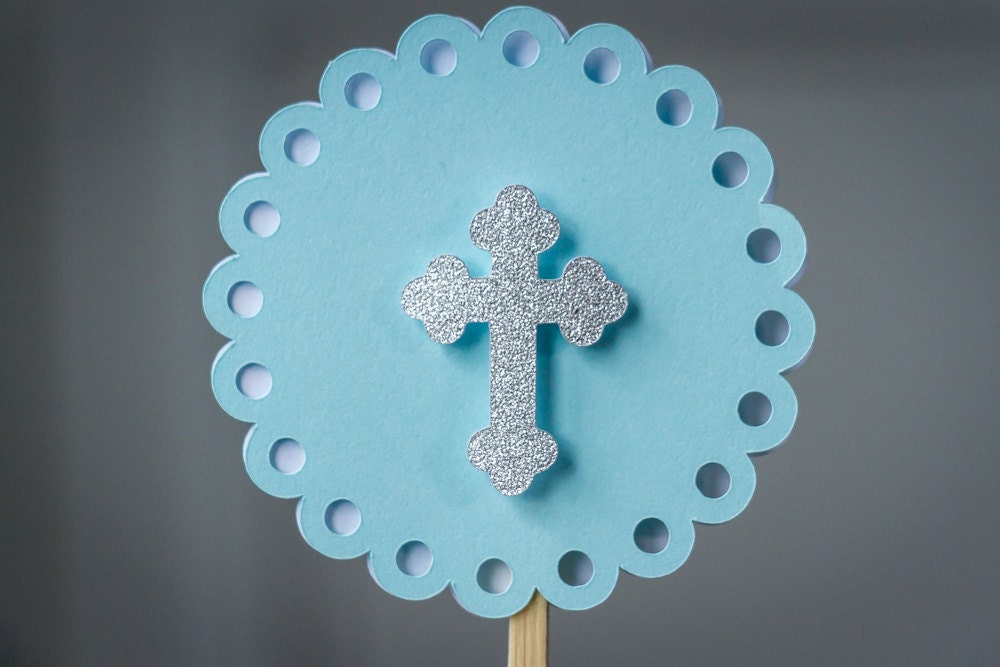 This listing is for a set of 12 toppers made of premium cardstock. They measure approximately 2.4 inches in diameter and are on a bamboo skewer. The silver glitter cross is attached with a foam dot to create a 3D effect.