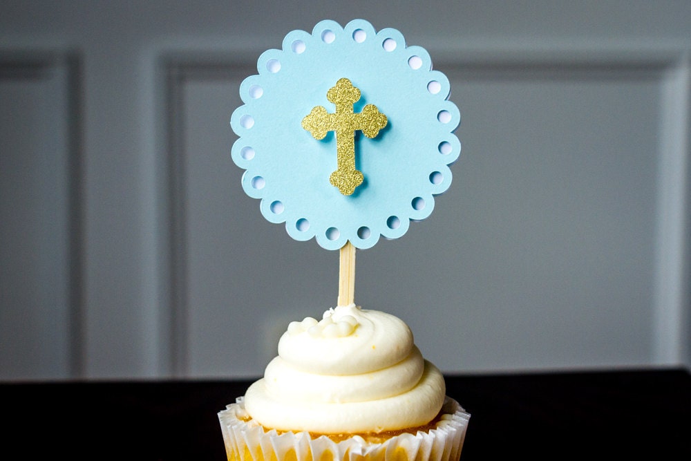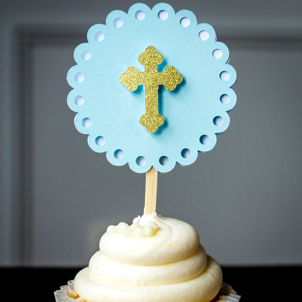 This listing is for a set of 12 cupcake toppers! They are made of premium card stock and measure approximately 2.4 inches in diameter. The crosses are attached with a foam dot to create a 3D effect. The toppers have a bamboo skewer.
