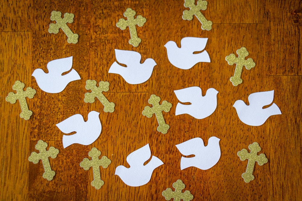 This listing is for a package of 100 pieces of confetti! It includes 30 pieces of glitter gold cross confetti and 70 white doves. All pieces are made of premium card stock. The doves measure 1.5 inches. The crosses are made of premium glitter gold card stock and white on the reverse side. They measure 1.25 inches tall.