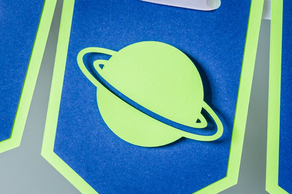 The banner is made of premium card stock and measures approximately 6 feet in length. The pennants are approximately 5 inches in length and they are attached with a white satin ribbon. The rockets and planet are attached with a foam dot to create a 3 D effect.
