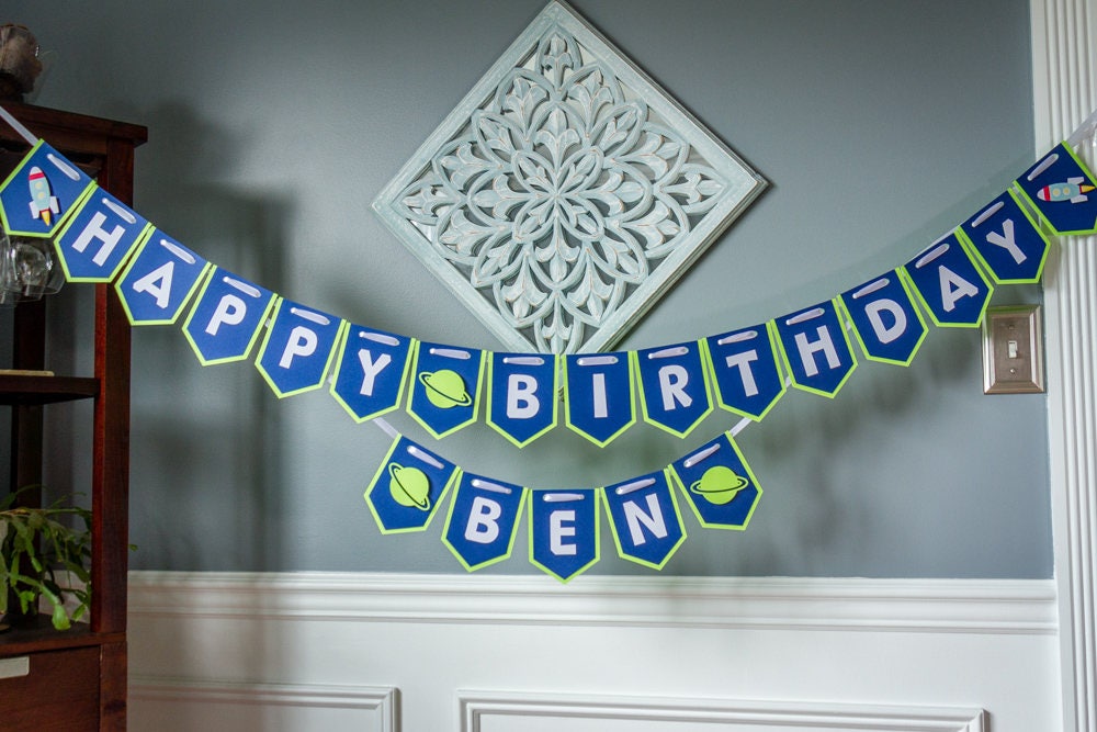 There is an option to have this banner personalized. When adding the name banner the name will appear on a separate banner with a planet on each end. Please be sure to write the name you would like in the note to seller section when checking out!