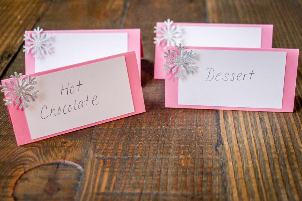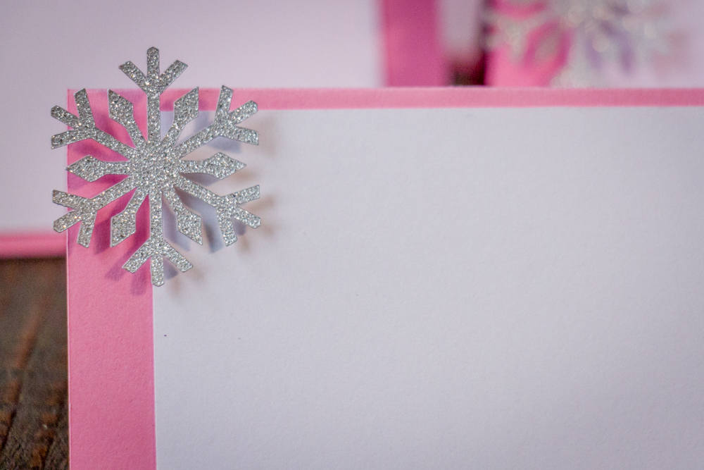 The cards are made of premium cardstock and measure approximately 2 inches in width by 1 inch in height. The back of the cards are pink and there is a white section on the front for you to add your guests names or food. The silver glitter snowflake is attached with a foam dot to create a 3D effect.