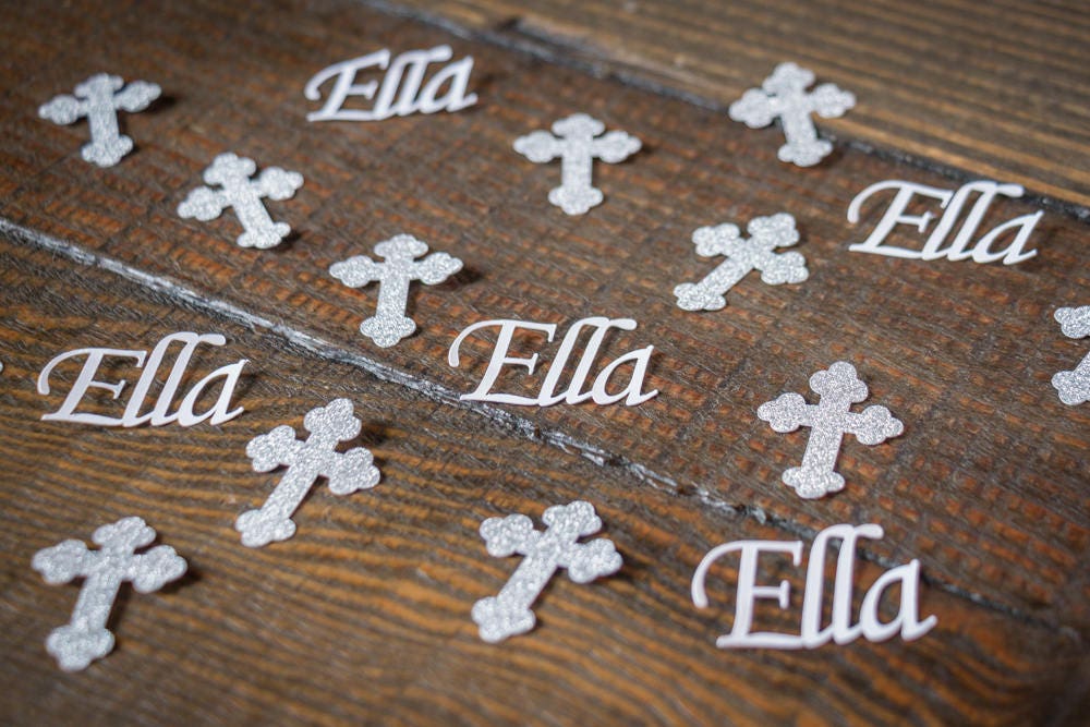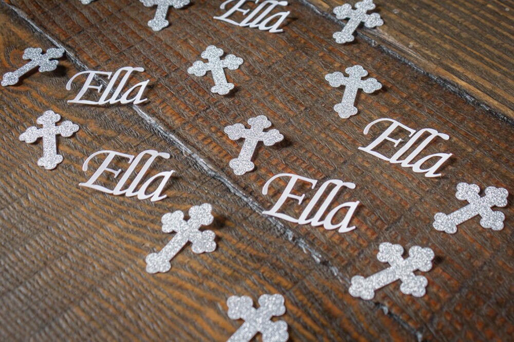 This listing is for 100 pieces of confetti. It includes 75 pieces of silver glitter cross confetti and 25 pieces of name confetti. The crosses are made of premium silver glitter cardstock and are white on the reverse side. They measure approximately 1.25 inches tall. The name confetti is made of premium white cardstock and the size varies based on the length of the name.