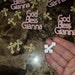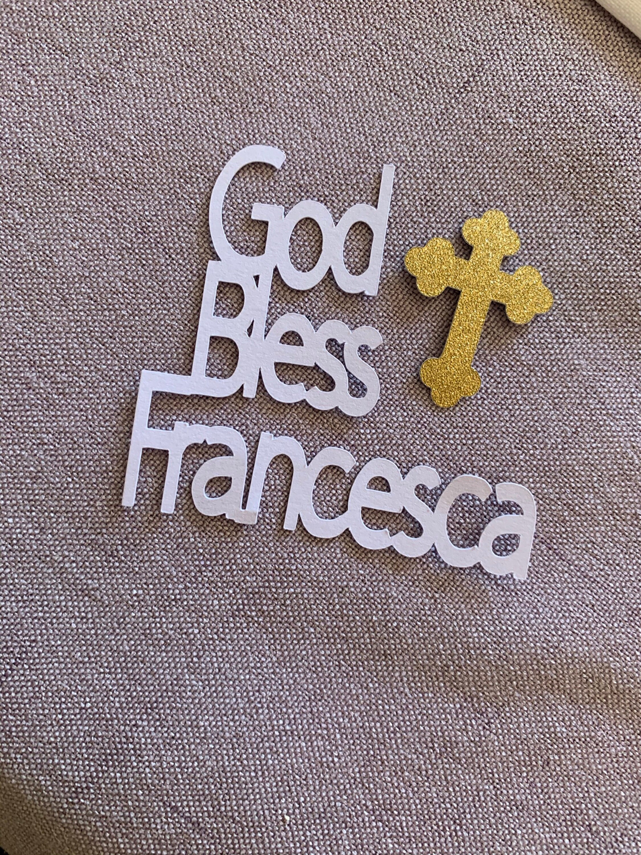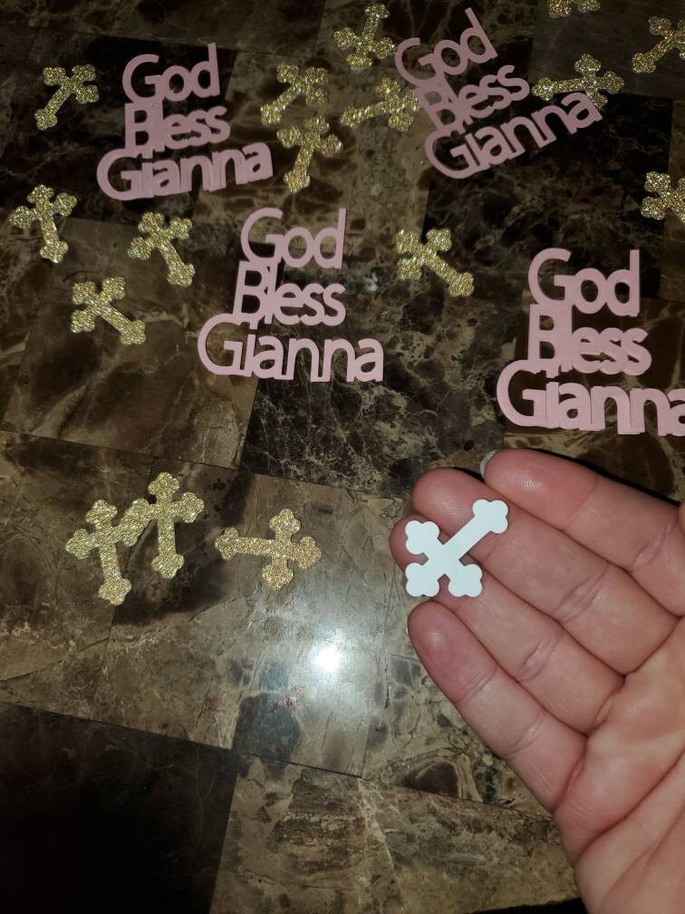 This listing is for 50 pieces of confetti. It includes 20 pieces of personalized God Bless Confetti and 30 pieces of gold cross confetti. The God Bless confetti is made of premium cardstock and measures approximately 2 inches in height. The width will vary based on the name. The crosses are made of gold glitter cardstock that are white on the reverse side and they measure approximately 1.25 inches in height.