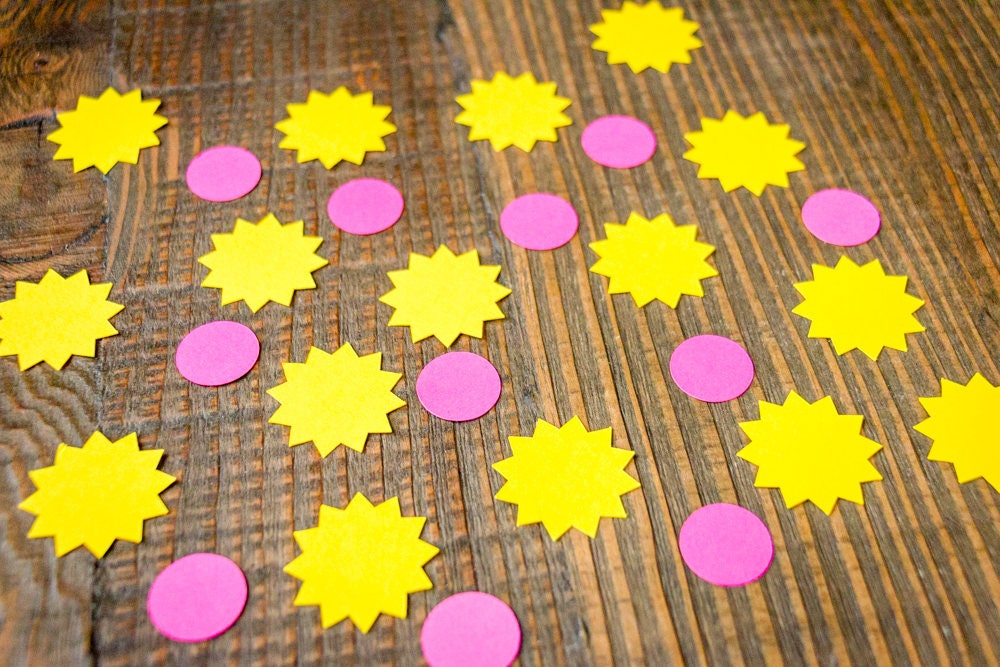 This listing is for a package of 100 pieces of confetti! It includes 40 pieces of yellow sun confetti and 60 pieces of pink circle confetti. The sun confetti measures approximately 1.25 inches and the circles measure .75 inches.