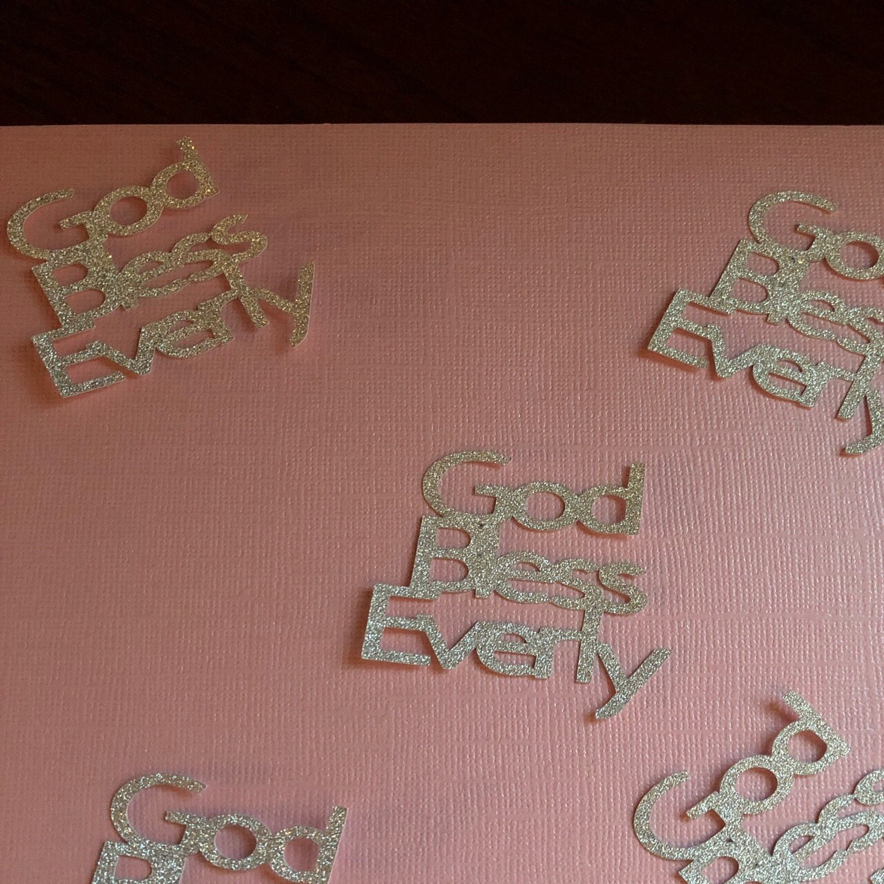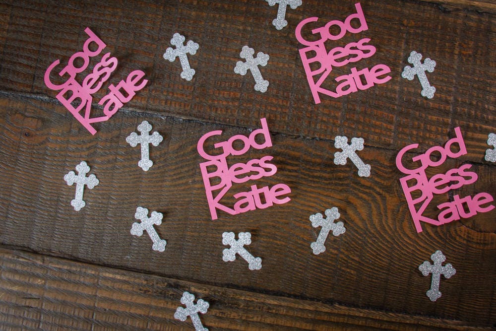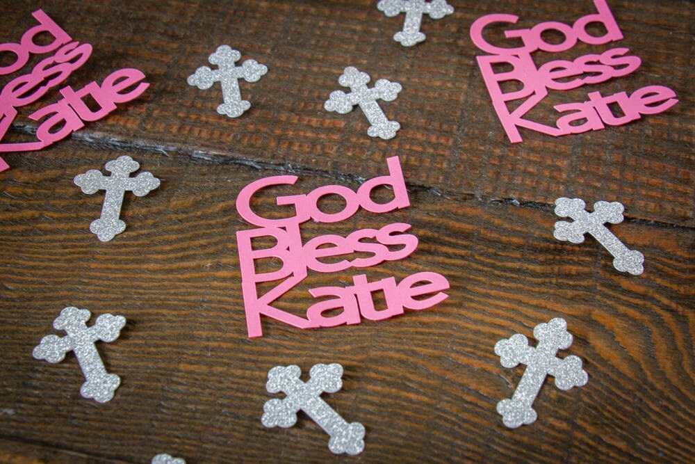 This listing is for 50 pieces of confetti. It includes 20 pieces of personalized God Bless Confetti and 30 pieces of silver cross confetti. The God Bless confetti is made of premium cardstock and measures approximately 2 inches in height. The width will vary based on the name. The crosses are made of silver glitter cardstock that are white on the reverse side and they measure approximately 1.25 inches in height.