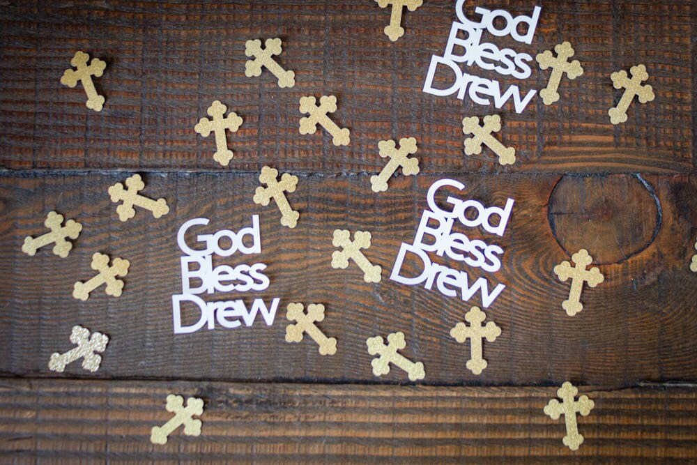This listing is for 50 pieces of confetti. It includes 20 pieces of personalized God Bless Confetti and 30 pieces of gold cross confetti. The God Bless confetti is made of premium cardstock and measures approximately 2 inches in height. The width will vary based on the name. The crosses are made of gold glitter cardstock that are white on the reverse side and they measure approximately 1.25 inches in height.