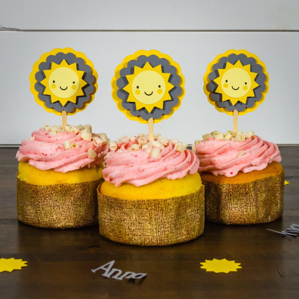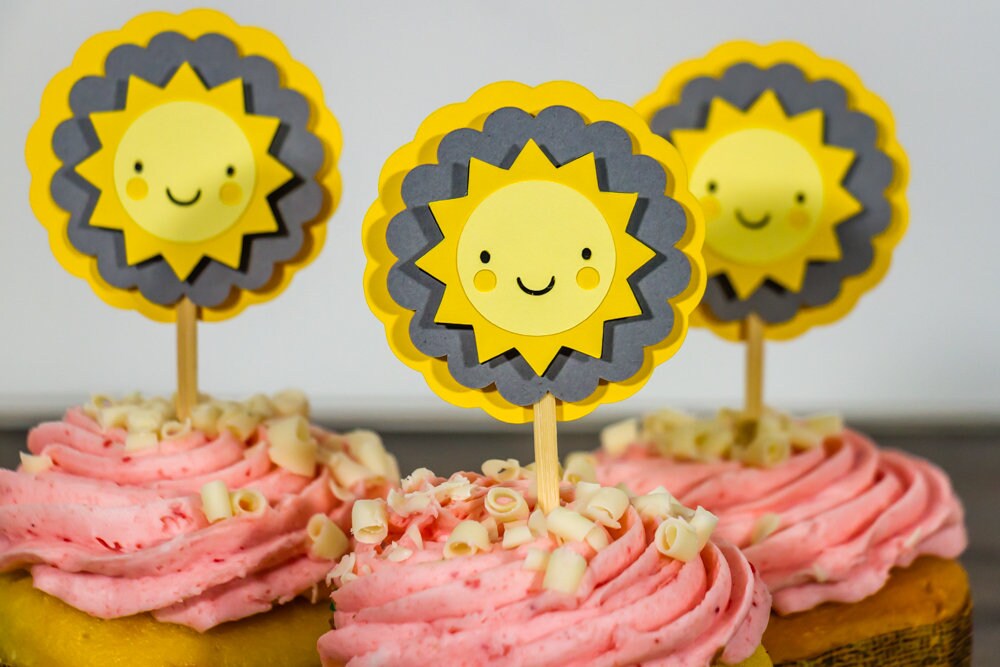 This listing is for a set of 12 cupcake toppers! They are yellow and gray and made of premium cardstock. They measure approximately 2.5 inches in diameter and are attached to a bamboo skewer. The sun is attached with a foam dot to create a 3D effect!