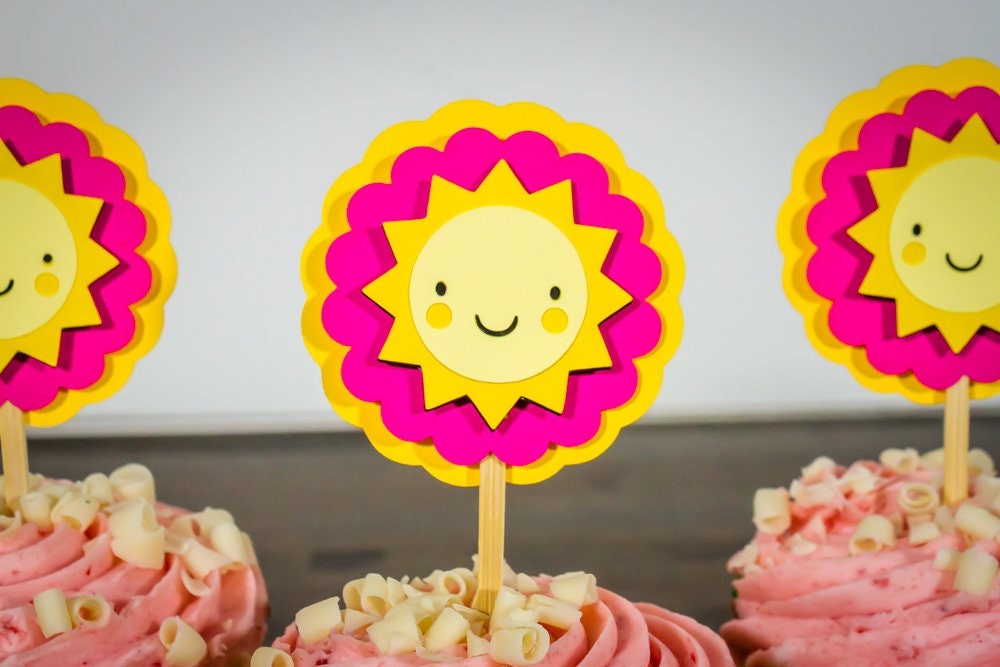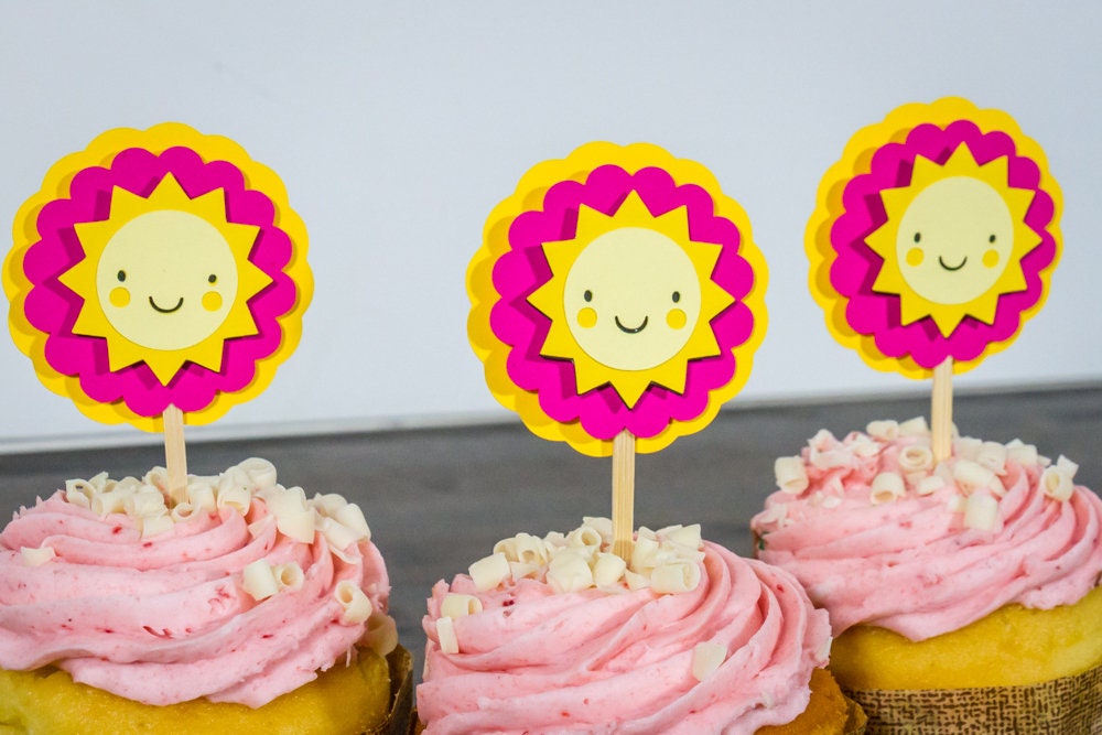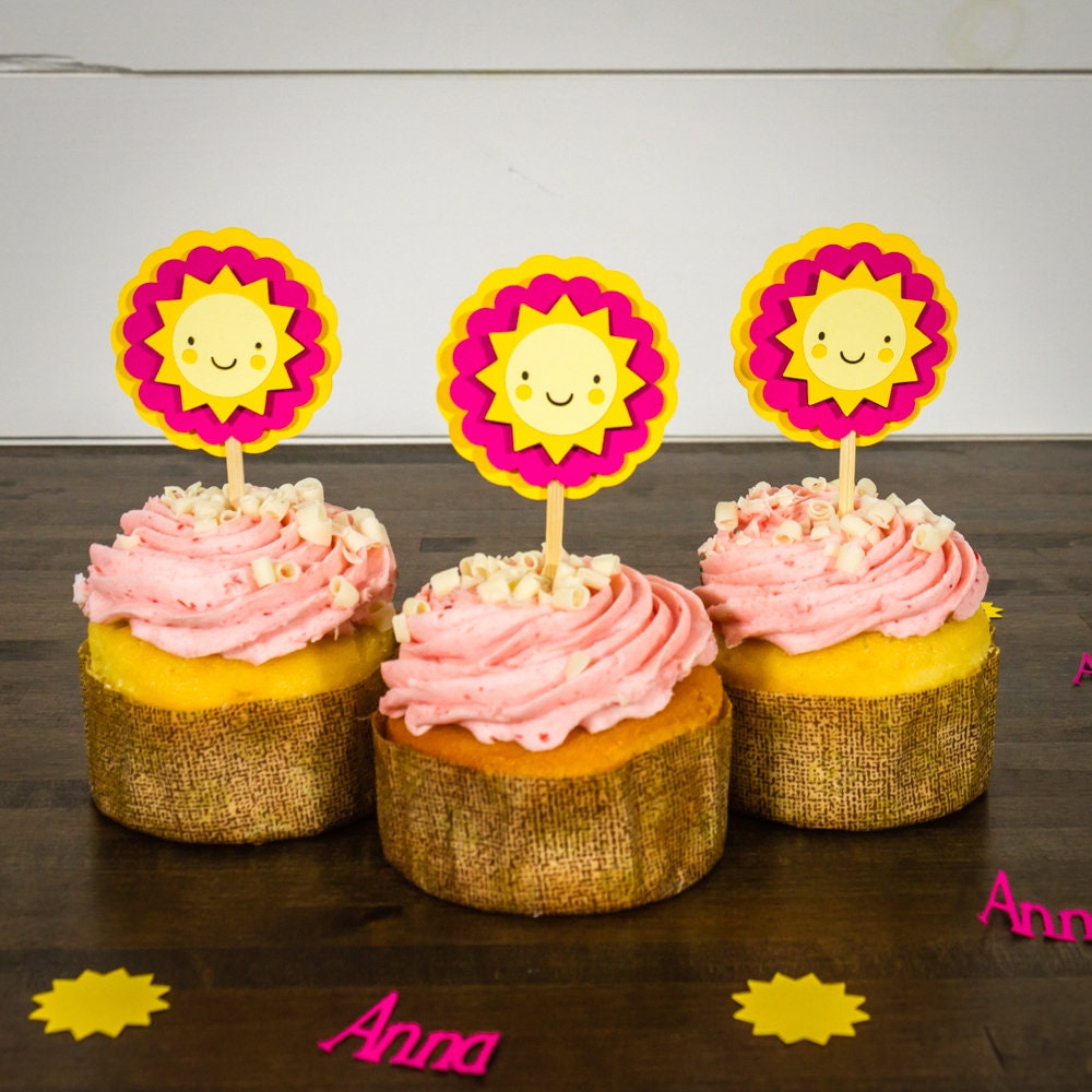 This listing is for a set of 12 cupcake toppers! They are made of premium card stock and measure approximately 2.5 inches in diameter. They are attached to a food safe bamboo skewer. The suns are attached with a foam dot to create a 3D effect!