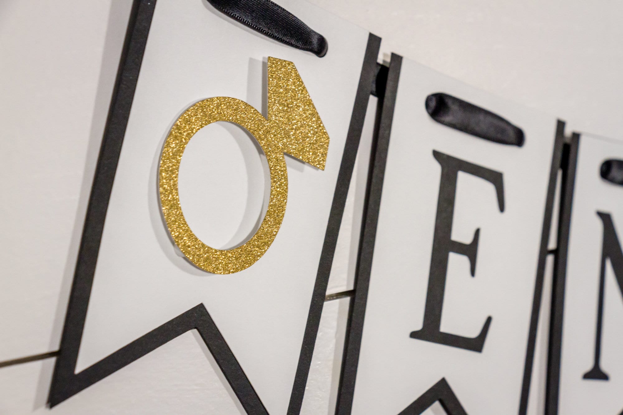 This banner is made from premium card stock and measures approximately 5 inches in height. The pennant pieces are thread with a black satin ribbon. The rings are attached with foam dots to provide a 3D effect.