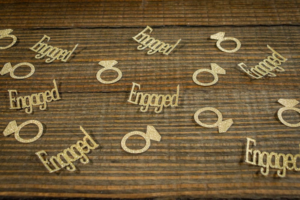 This listing is for a package of 75 pieces of confetti! It includes 25 pieces of engaged confetti made of premium gold glitter card stock that is white on the reverse side and measures approximately 1.75 inches in length and 50 pieces of gold glitter ring confetti which is white on the reverse side.
