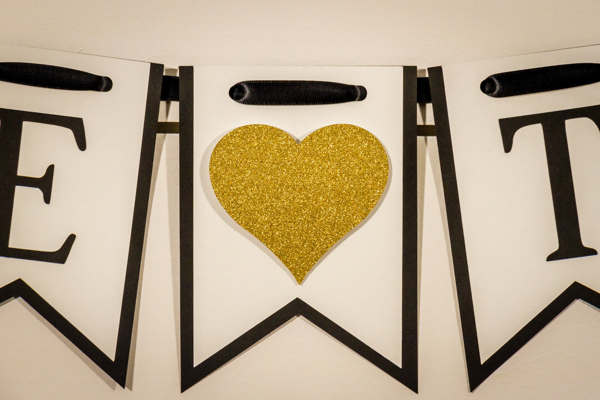 This banner is made form premium card stock and each pennant is approximately 5 inches in height. The pennant pieces are attached with black satin ribbon that is looped at the ends to allow for easy hanging. The hearts are attached with foam dots to create a 3D effect!