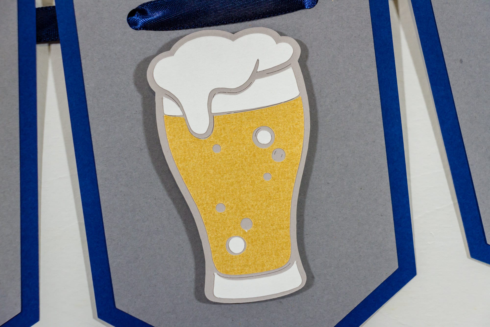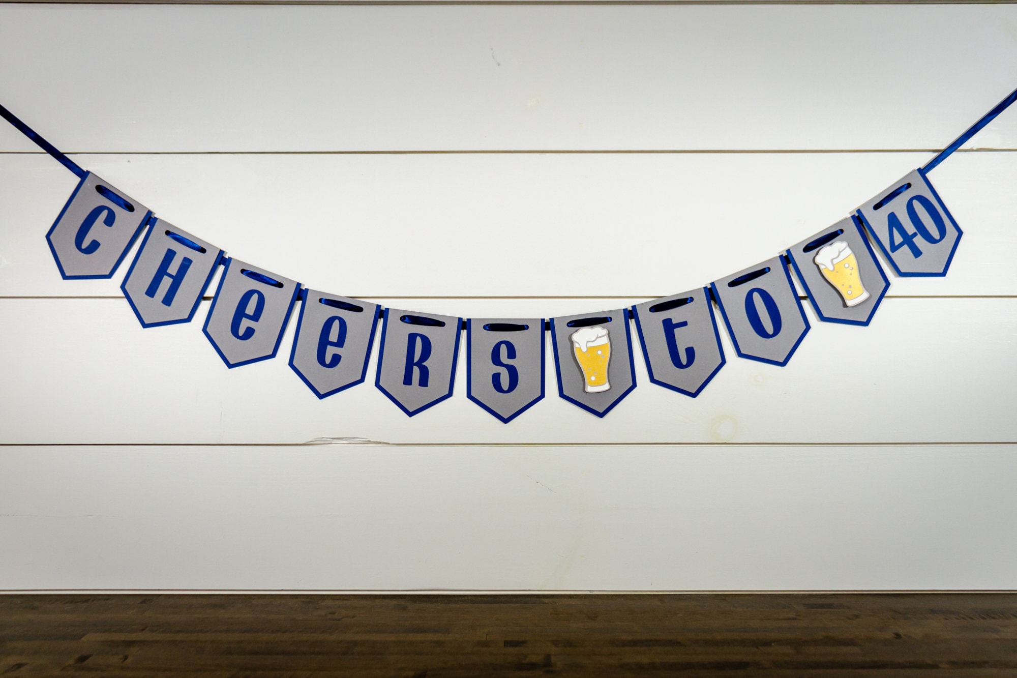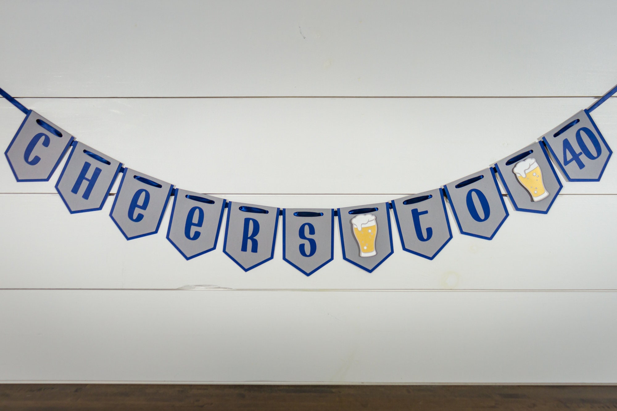 This listing is for one Cheers to 40 banner. The banner is made of premium cardstock and each pennant measures approximately 5 inches in height. The pint glasses are attached with a foam dot to create a 3D effect. The banner pennants are attached with a navy satin ribbon.