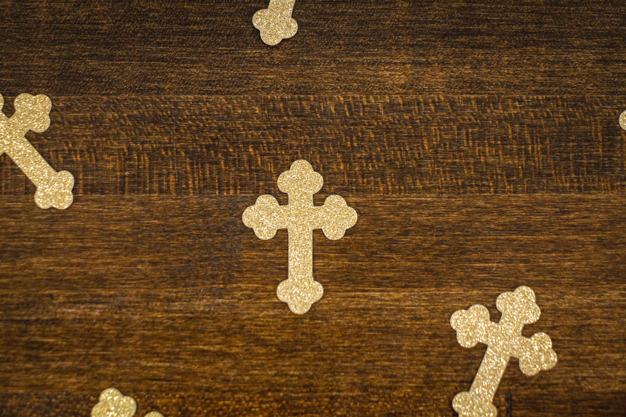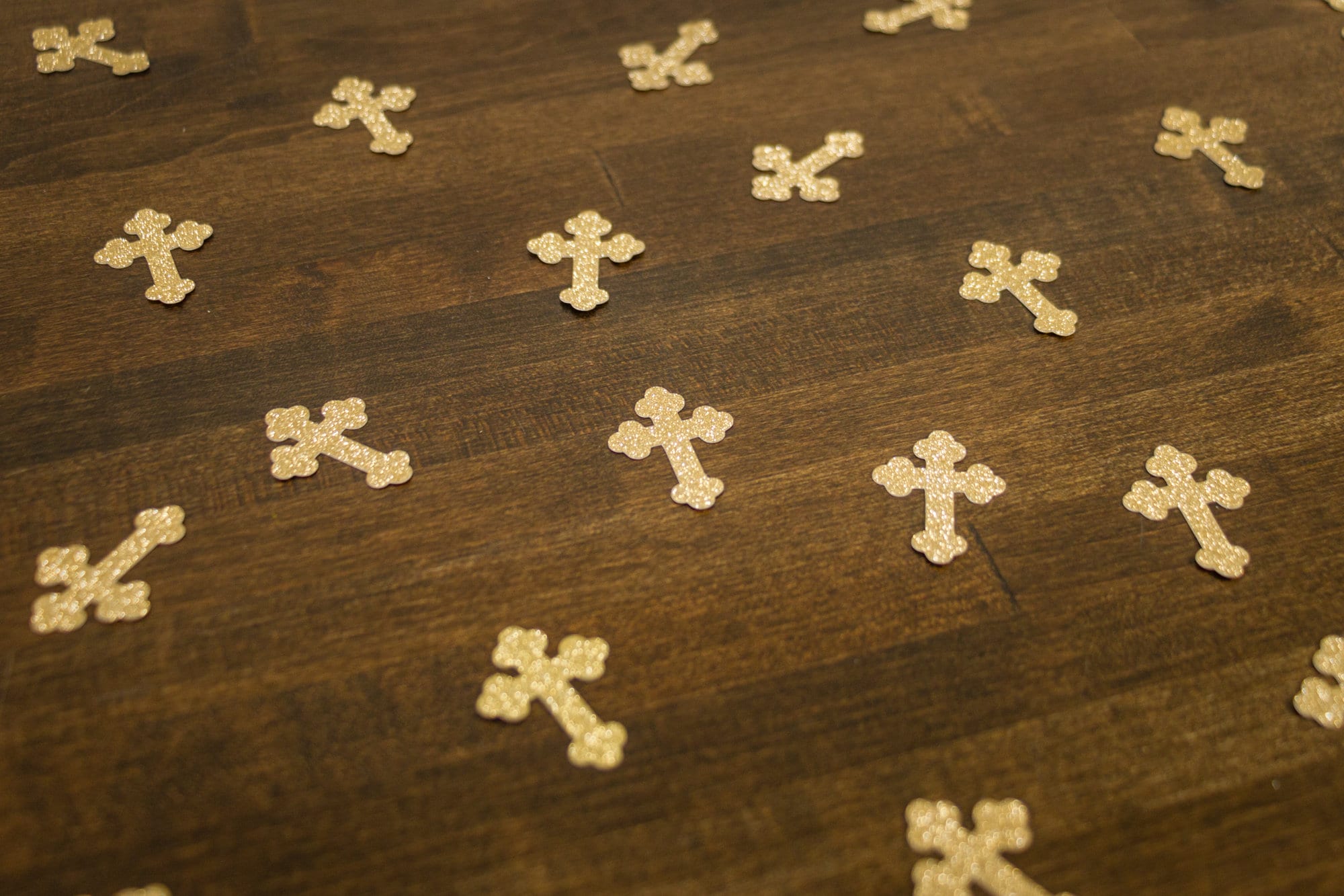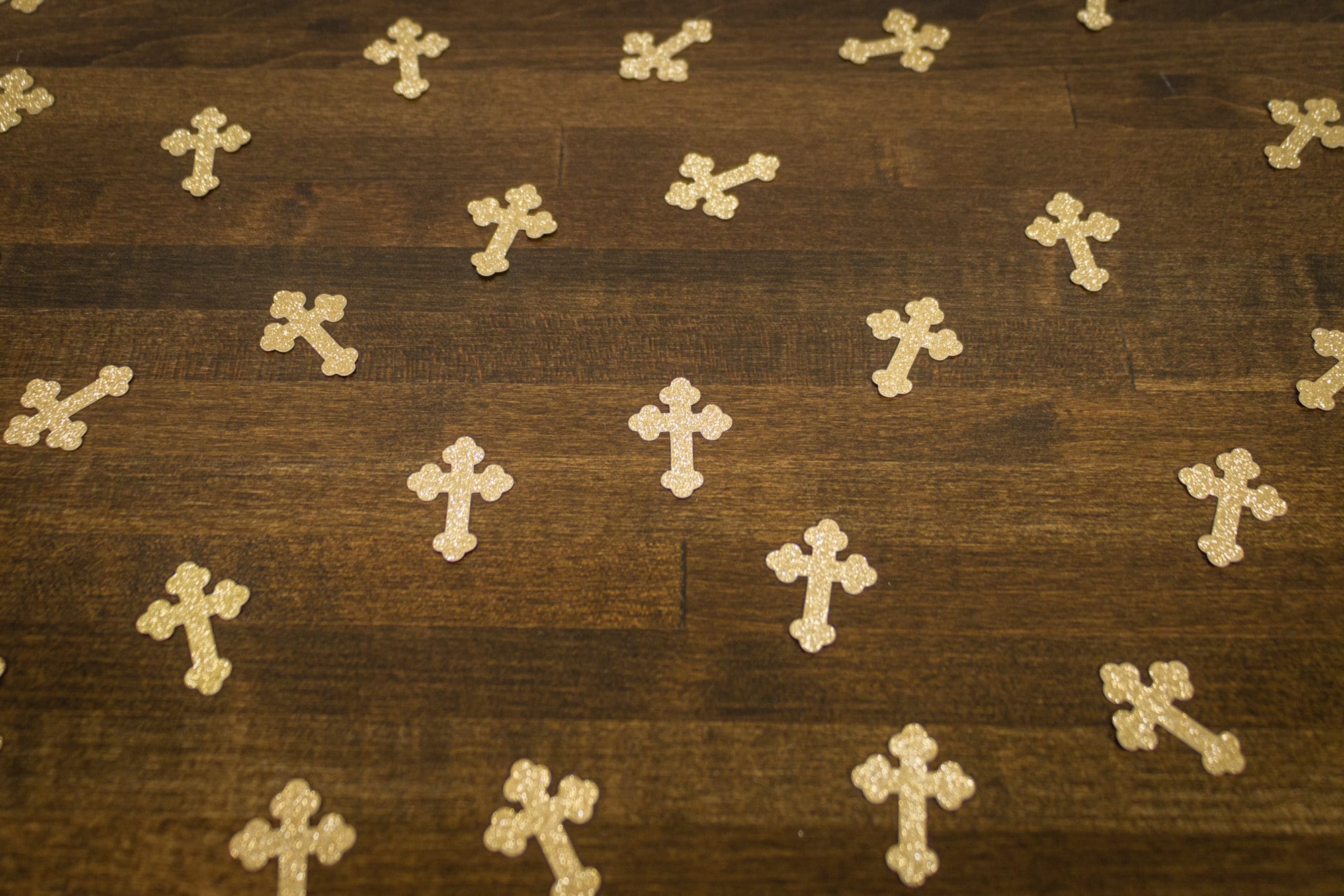 This listing is for 100 pieces of confetti! The crosses are made of gold glitter card stock and measure approximately 1.25 inches tall. They are white on the reverse side.