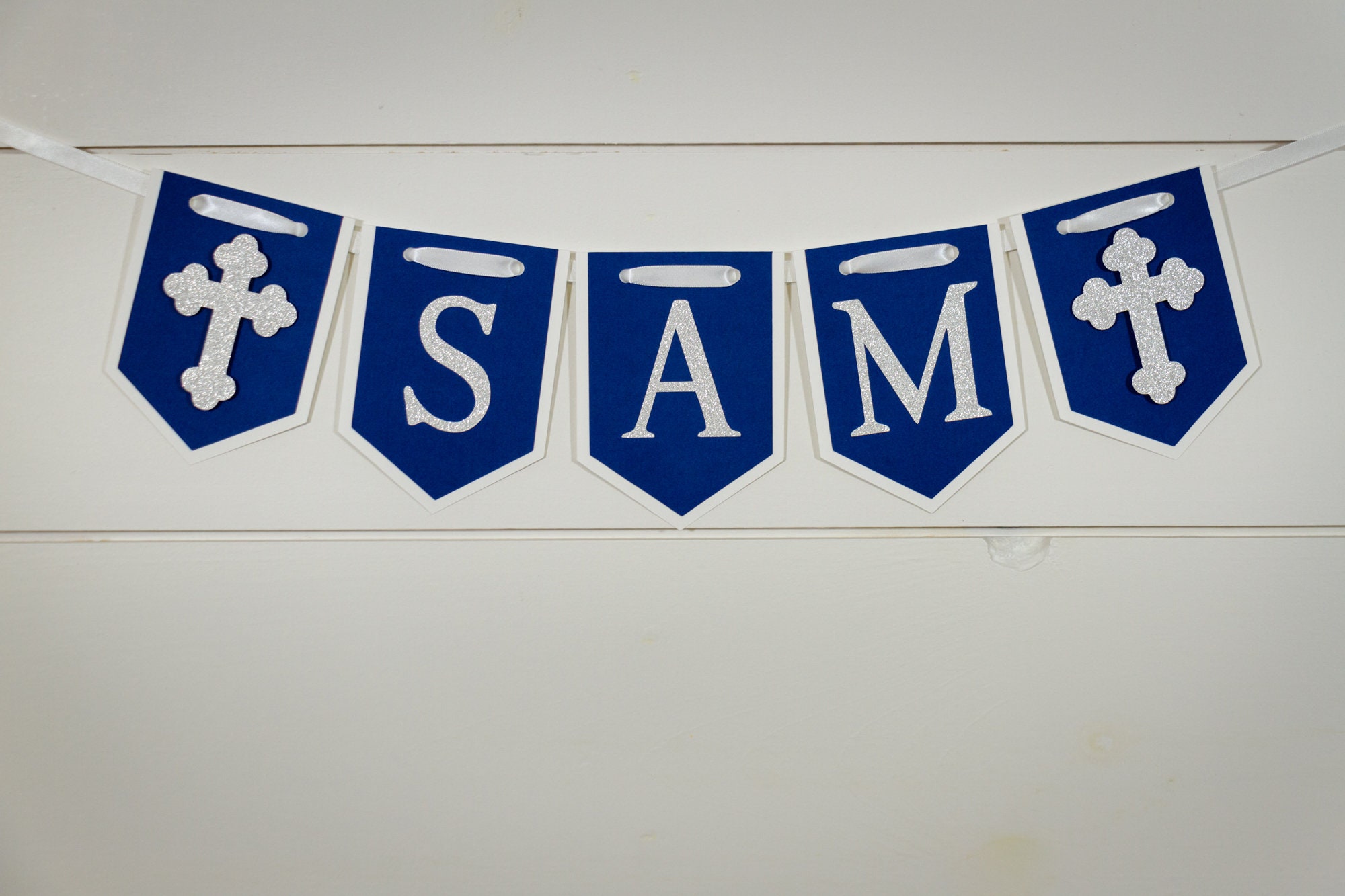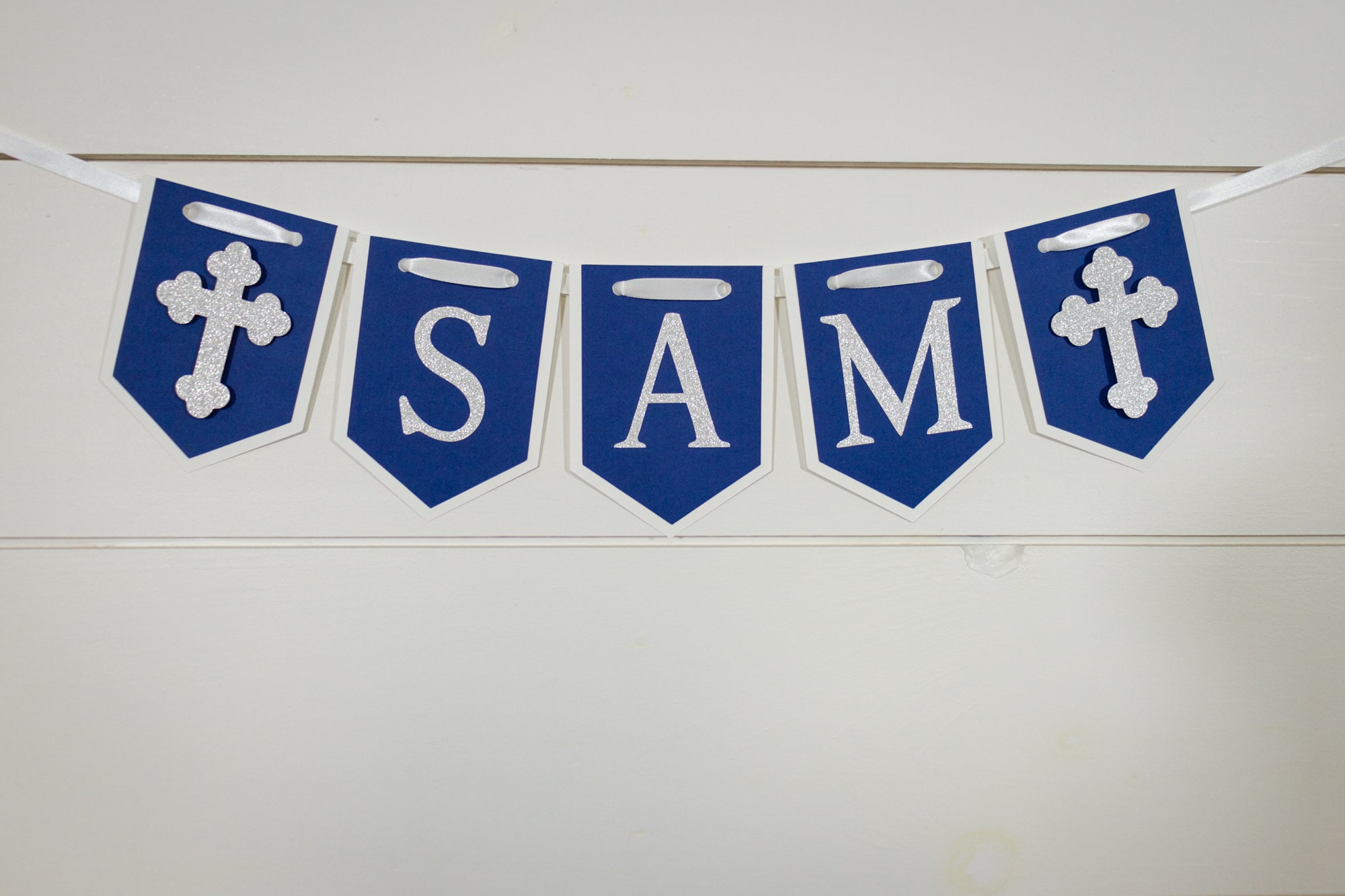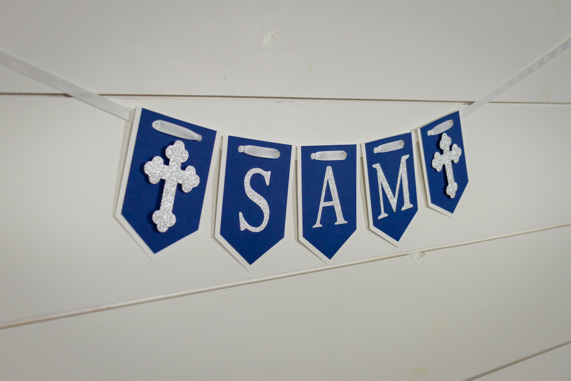 This listing is for one name banner! The banner is made from premium card stock and each pennant piece measures approximately 5 inches in height. The pennant pieces are attached with white satin ribbon that is looped at the ends to allow for easy hanging. The crosses are attached with foam dots to create a 3D effect! This listing does not include the God Bless Banner.
