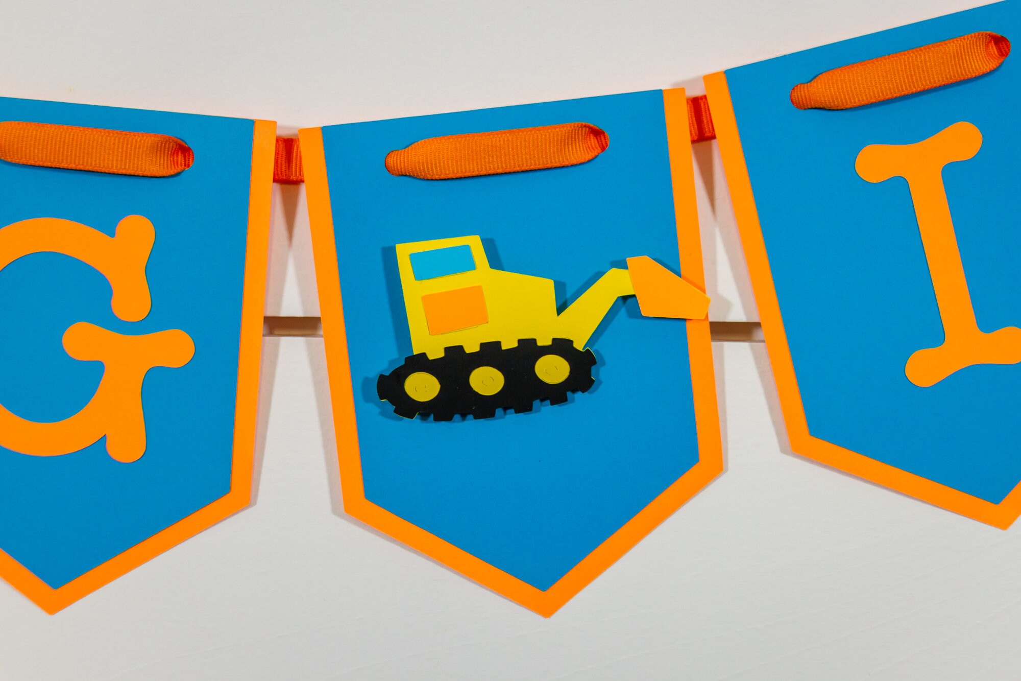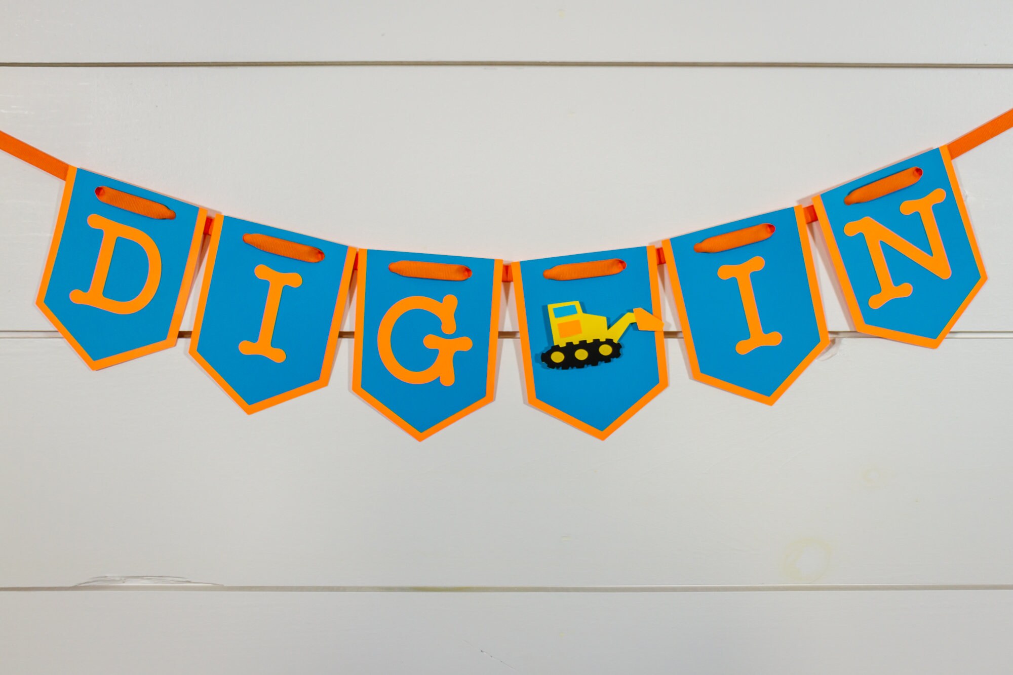 This listing is for one Dig in Banner! The banner is made of premium card stock and each pennant piece measures approximately 5 inches in height. The pennant pieces are attached with an orange ribbon. The vehicle is attached with a foam dot to create a 3D effect.