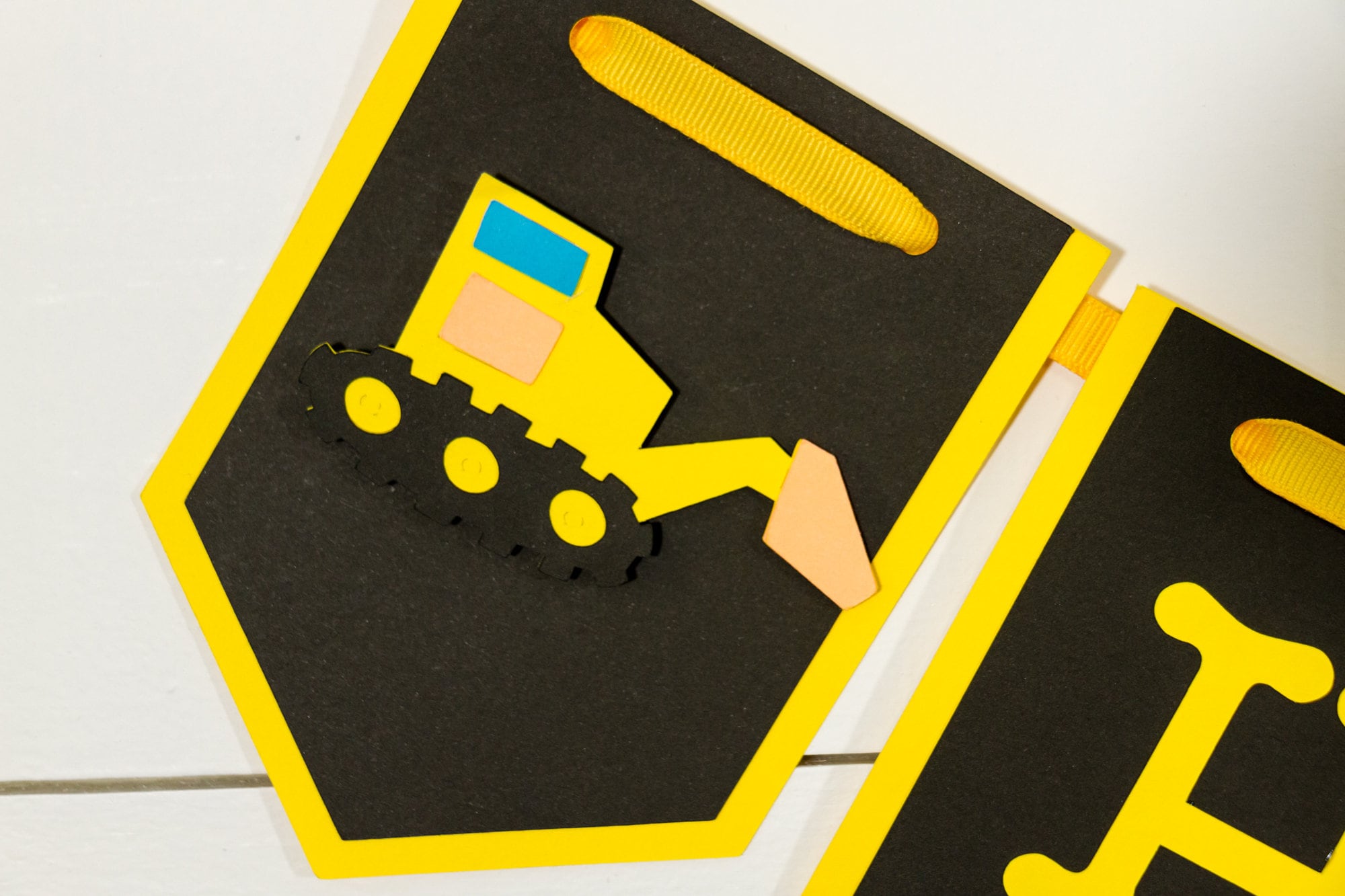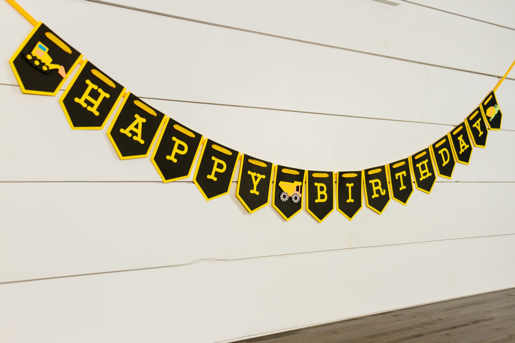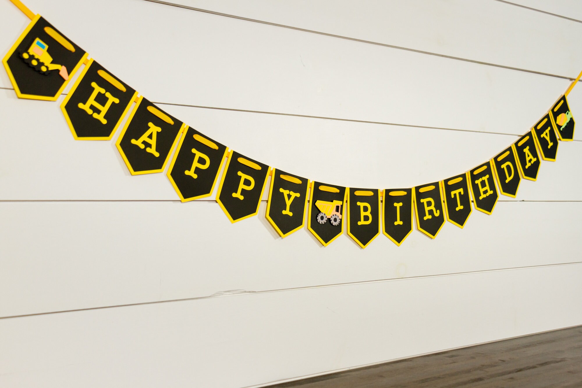 This listing is for one Happy Birthday Banner. There is also an option to add a name at checkout! When choosing the name option you will receive one Happy Birthday Banner and one Name Banner with a construction vehicle at each end of the name. The banner is made of premium card stock and each pennant piece measures approximately 5 inches in height. The pennants are attached with yellow satin ribbon that is looped at the ends to allow for easier hanging. The vehicles are attached with foam dots to create a 3D effect.