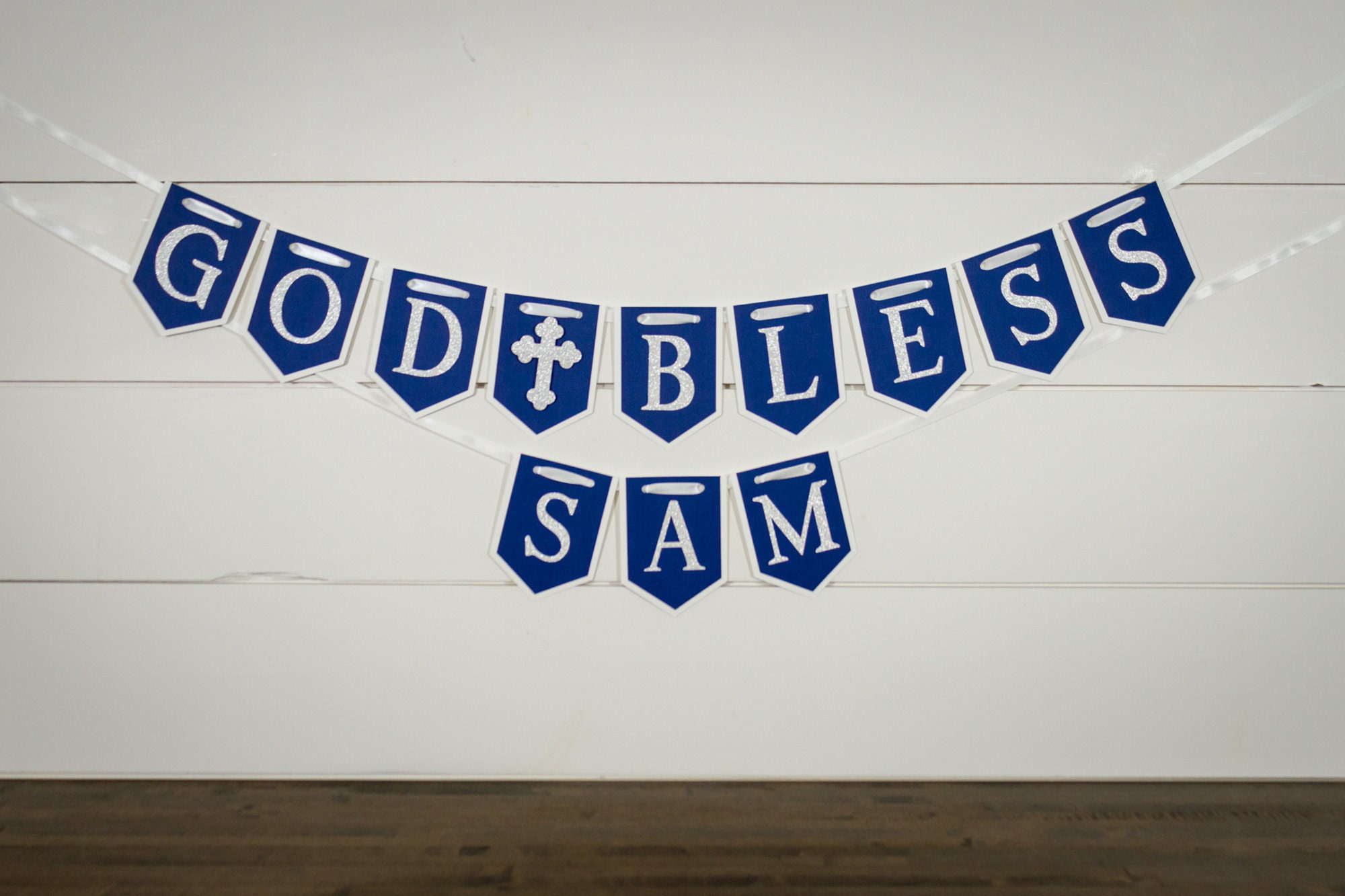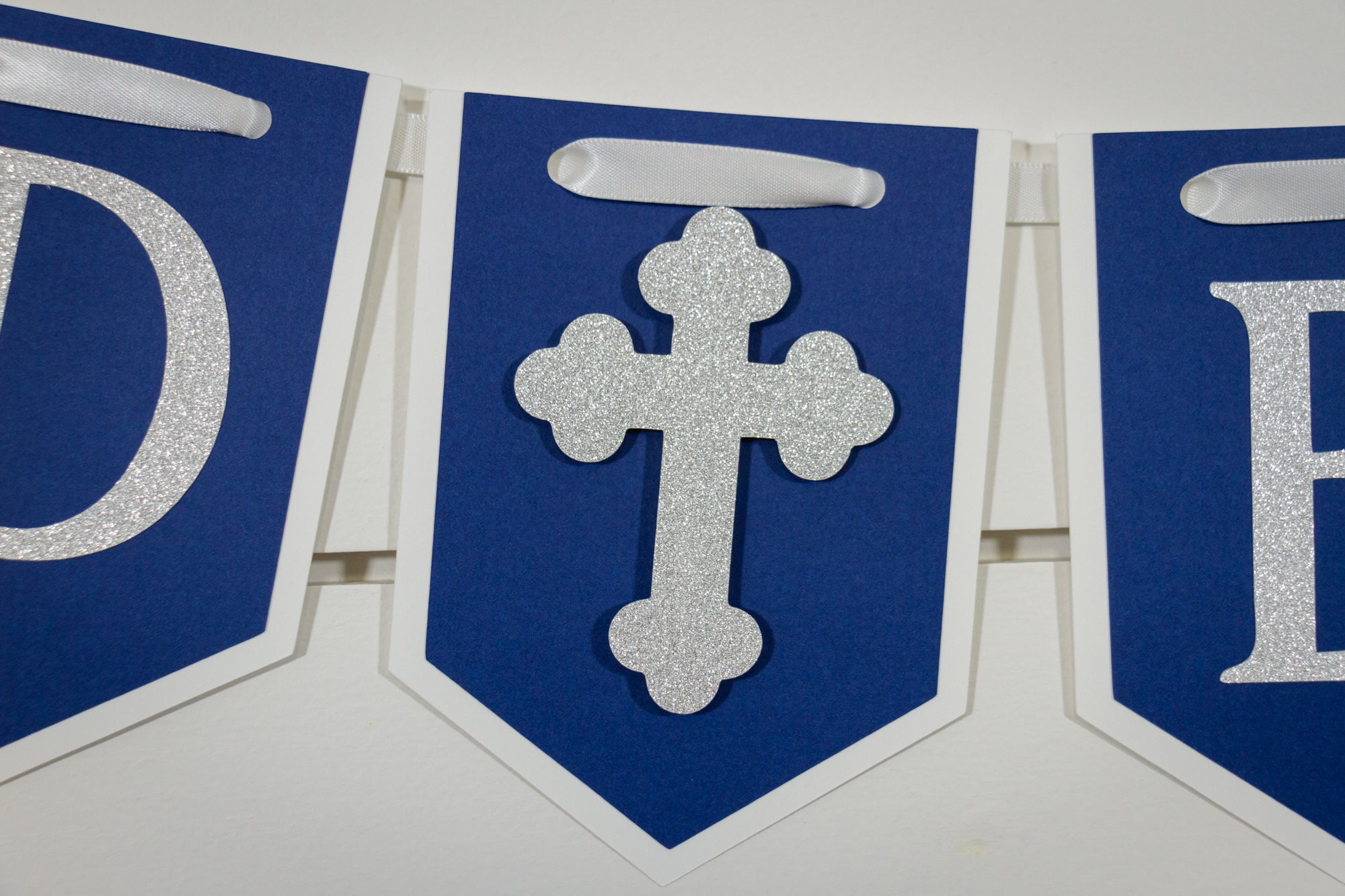 This listing is for both the God Bless Banner and a name banner. The name will be on a separate banner. The banners are made from premium card stock and each pennant measures approximately 5 inches in height. The pennant pieces are attached with a white satin ribbon that is looped on the ends to provide easy hanging. The cross is attached with a foam dot to create a 3D effect.
