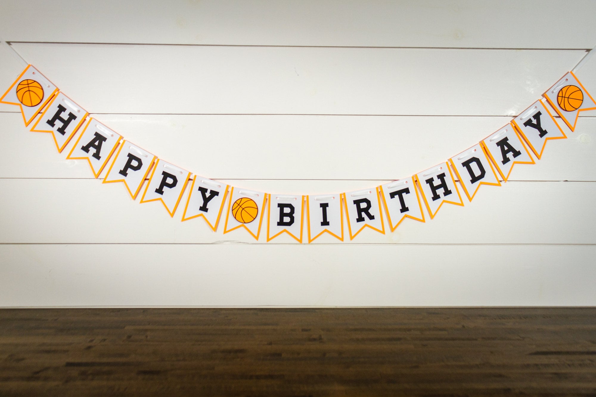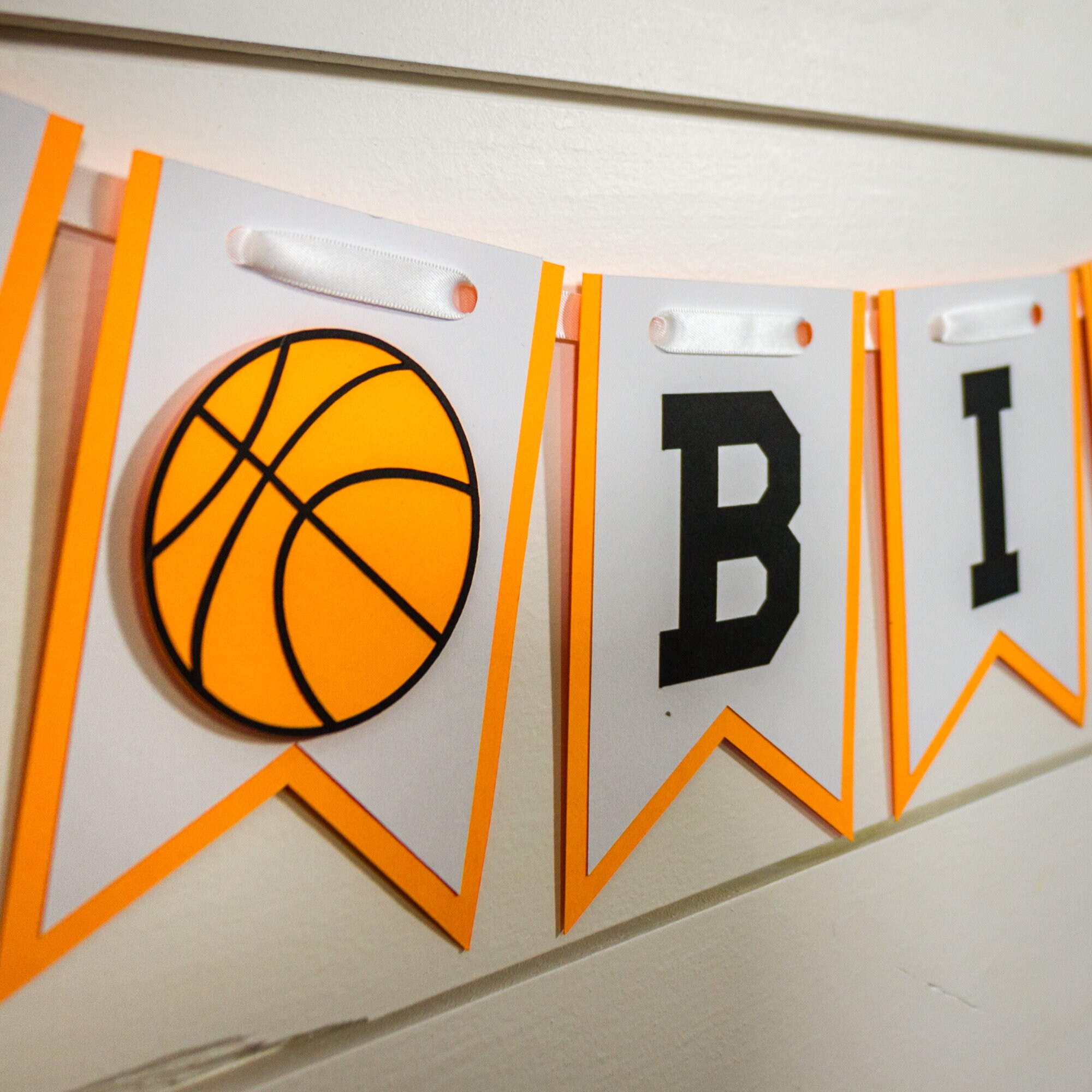 This listing is for one basketball Happy Birthday Banner. The banner is made from premium card stock and each pennant measures approximately 5 inches in height. The pennant pieces are attached with white satin ribbon that is looped on the ends for easy hanging. The basketballs are attached with foam dots to create a 3D effect. This banner also has an option to add a name, simply choose name banner from the drop down menu. When ordering the personalized banner you with receive bth the Happy Birthday banner as shown and a second banner with the name and a basketball on each side. When choosing this option please be sure to include the name you would like in the note to seller section!