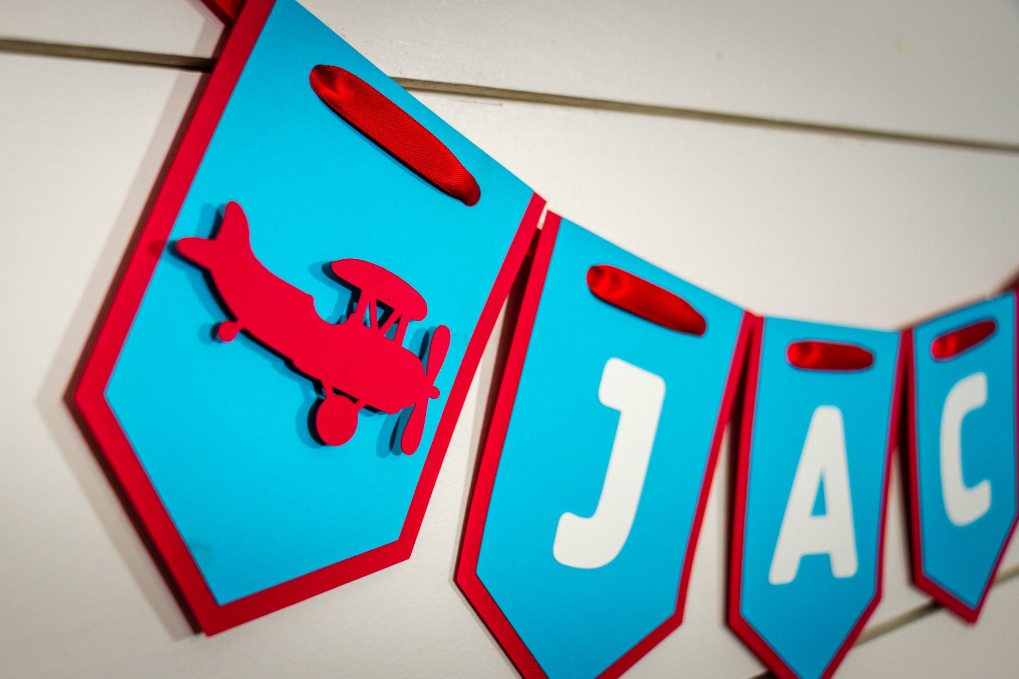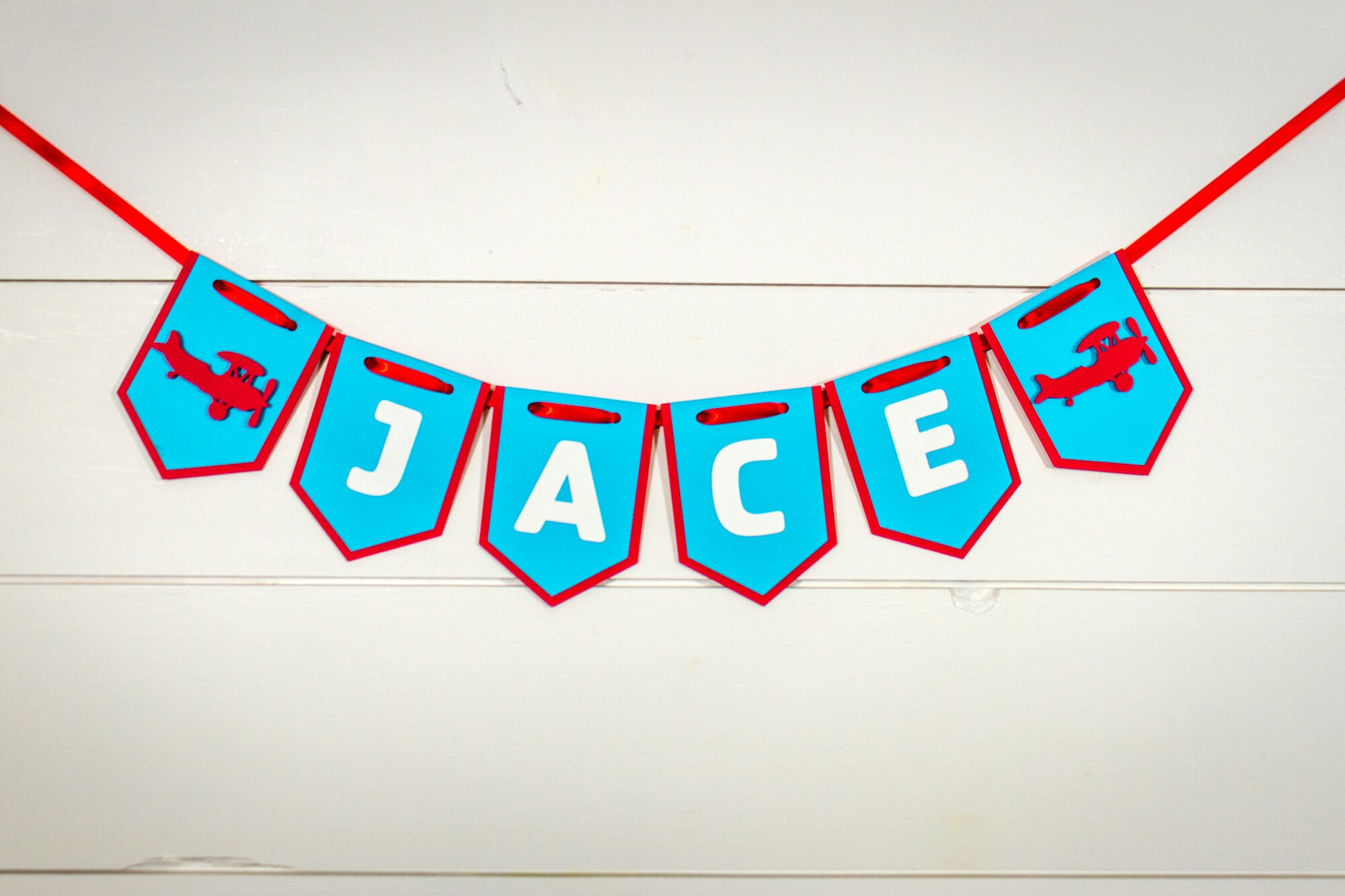 This listing is for one name banner. The banner is made from premium card stock and each pennant measures approximately 5 inches in length. The pennants are attached with a red satin ribbon that is looped at the ends to allow for easy hanging. There is an airplane on each side of the name that is attached with foam dots to create a 3D effect.