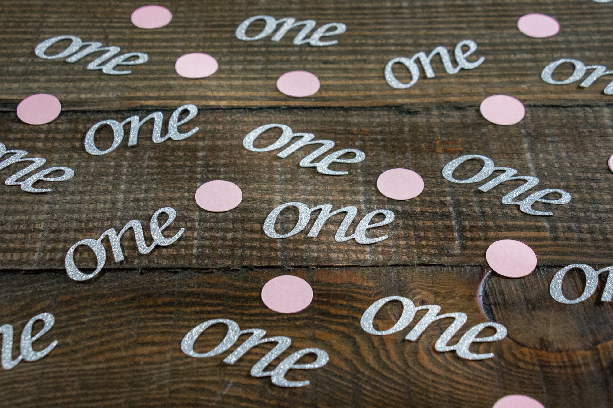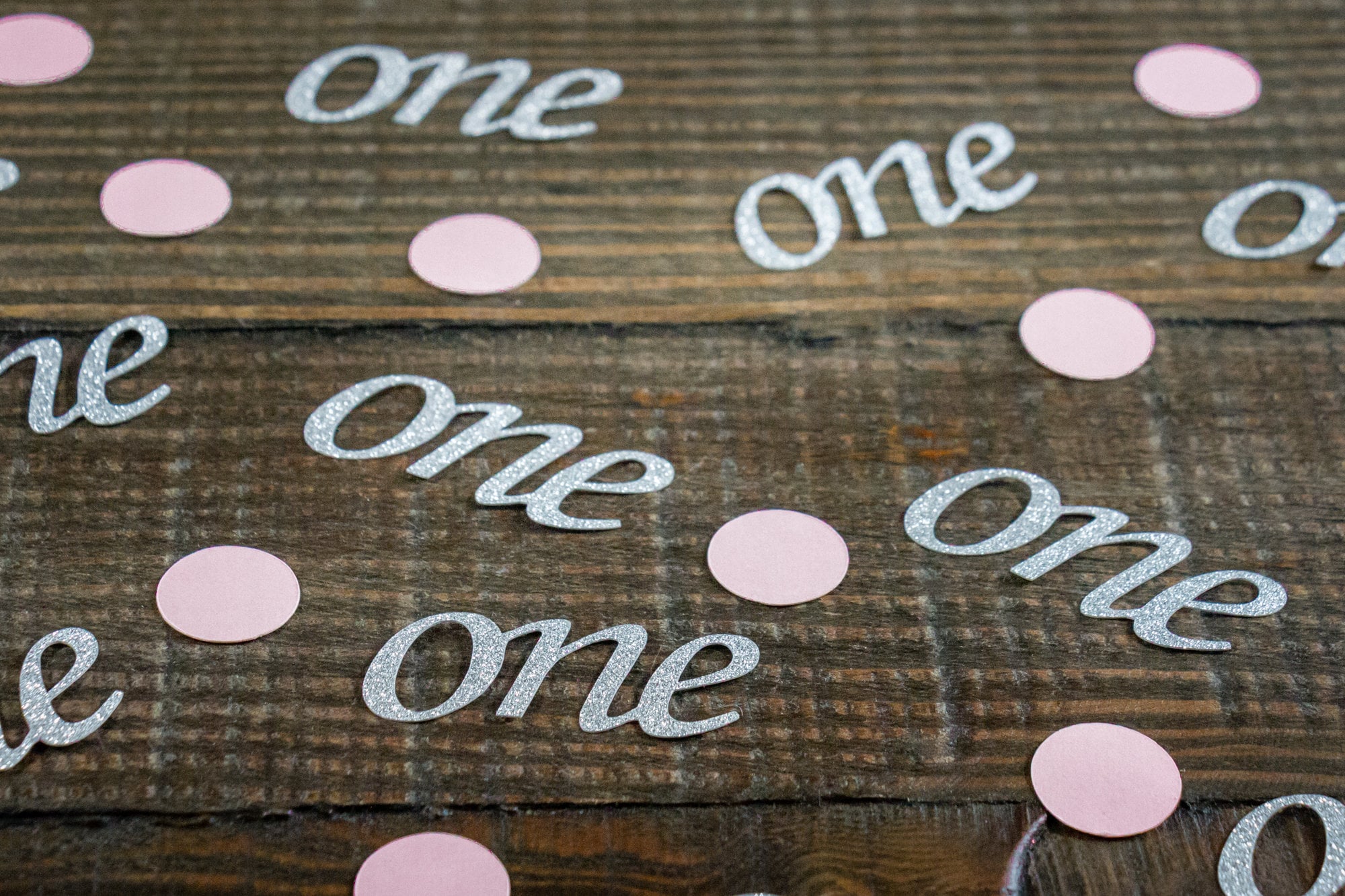 This listing is for a package of 100 pieces of confetti! It includes 25 pieces of silver glitter "one" confetti and 75 pieces of pink circle confetti. The "one" confetti is made from elegant glitter cardstock that is white on the reverse side and measures approximately 2 inches in length and 3/4 inch in height. The circle confetti is made from premium cardstock and measures approximately 3/4 inch in diameter.