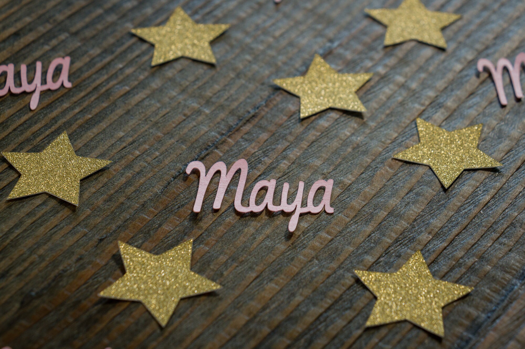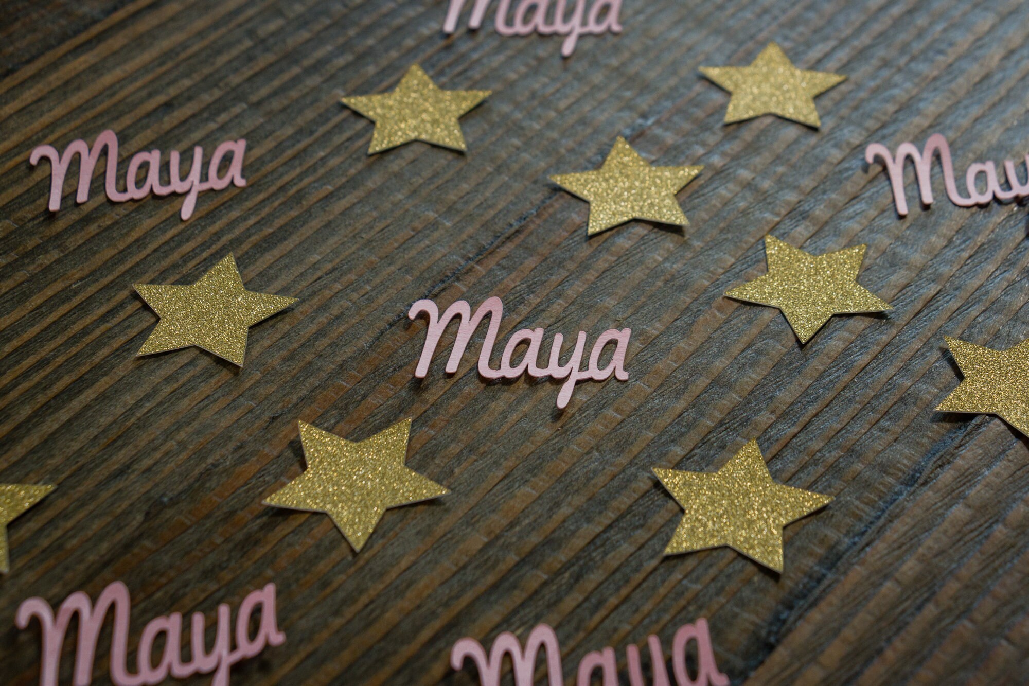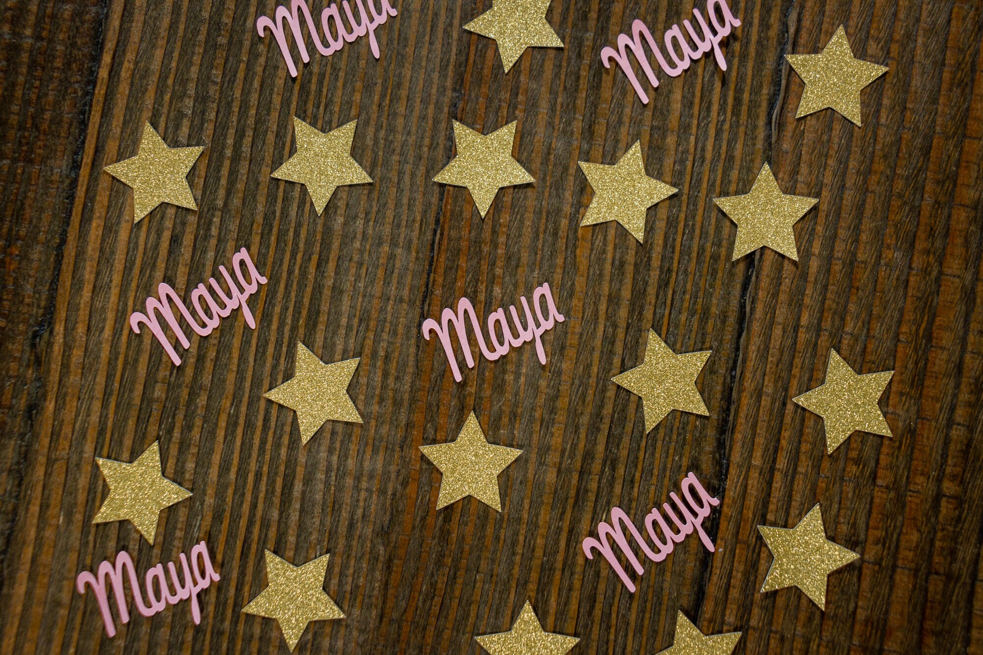 This listing is for 100 pieces of confetti! It includes 75 pieces of glitter gold star confetti that is white on the reverse side and measure approximately 1.25 inches. It also contains 25 pieces of pink name confetti that is approximately 1 inch in height and the length varies based on the name!