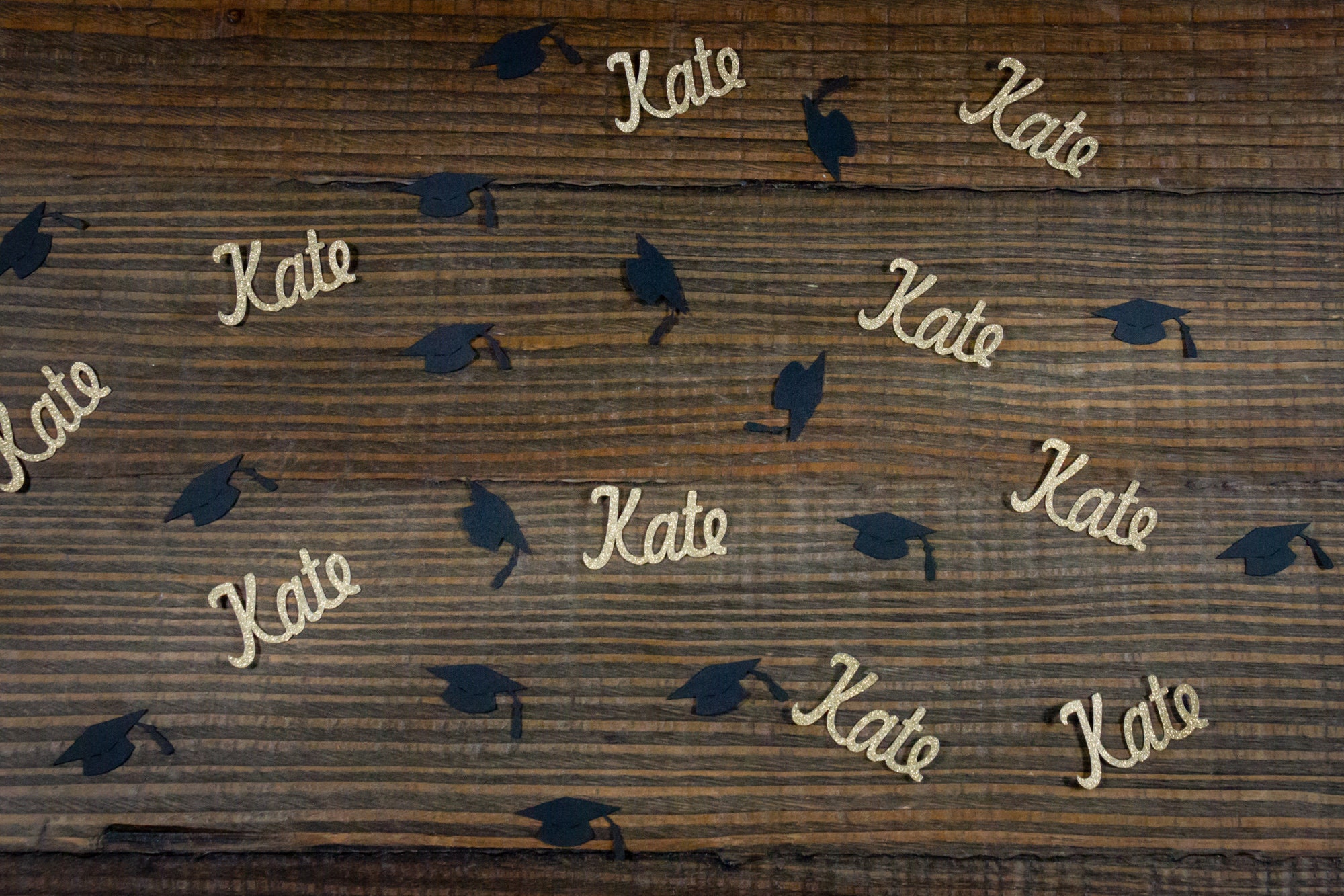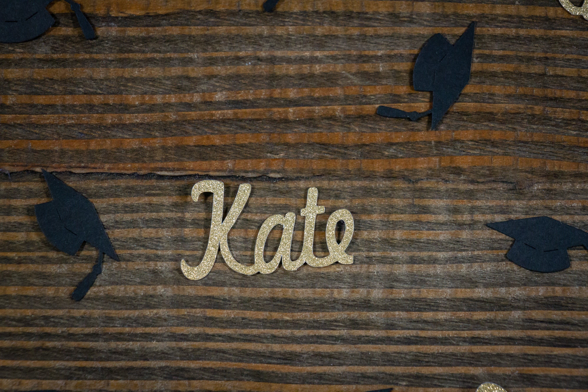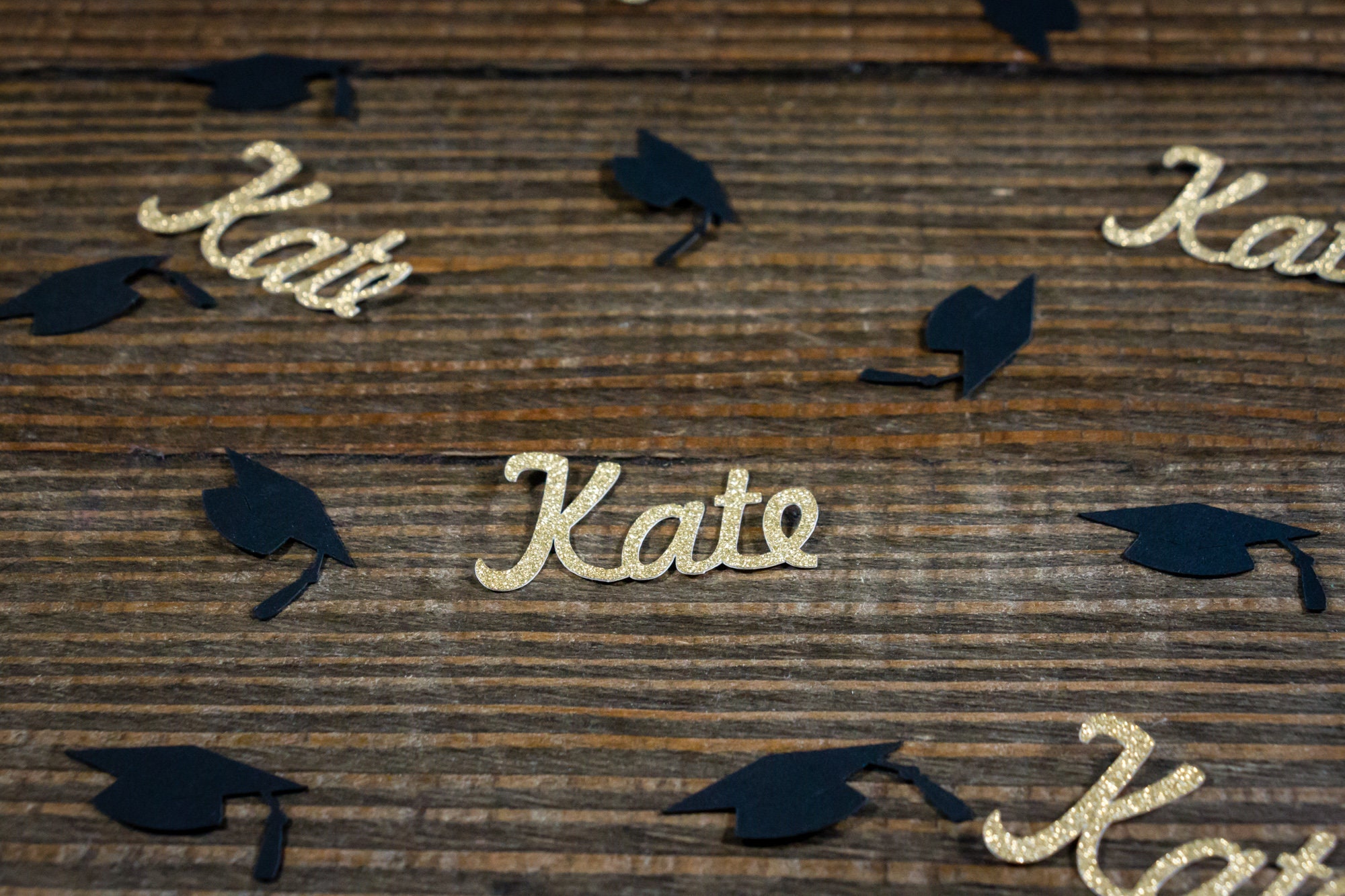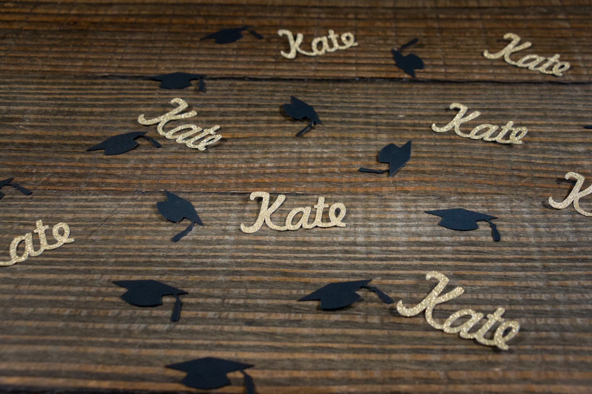 This listing is for a package of 100 pieces of confetti! It includes 25 pieces of glitter gold name confetti which is white on the reverse side and 75 pieces of black graduation cap confetti. The graduation caps are made of black card stock and measure approximately 1.25 inches wide. The names are approximately 1 inch in height and vary in length based on the name.