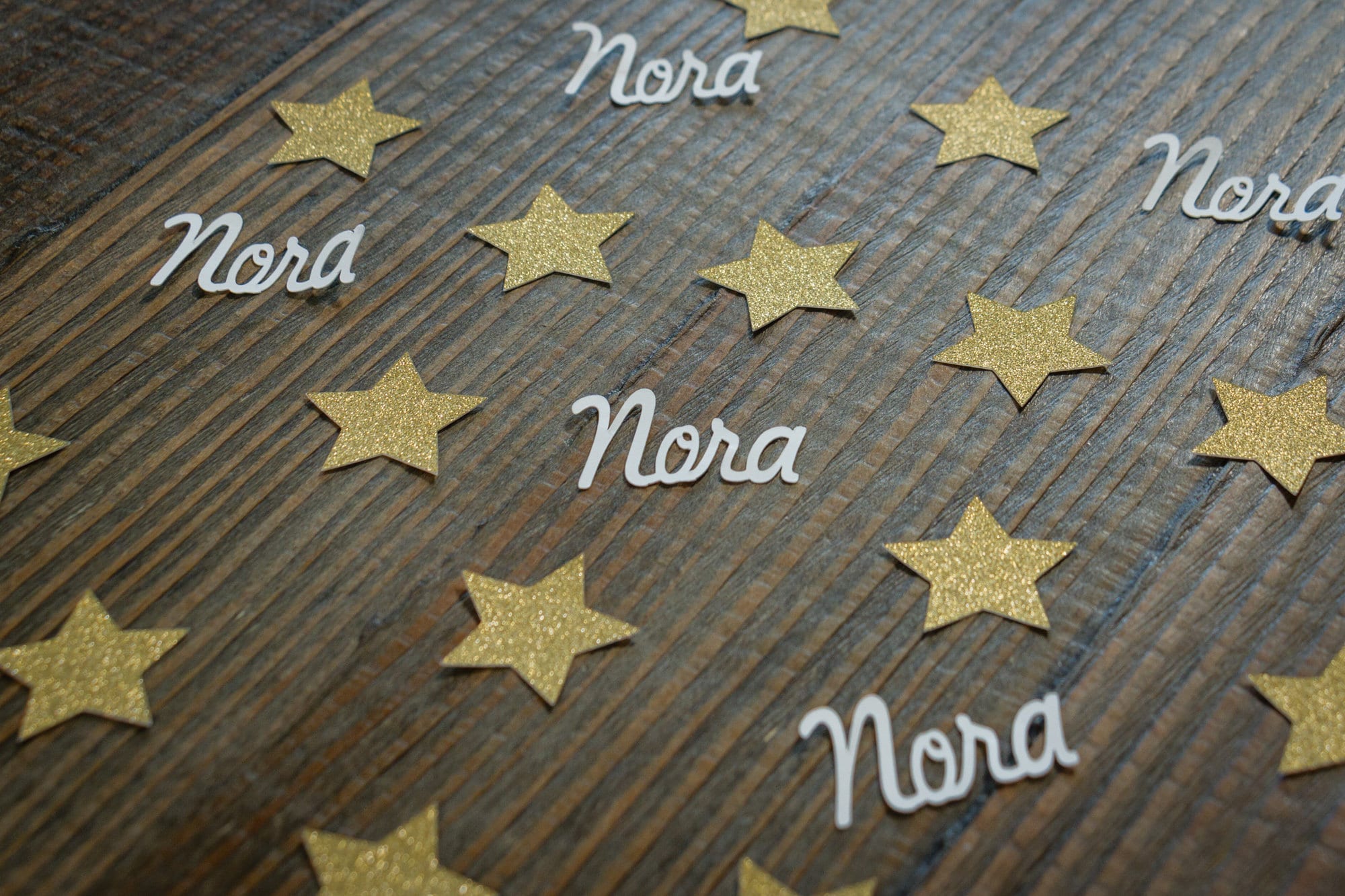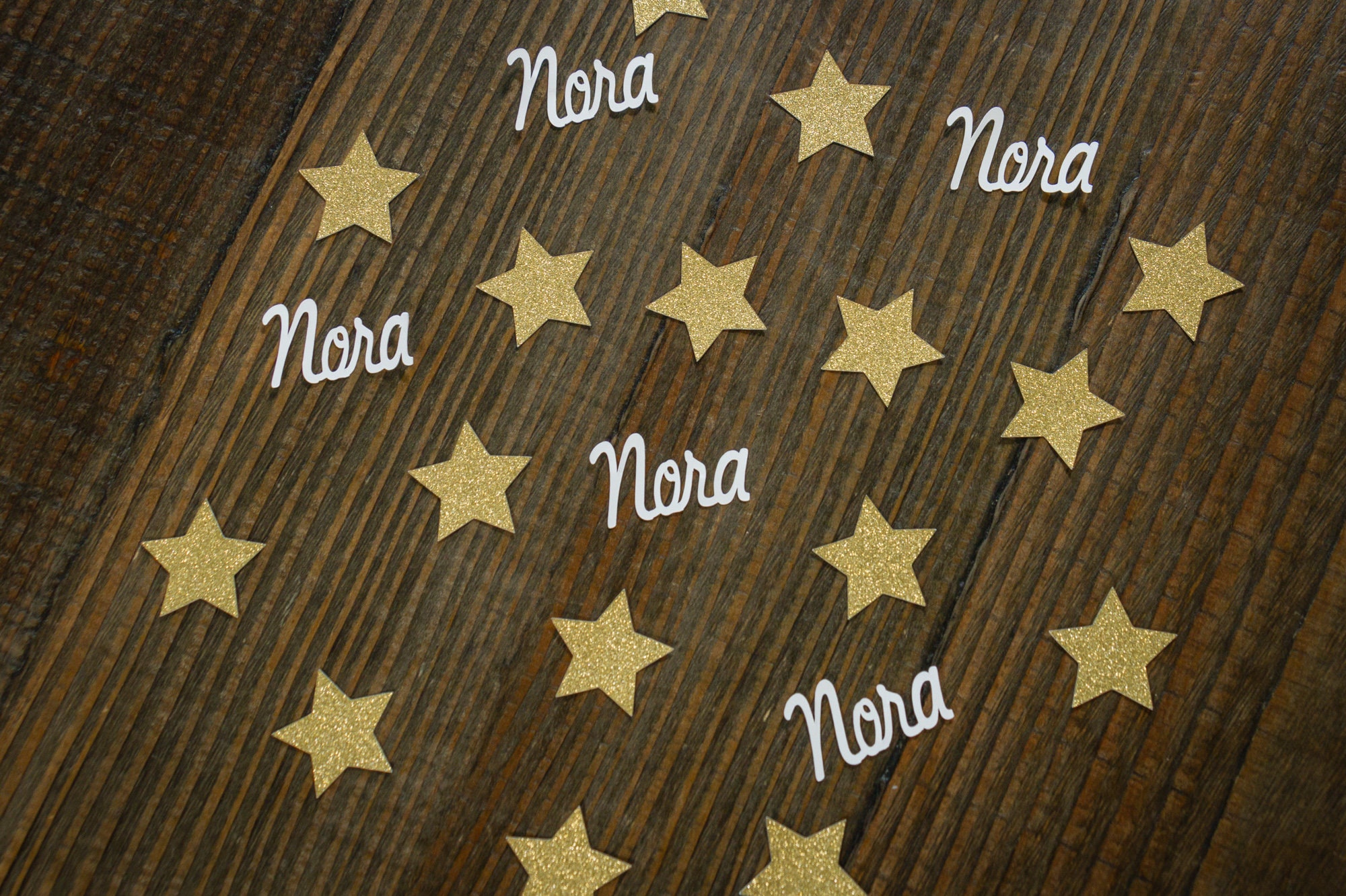 This listing is for 100 pieces of confetti! It includes 75 pieces of glitter gold star confetti that is white on the reverse side and 25 pieces of name confetti. Each star measures approximately 1.25 inches. The name confetti is made of premium white card stock and is approximately 1 inch in height and the length will vary based on the name.
