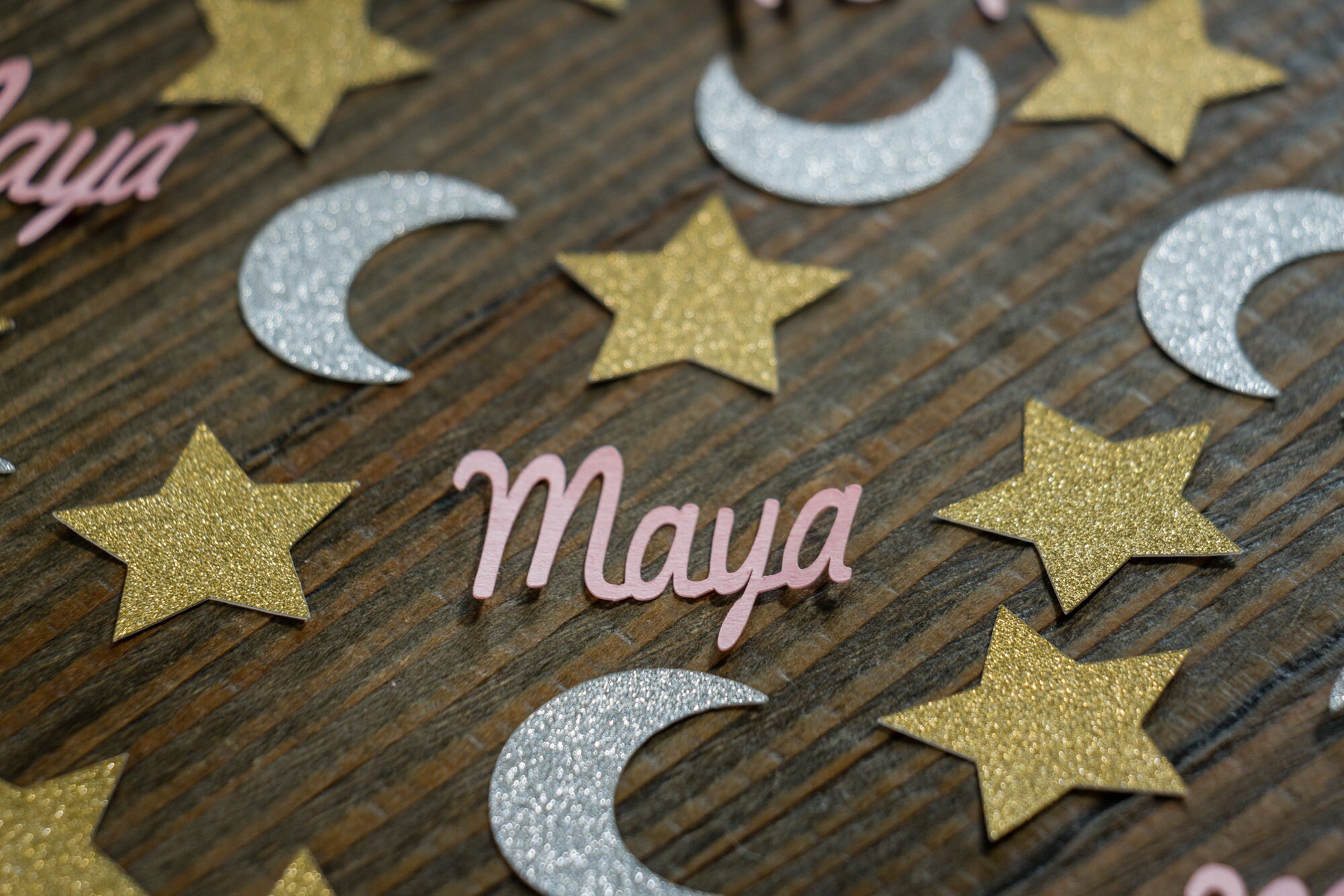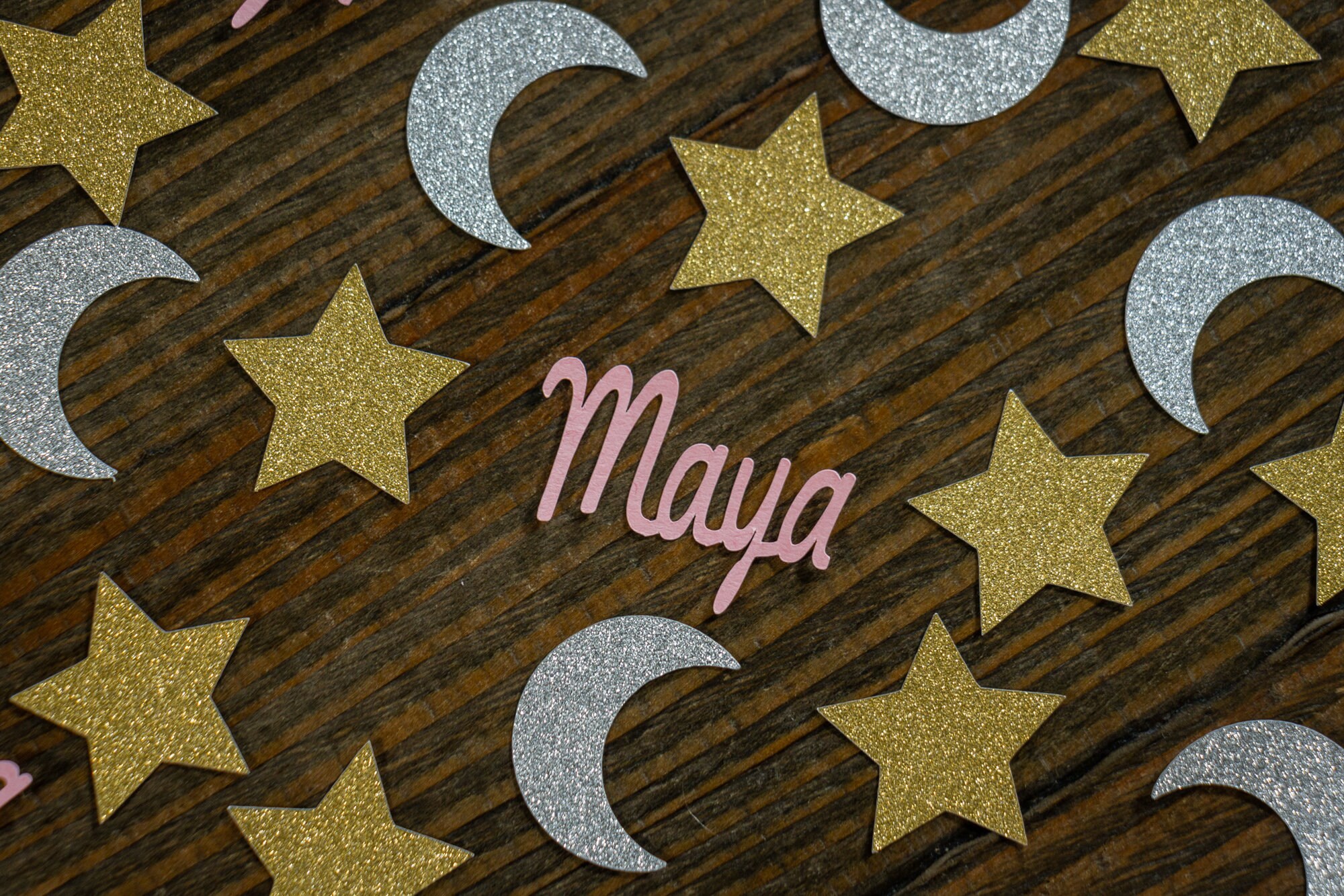This listing is for 100 pieces of confetti! It includes 35 pieces of glitter gold star confetti that measure approximately 1.25 inches and are white on the reverse side. It also includes 40 pieces of silver glitter moon confetti that measure approximately 1.25 inches and is white on the reverse side and 25 pieces of name confetti that is approximately 1 inch in height and length varies based on the name.