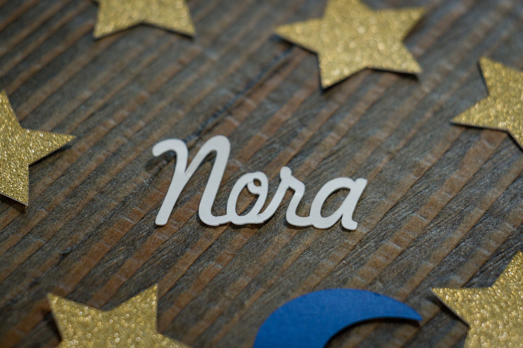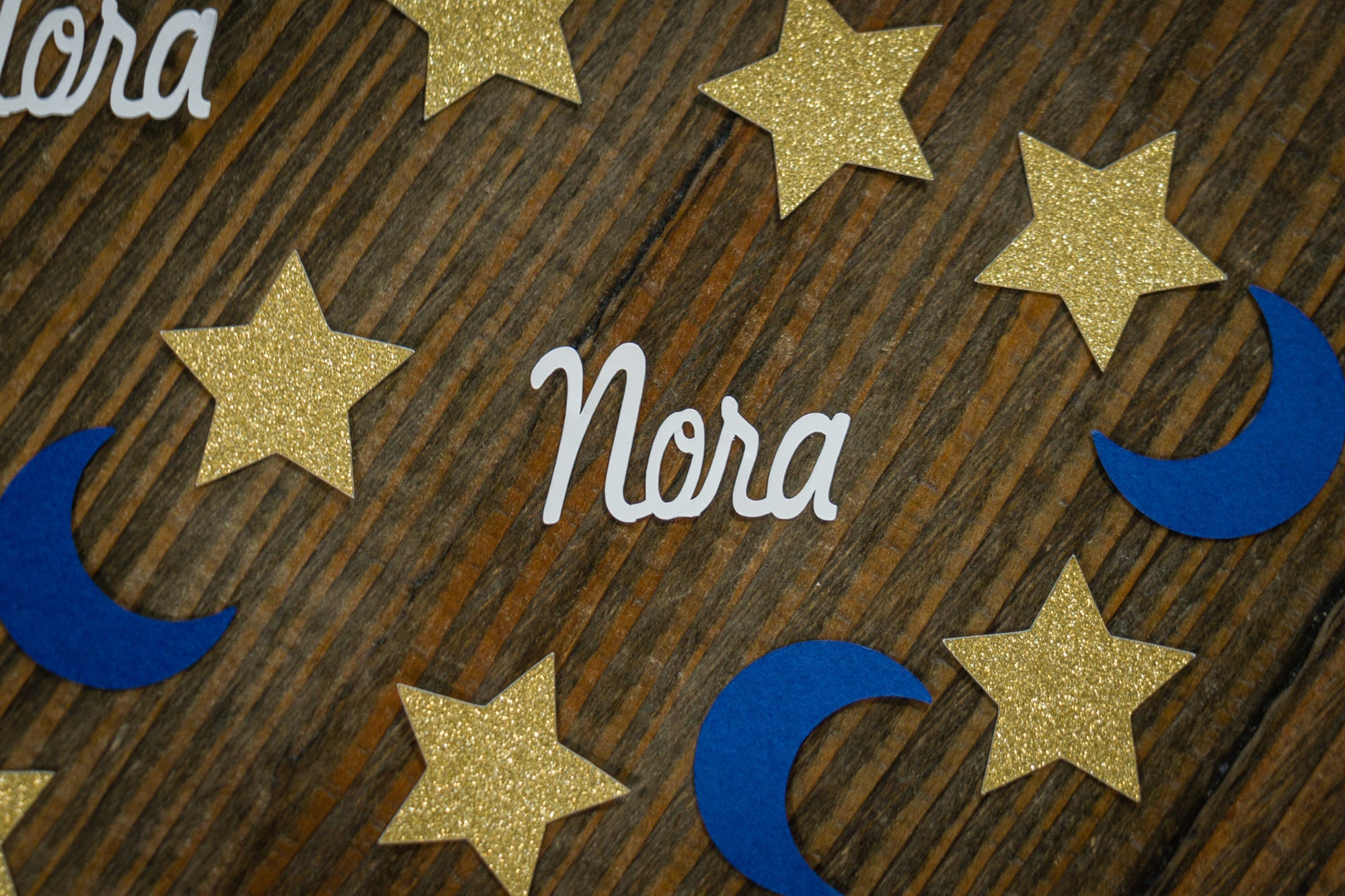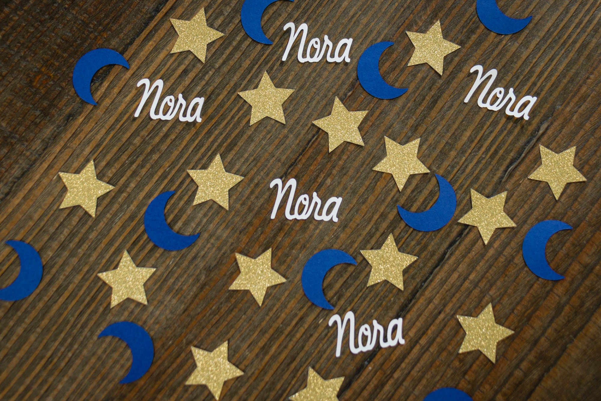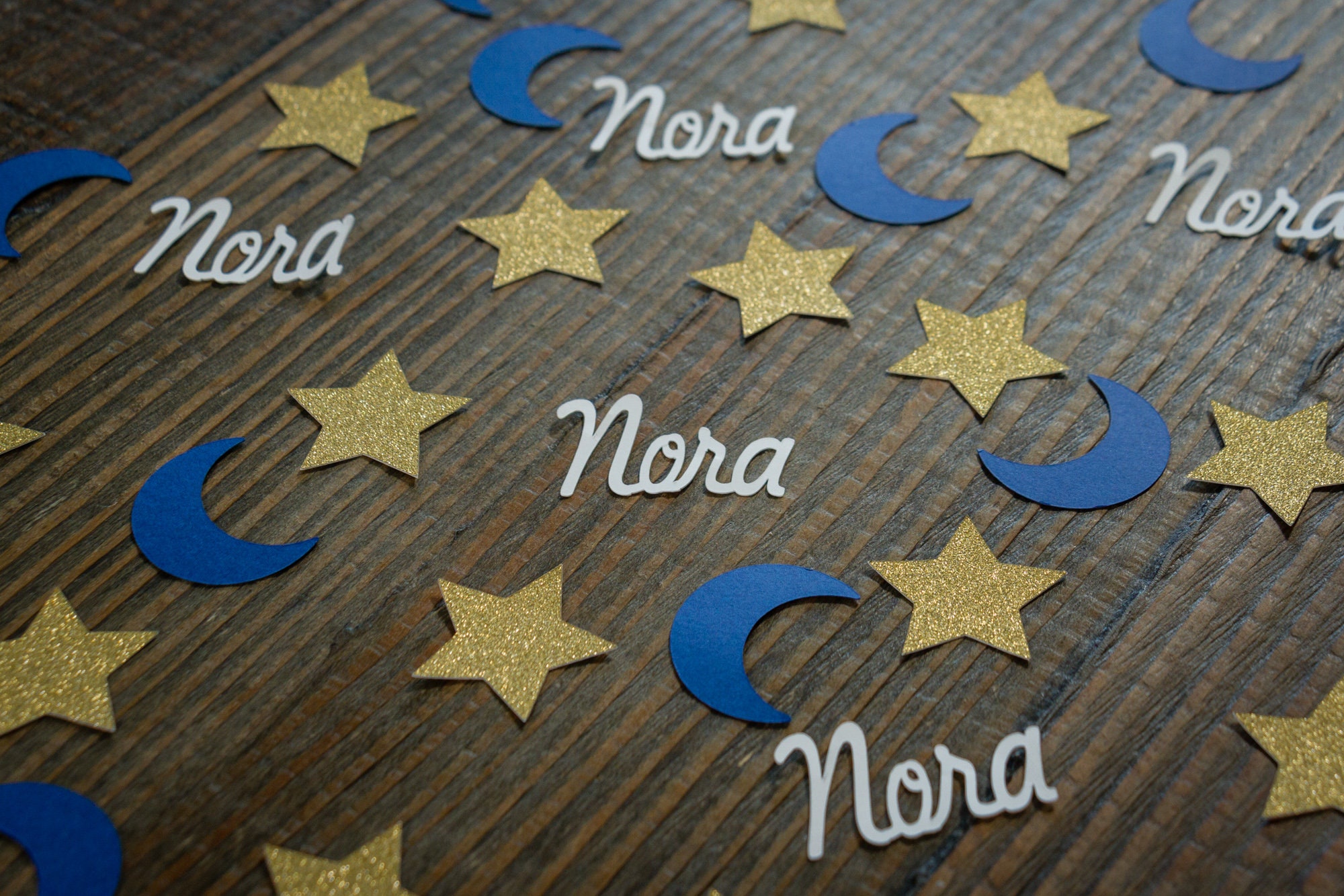 This listing is for 100 pieces of confetti! It includes 35 pieces of glitter gold star confetti that measure approximately 1.25 inches and are white on the reverse side. It also includes 40pieces of navy blue moon confetti that measure approximately 1.25 inches and 25 pieces of white name confetti that is approximately 1 inch in height and length varies based on the name.