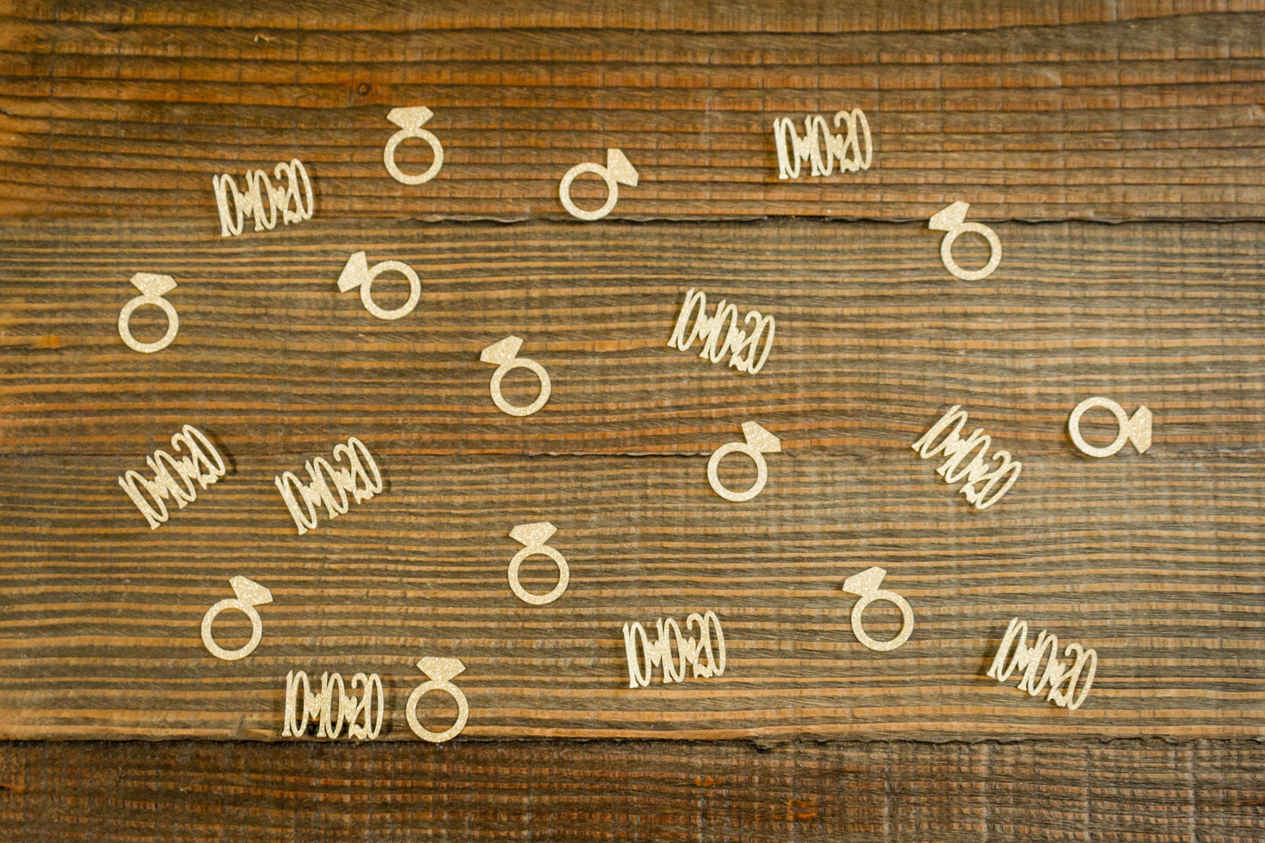 This listing is for 75 pieces of confetti! It includes 25 pieces of date confetti and 50 pieces of ring confetti. They are both made from premium glitter card stock that is white on the reverse side. The rings measure approximately 1.25 inches.