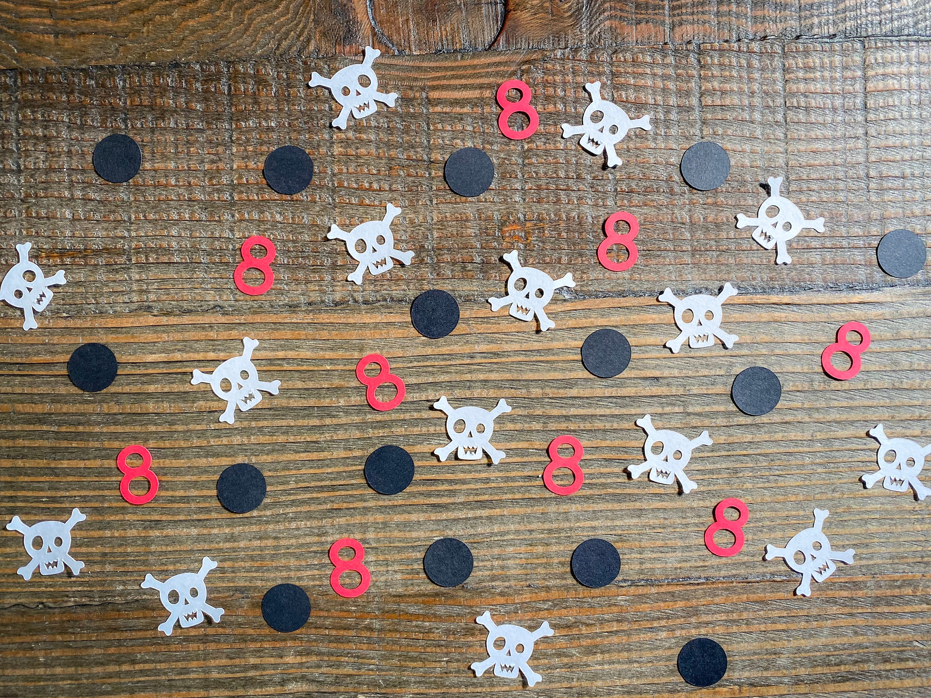 This listing is for 100 pieces of confetti! It includes 20 pieces of white skull confetti measuring 1.25 inches, 20 pieces of age confetti measuring 1-1.25 inches, and 60 pieces of black circle confetti measuring .75 inches.