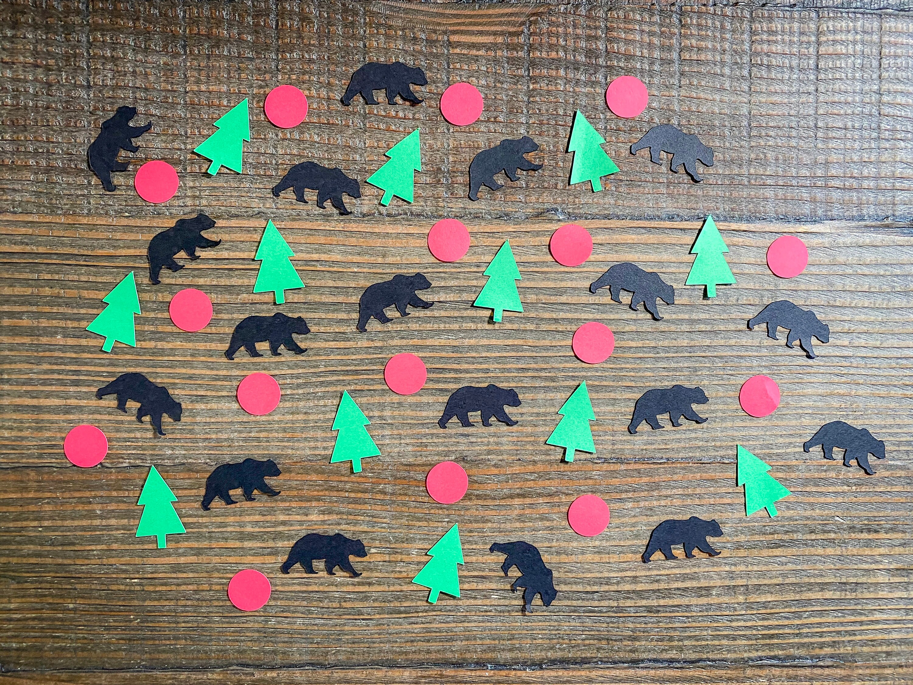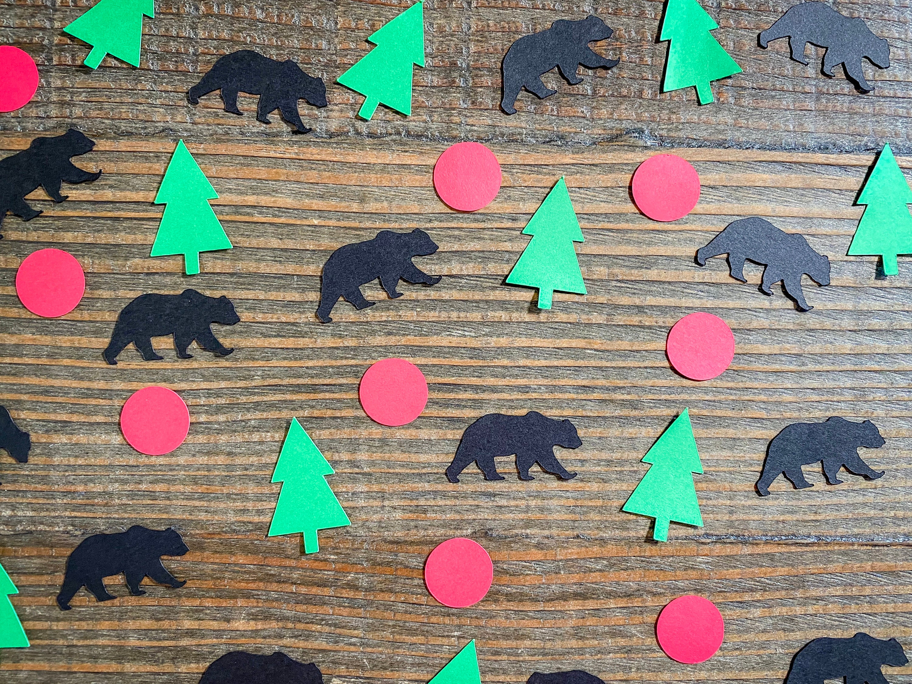 This listing is for 100 pieces of confetti! It includes 25 pieces of black bear confetti measuring approximately 1.5 inches, 25 pieces of green tree confetti measuring approximately 1.5 inches in height, and 50 pieces of red circles measuring .75 inches. All of the confetti pieces are made from premium cardstock.