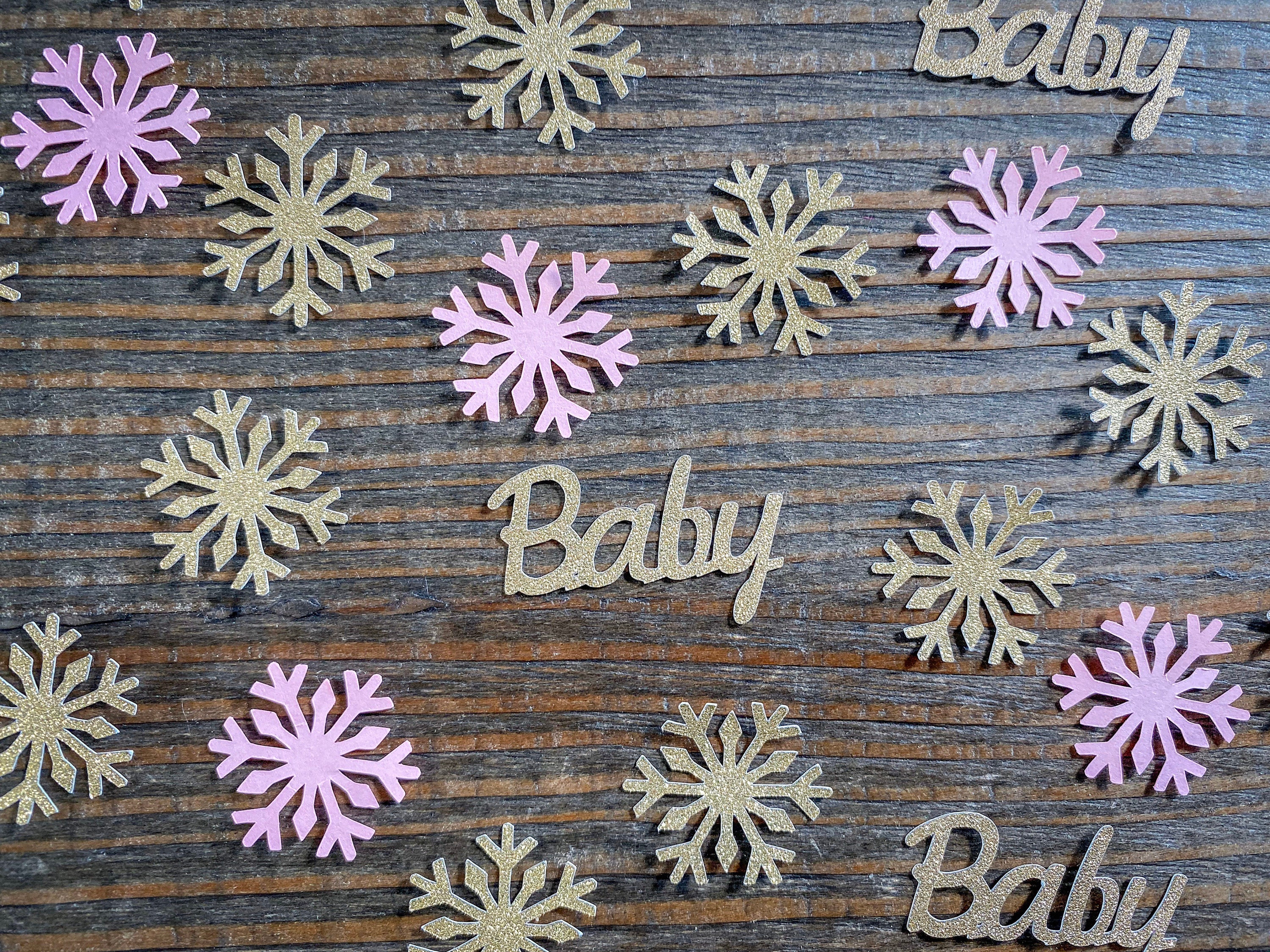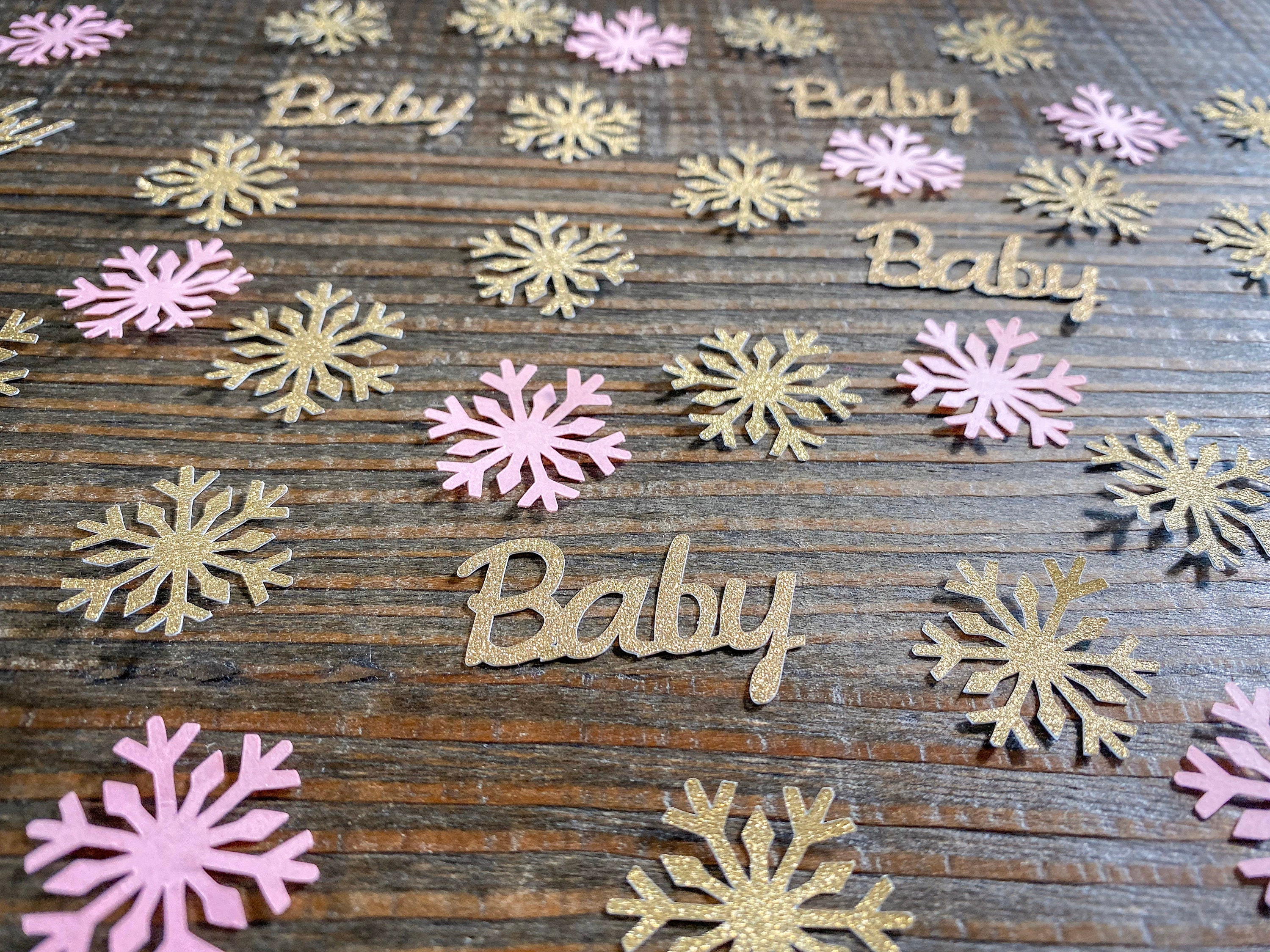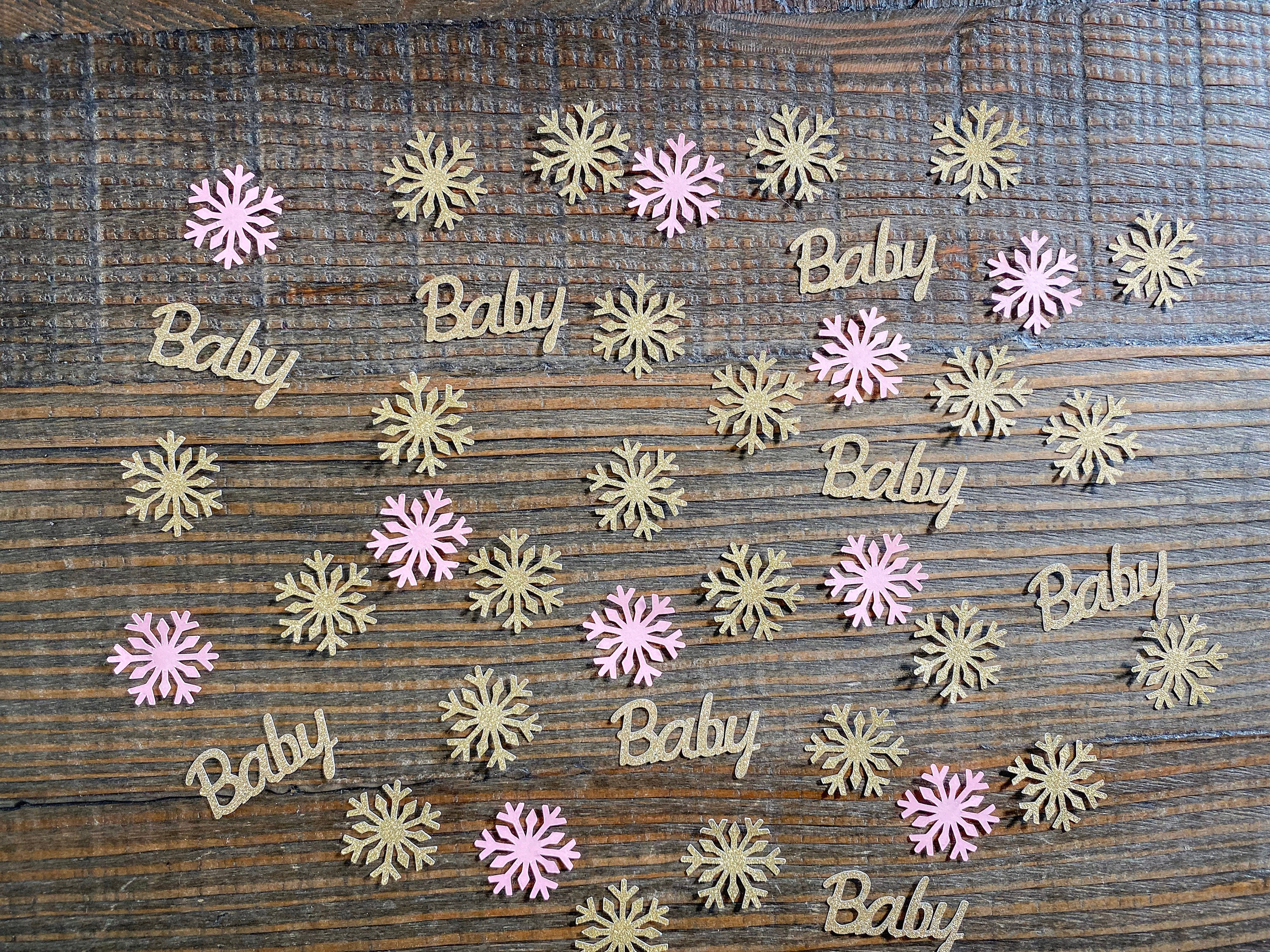 This listing is for 75 pieces of confetti! It includes 25 pieces of gold glitter baby confetti, 25 pieces gold glitter snowflakes, and 25 pieces of light pink snowflakes. The snowflakes measure approximately 1.25 inches and the gold ones are white on the reverse side. The baby pieces measure approximately 1.5 inches and are white on the reverse side.
