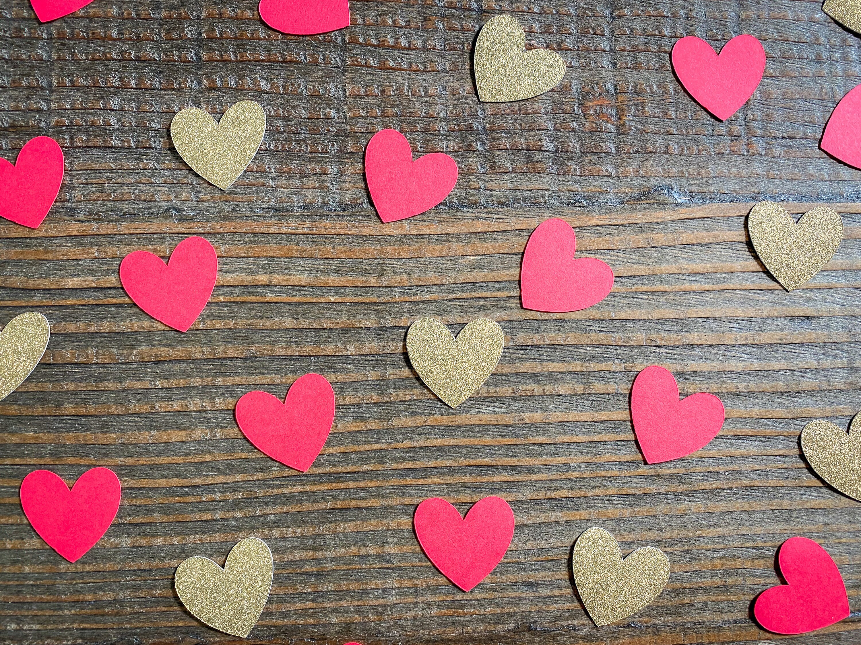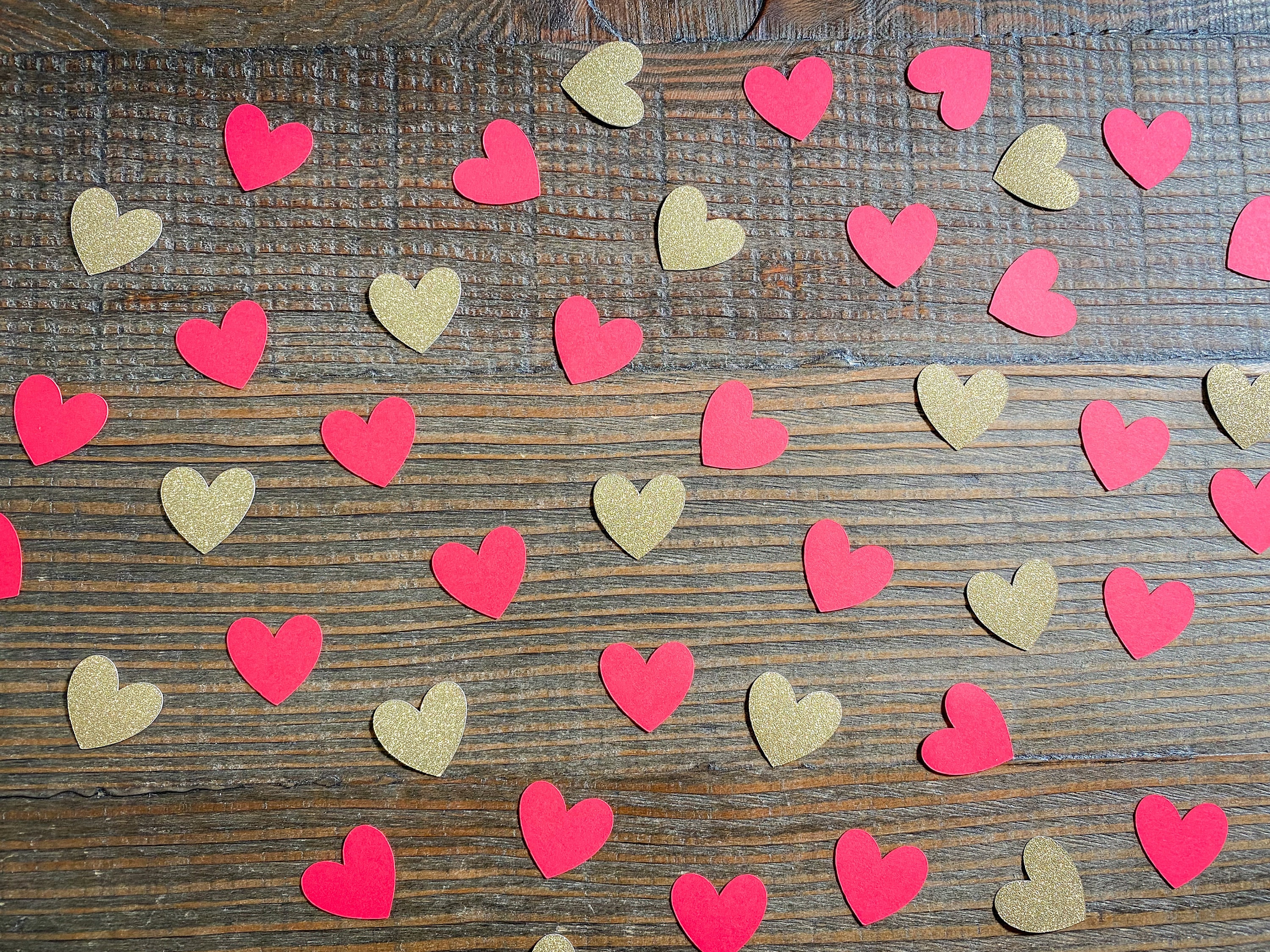 Add a touch of sparkle to your Valentine's or wedding decor with this red and glitter gold heart confetti!