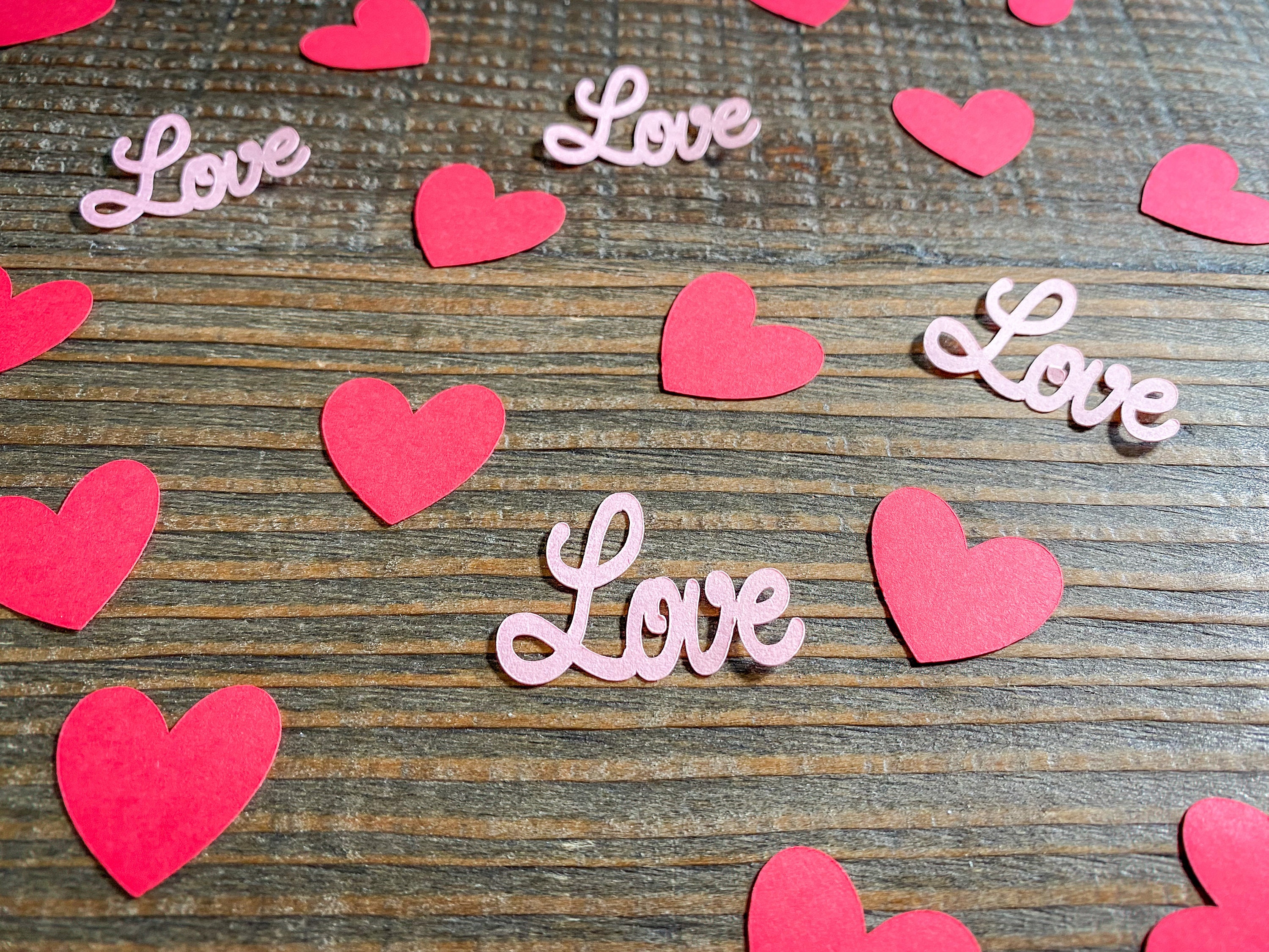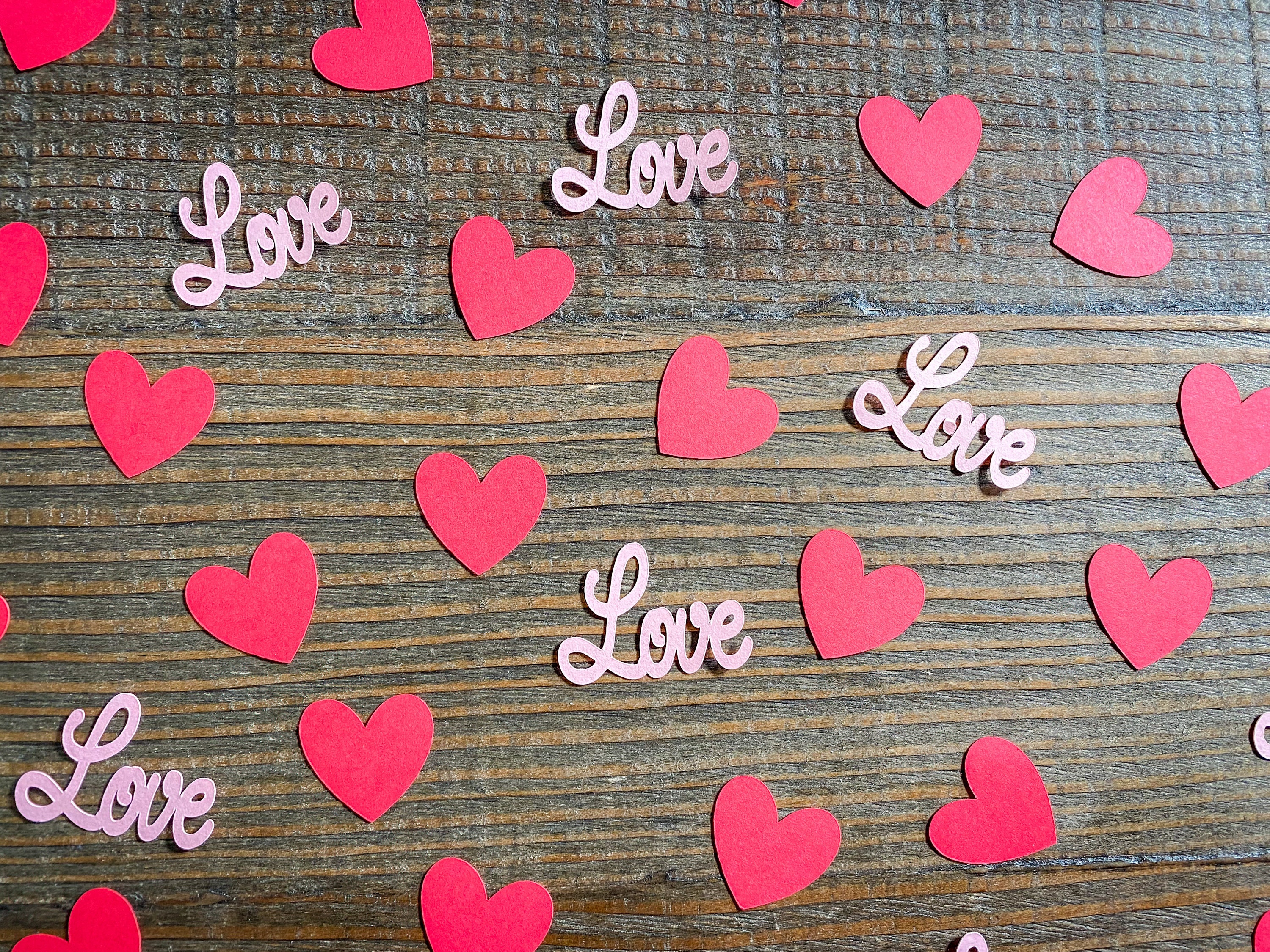 This listing is for 100 pieces of confetti! It includes 25 pieces of light pink love confetti and 75 pieces of red heart confetti. The red hearts measure approximately 1 inch and the love pieces measure approximately 1.5 inches in length and 1.25 inches in height.