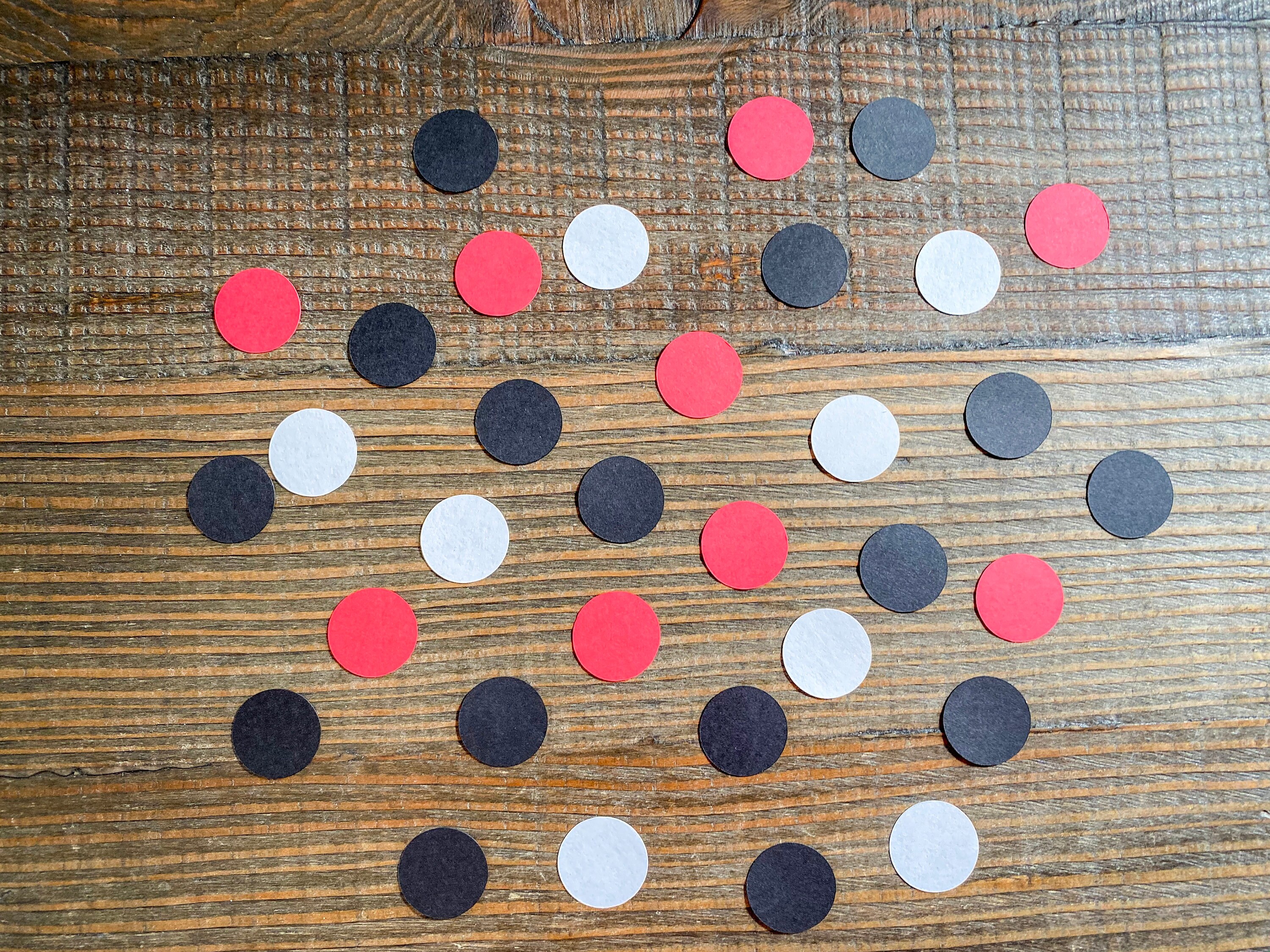 This listing is for 100 pieces of confetti! It includes white, red and black 1 inch circles.