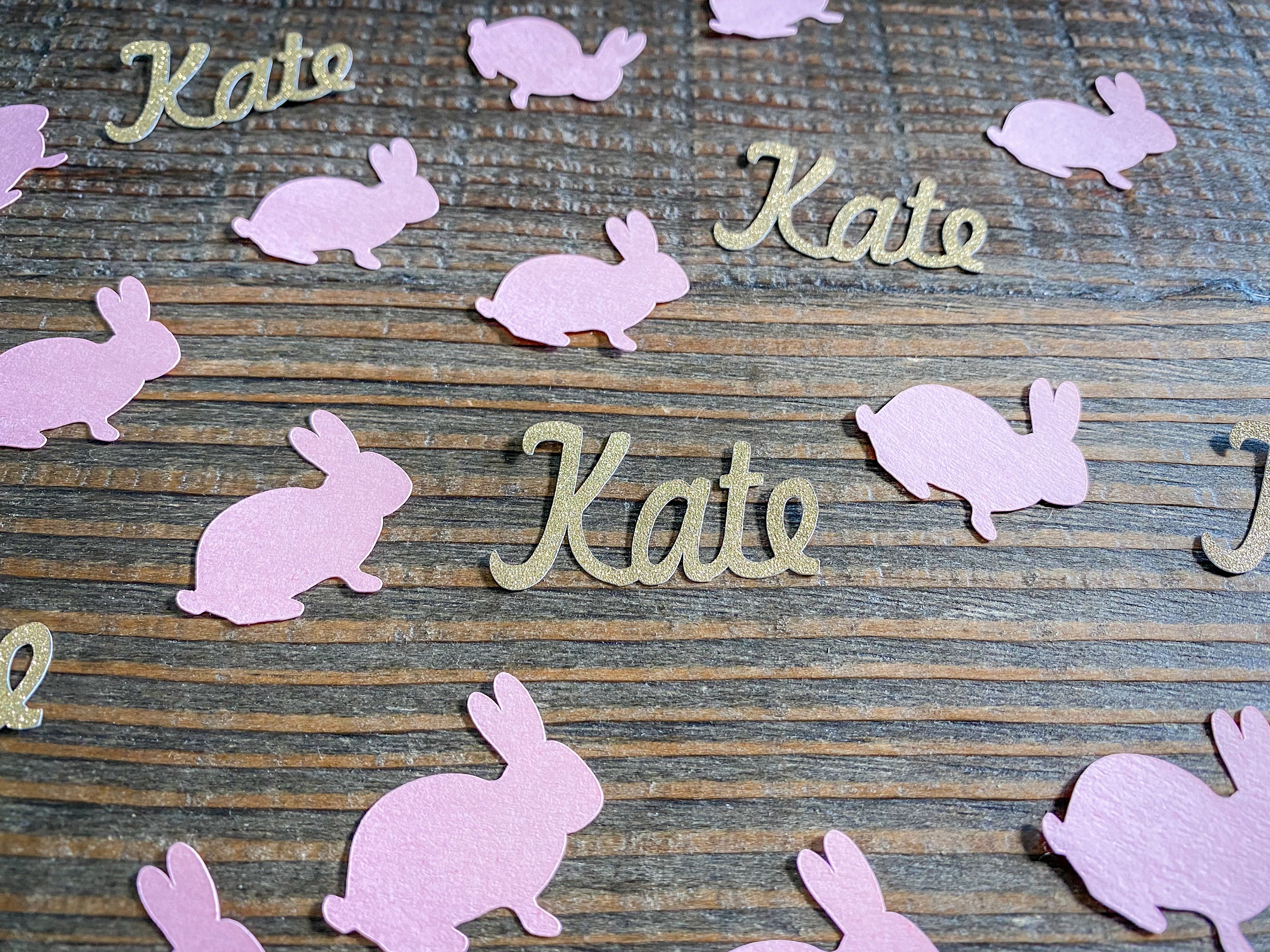 This listing is for 100 pieces of confetti! It includes 25 pieces of glitter gold name confetti and 75 pieces of pink bunny confetti. The name pieces are made from premium glitter cardstock that is white on the reverse side and measure approximately 1 inch in height and the length varies based on the name. The bunny pieces are made with light pink cardstock and measure approximately 1.25 inches.