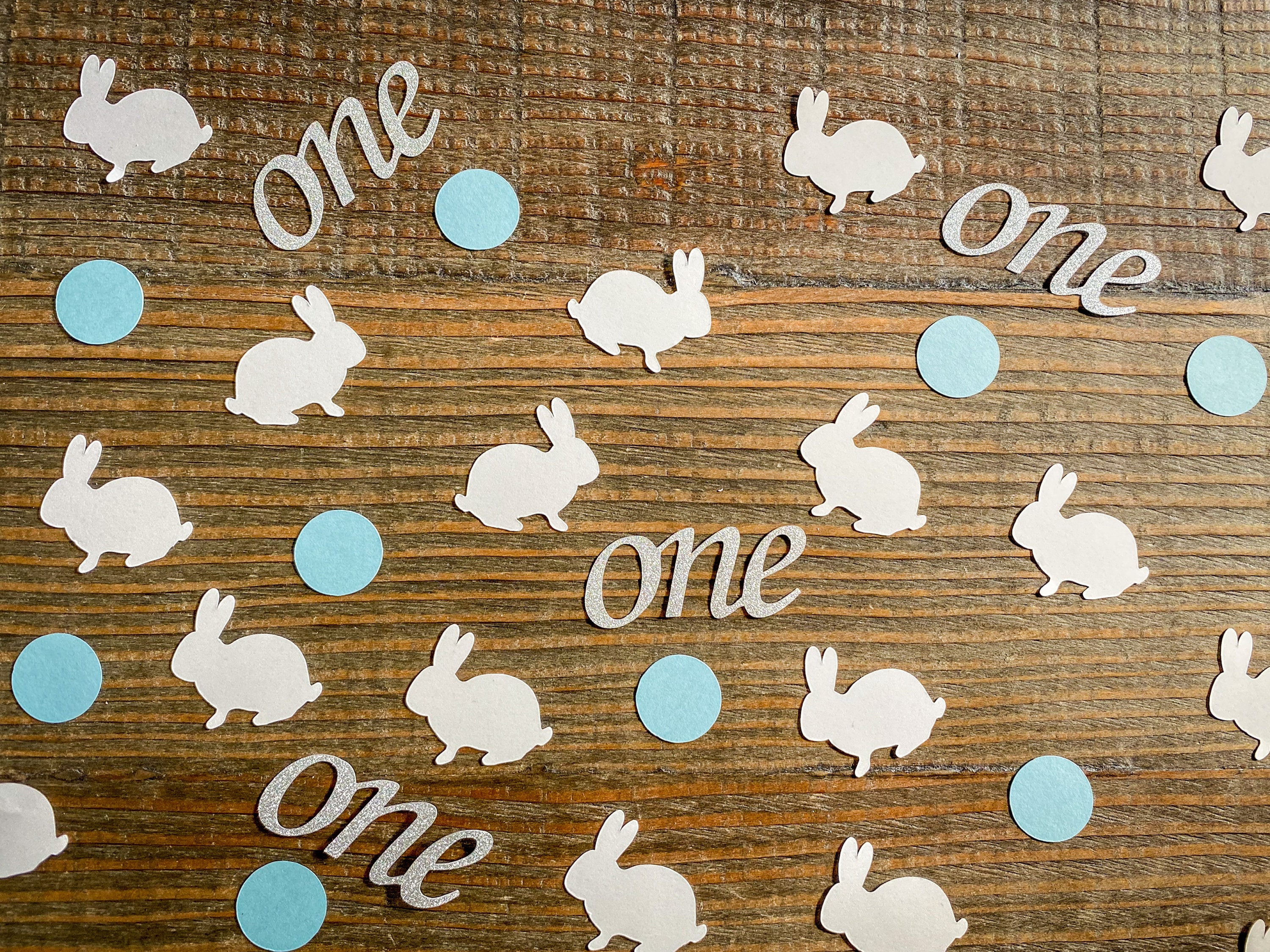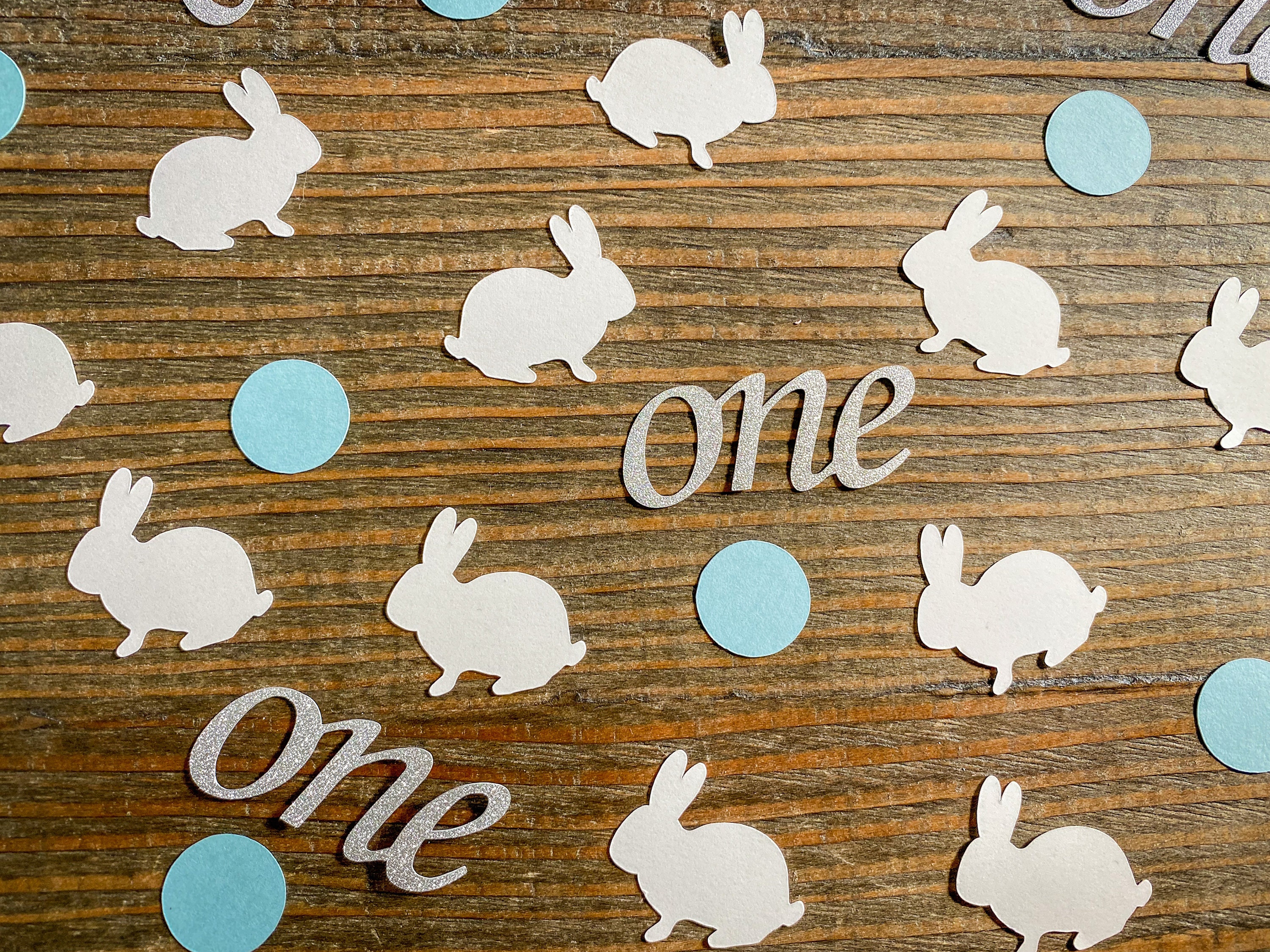 This listing is for 100 pieces of confetti! It includes 20 silver glitter "one" pieces, 40 white bunny pieces, and 40 blue circle pieces. The "one" pieces are made from premium silver glitter cardstock that is white on the reverse side and measure approximately 2 inches in length. The bunnies measure 1.25 inches and the circles measure .75 inches.