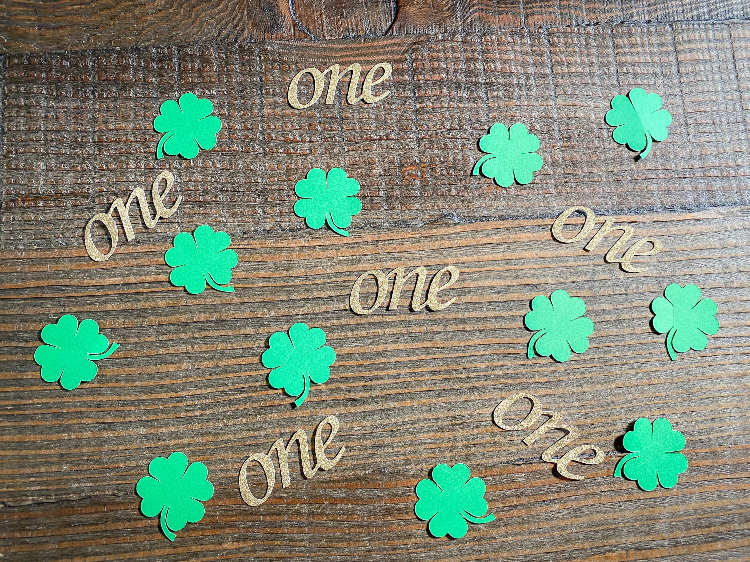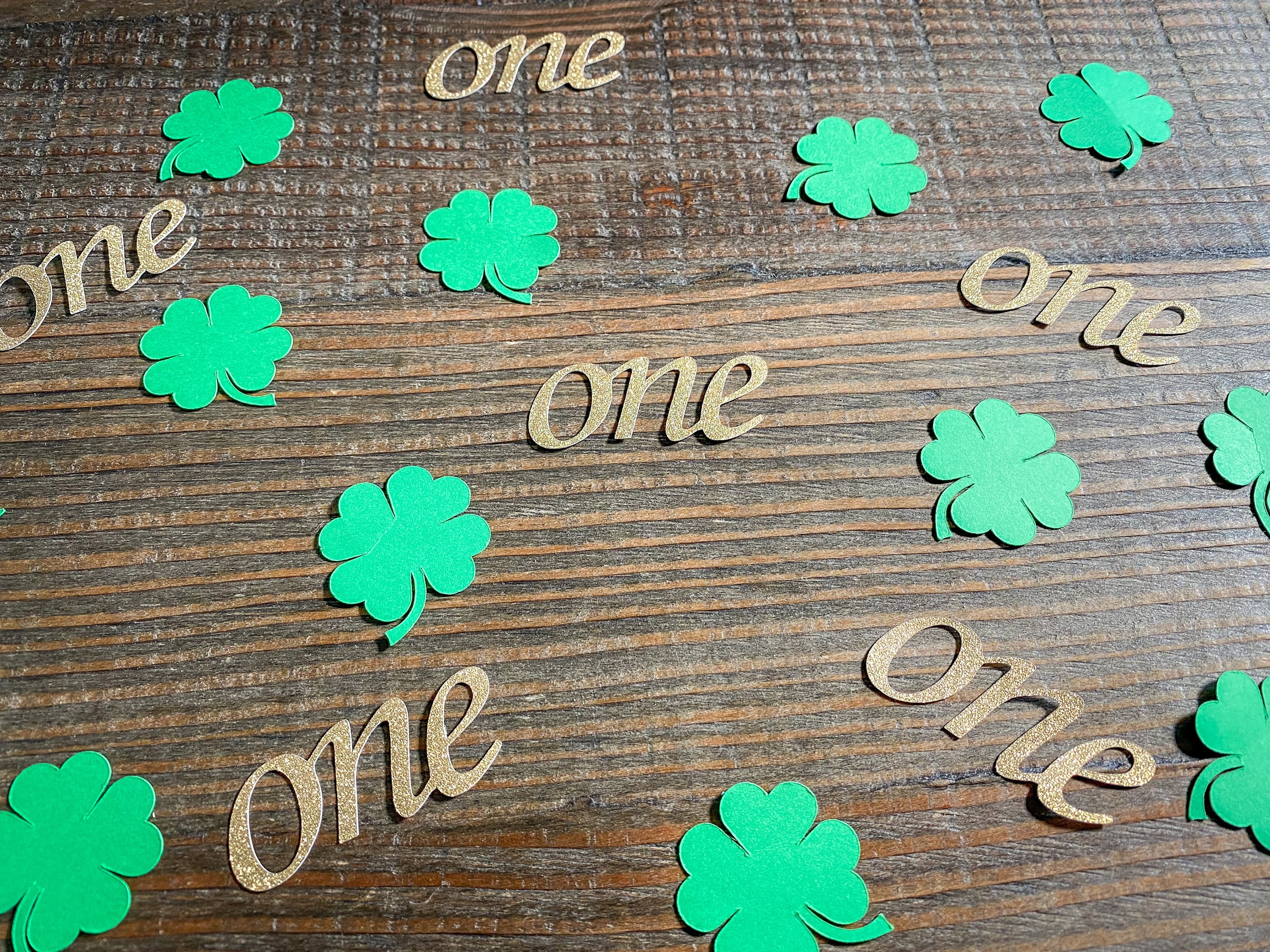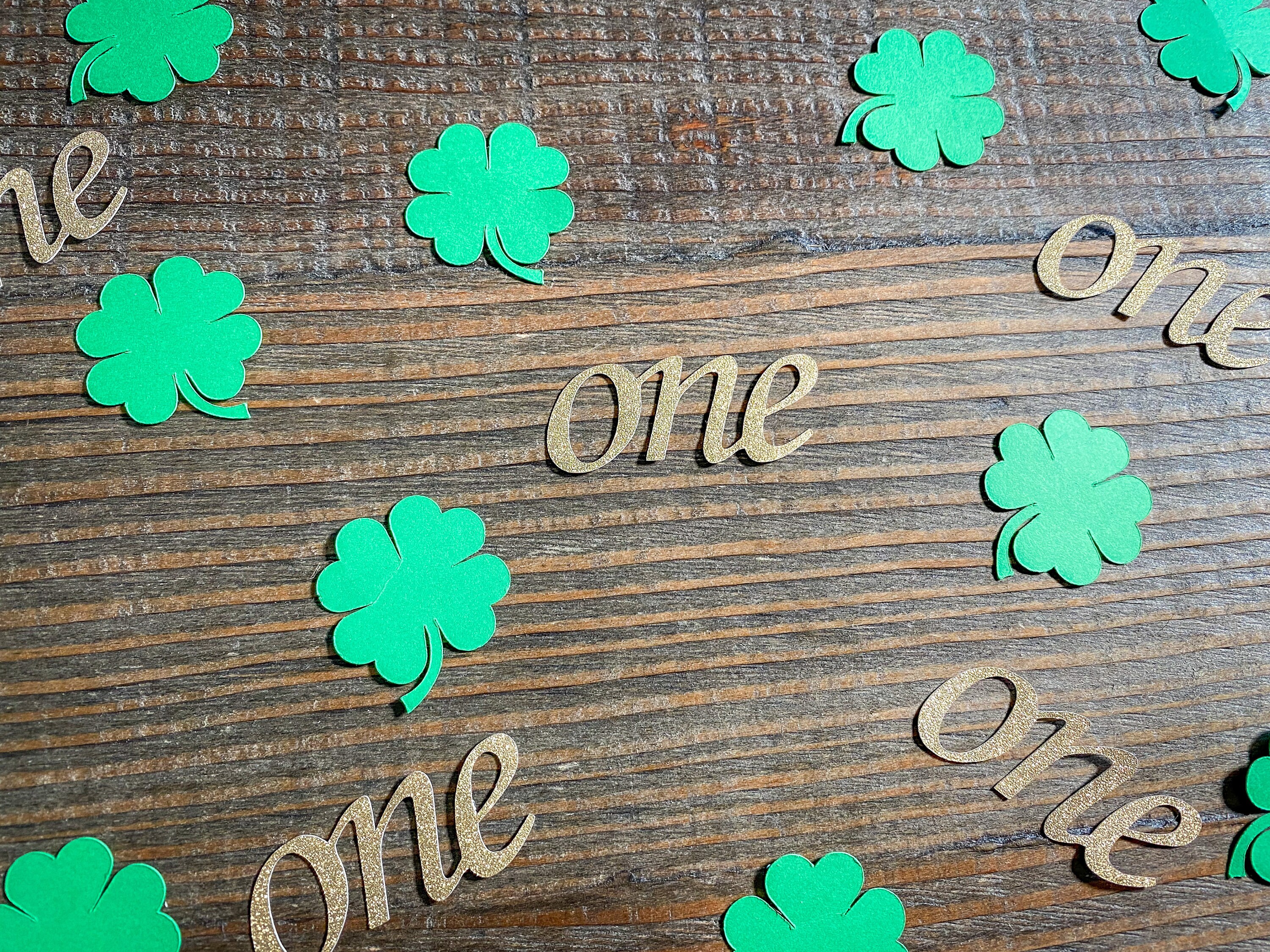 This listing is for 100 pieces of confetti! It includes 25 pieces of gold glitter one confetti that is white on the reverse side and 75 pieces of green shamrock confetti. The "one" pieces measure approximately 2 inches in length and the shamrock pieces measure approximately 1.25 inches.