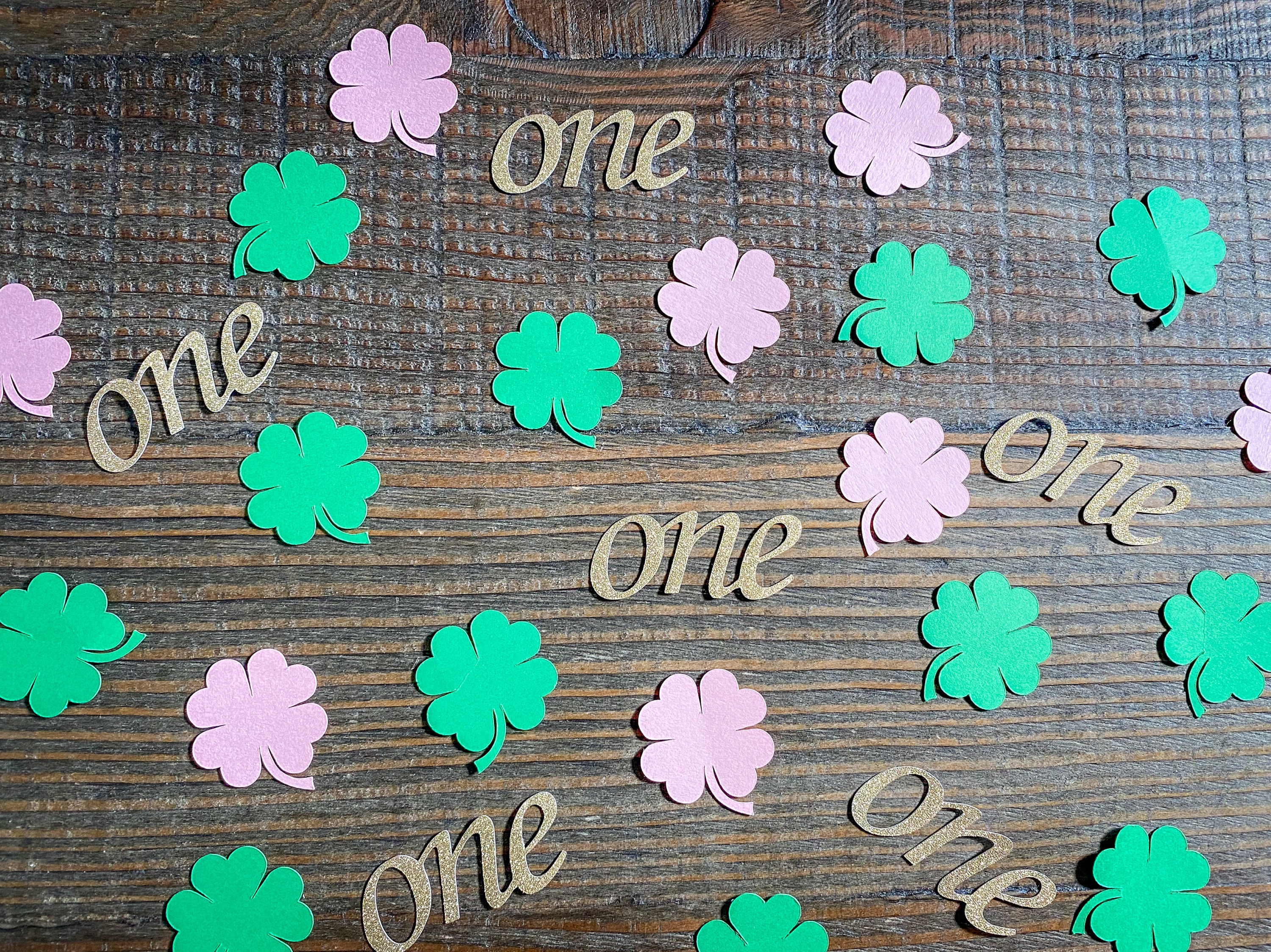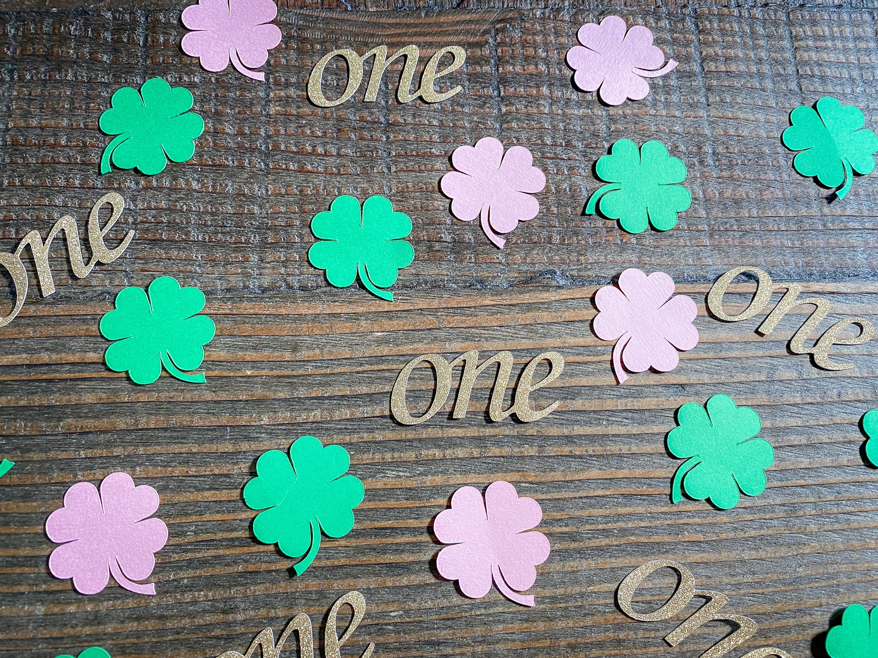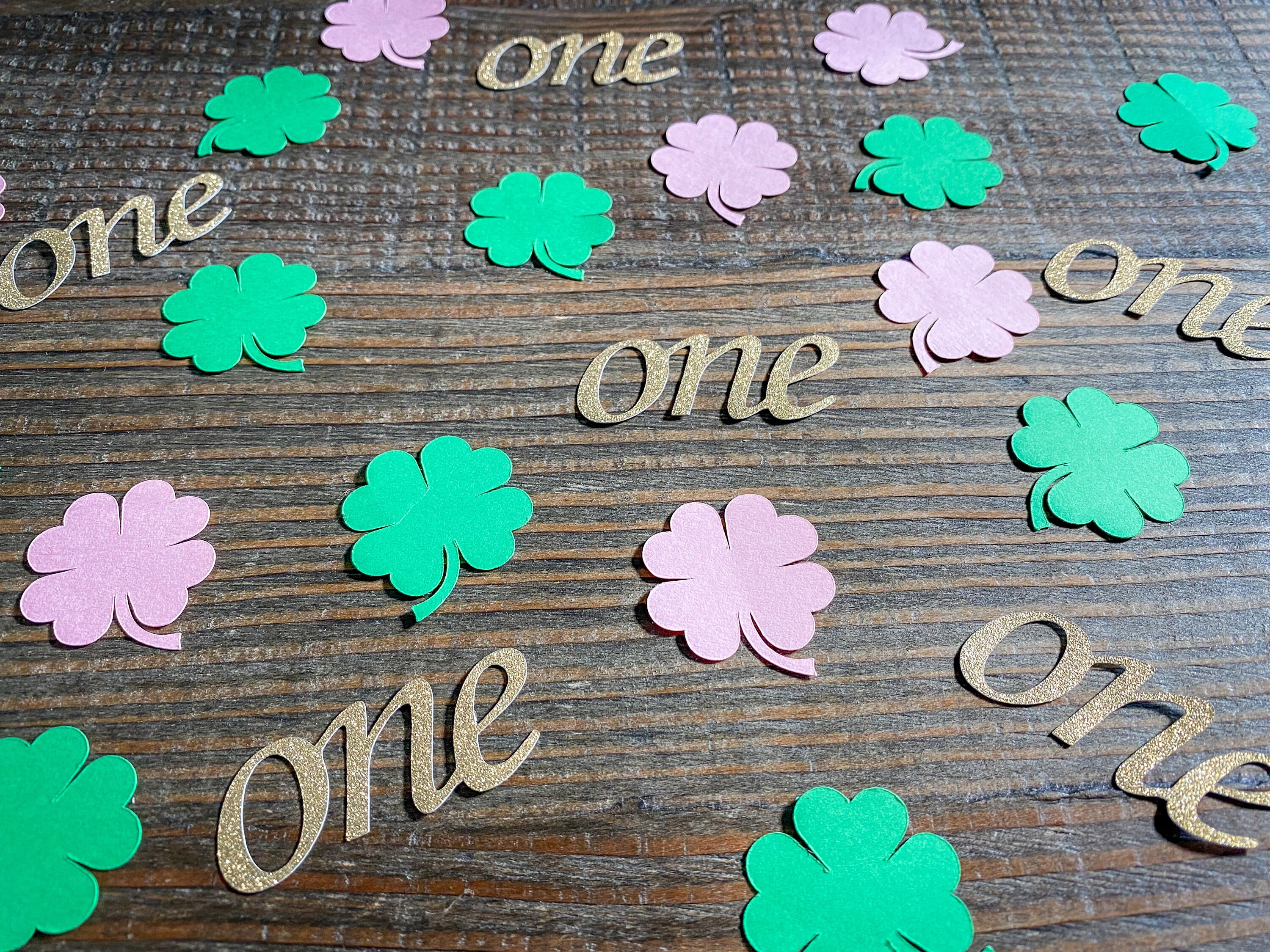 This listing is for 100 pieces of confetti! It includes 25 pieces of glitter gold "one" confetti and 75 pieces of a mix of green and light pink shamrocks. The "one" pieces are made from glitter gold cardstock and are white on the reverse side and measure approximately 2 inches in length. The shamrocks measure approximately 1.25 inches.