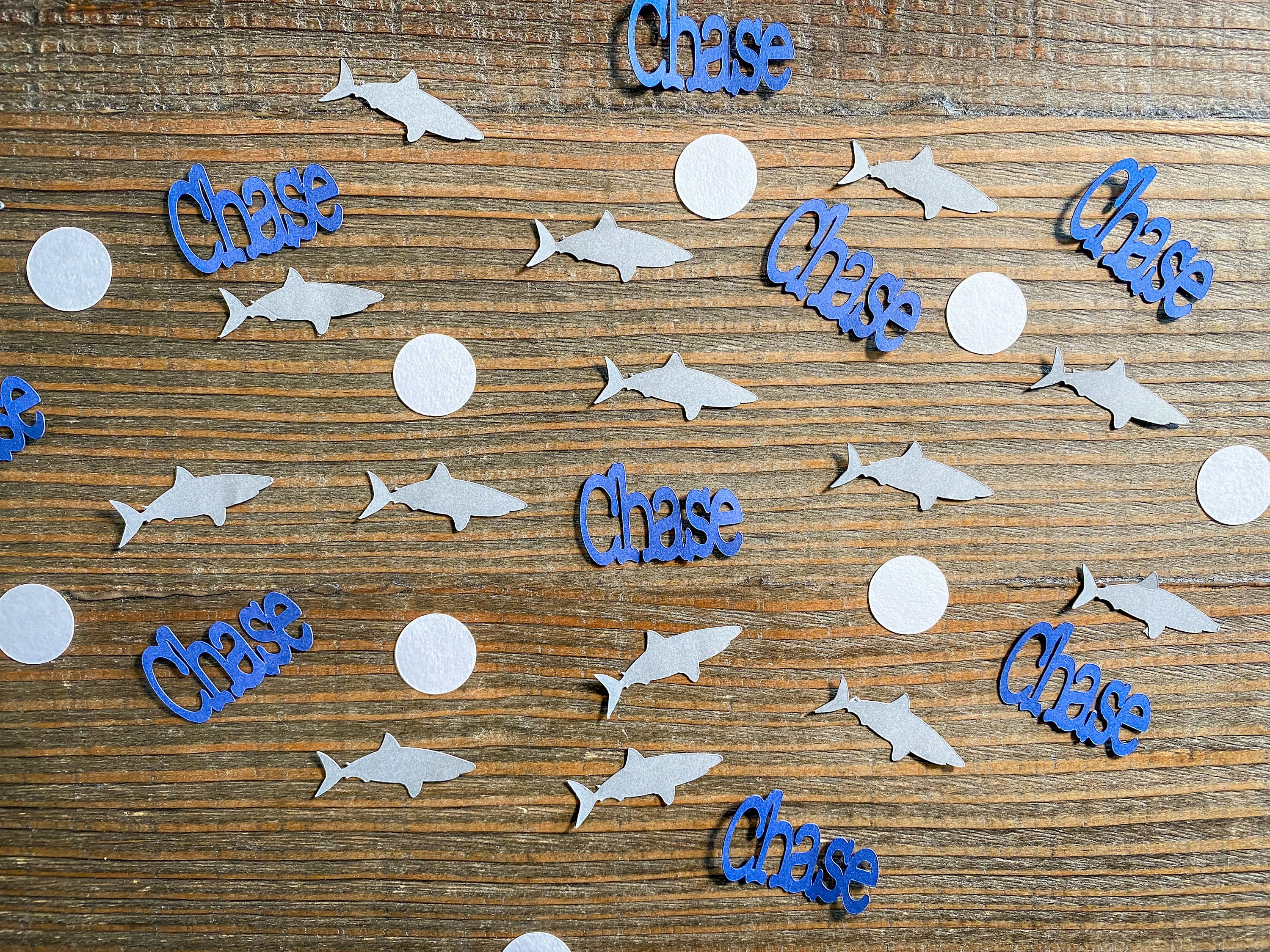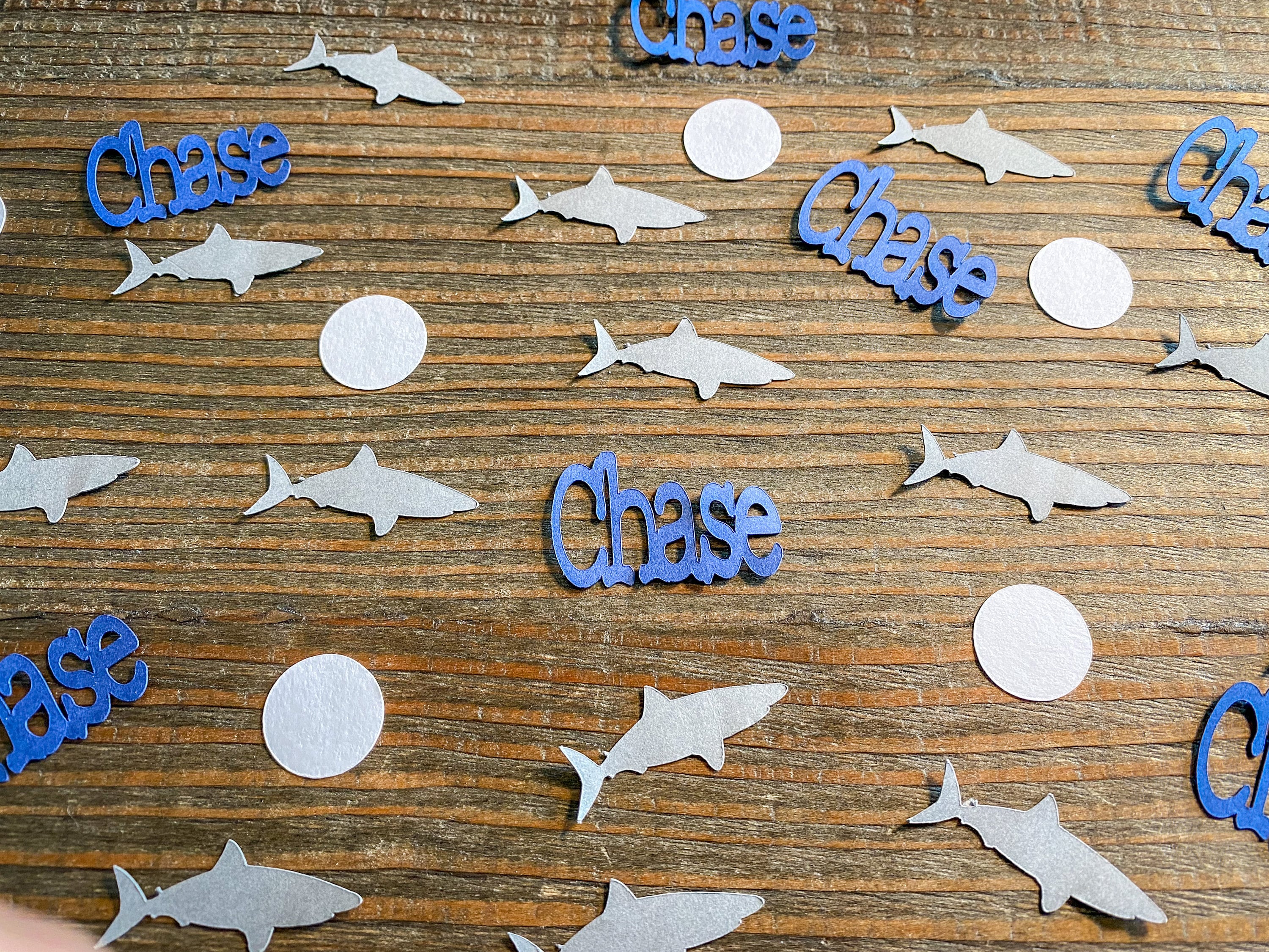 If you are hosting a shark themed birthday party or baby shower then this personalized name confetti is the perfect addition to your party decor!