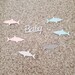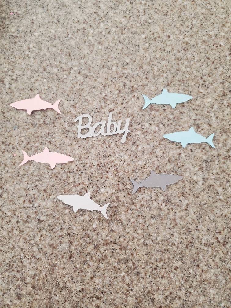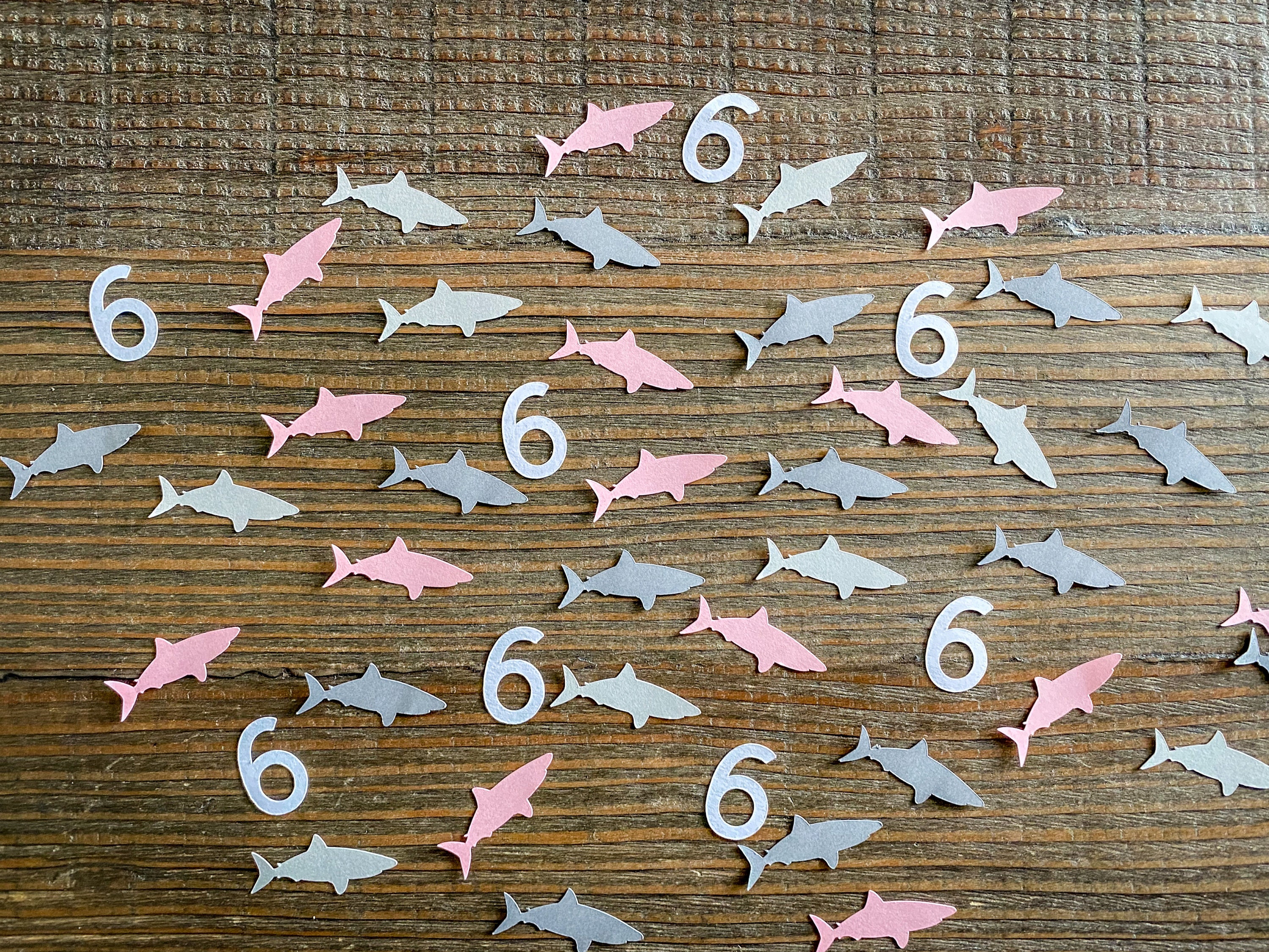 This listing is for 100 pieces of confetti! It includes 25 pieces of white age confetti, 25 pieces of dark gray shark confetti, 25 pieces of light gray shark confetti, and 25 pieces of pink shark confetti. The confetti is made from premium cardstock and measures 1-1.25 inches in length.