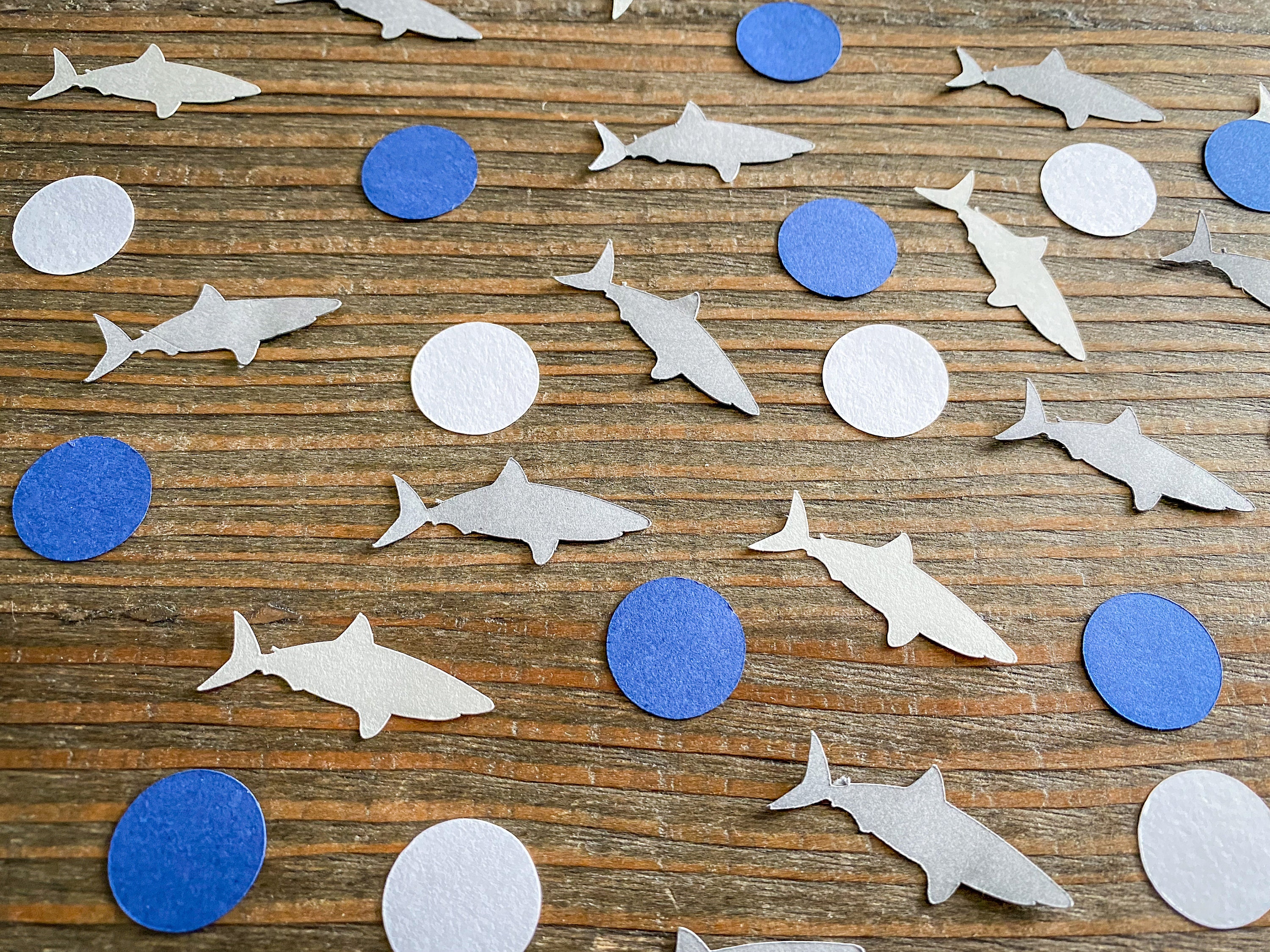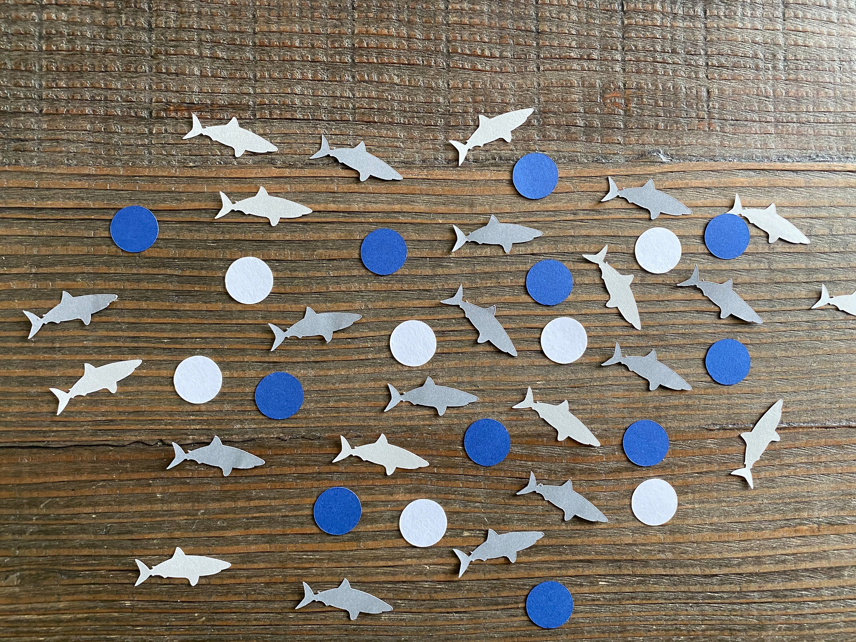 This listing is for 100 pieces of confetti! It includes 25 pieces of dark gray shark confetti, 25 pieces of light gray shark confetti, 25 pieces of navy blue circles, and 25 pieces of white circles. All of the confetti is made from premium 65 pound cardstock. The sharks measure approximately 1.25 inches in length and the circles are .75 inches in diameter.